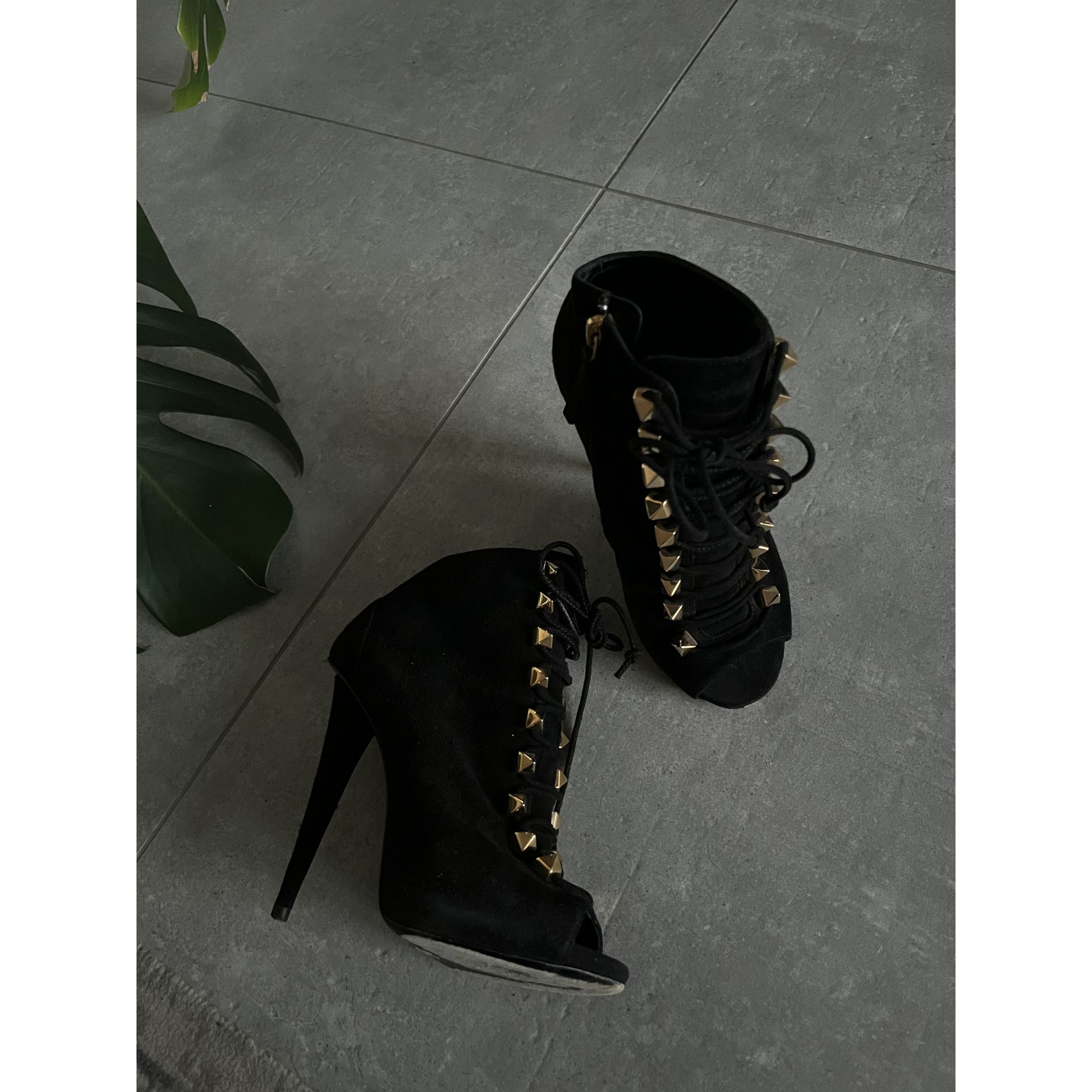 Oryginalne botki open toe Giuseppe Zanotti w rozmiarze 36. Sznurowane, wykończone złotymi ćwiekami. Szpilka 11,5cm i delikatna platforma 1cm. Wykonane z wysokogatunkowego zamszu w kolorze głębokiej czerni. Podeszwa również skórzana. Stan bardzo dobry. Proszę o przemyślane zakupy, ponieważ nie przyjmuję zwrotów.