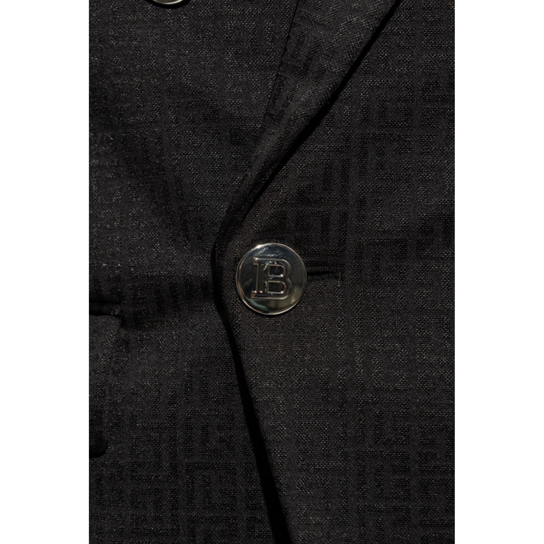 Taliowana marynarka z tkaniny elastycznej, żakardowej w wytłoczony logotyp marki. Srebrne guziki, w kolorze ciemnego granatu. Rozmiar z metki 48