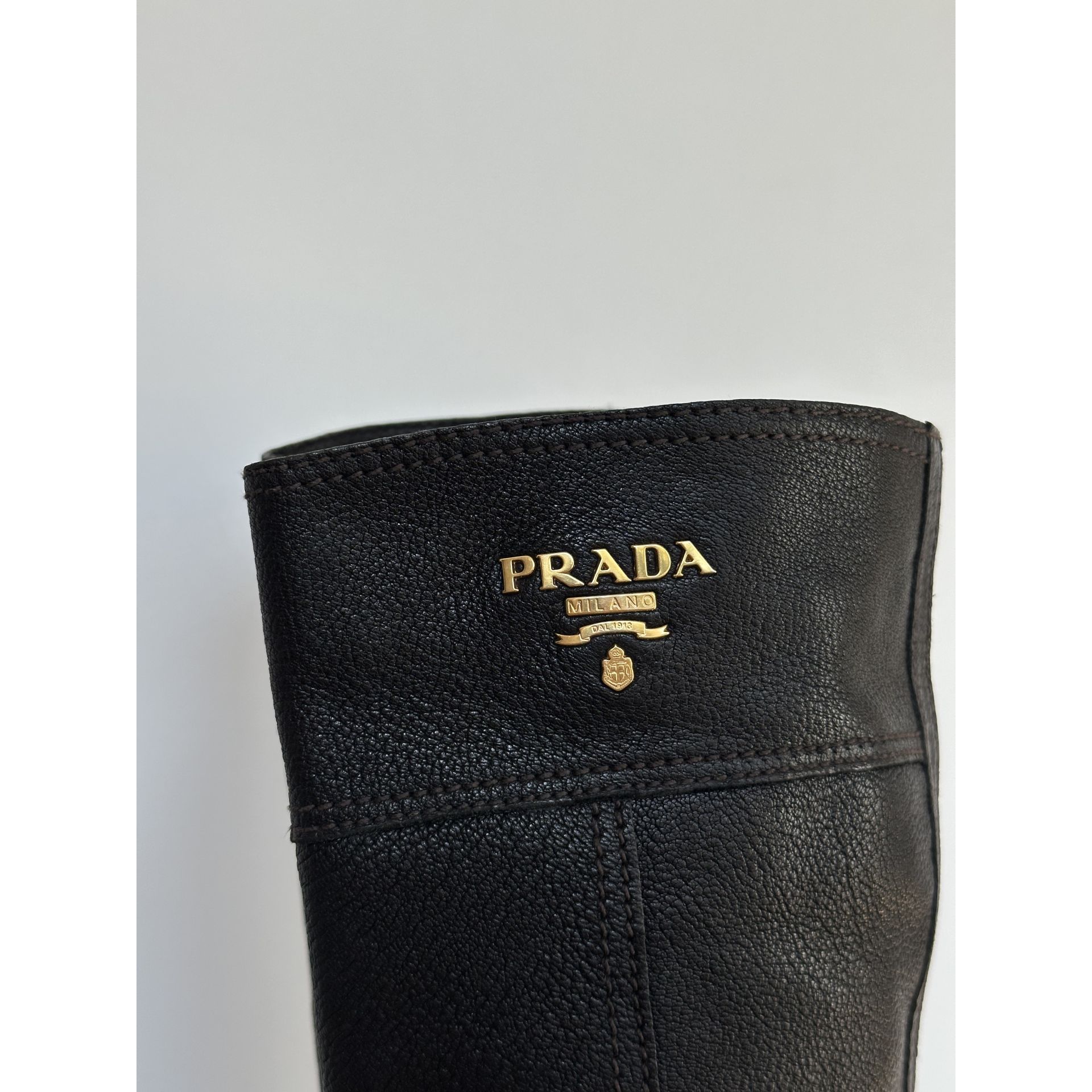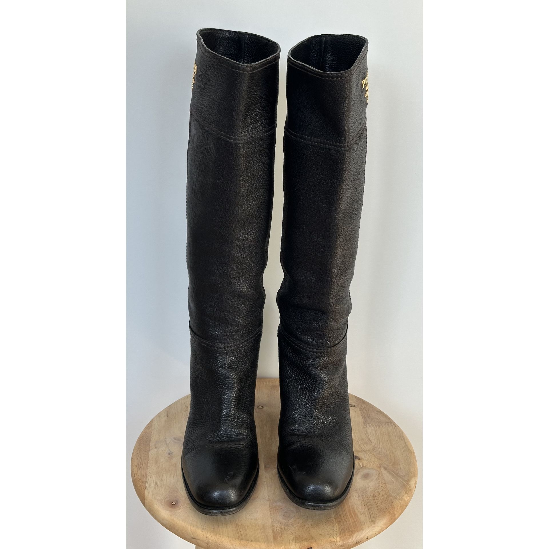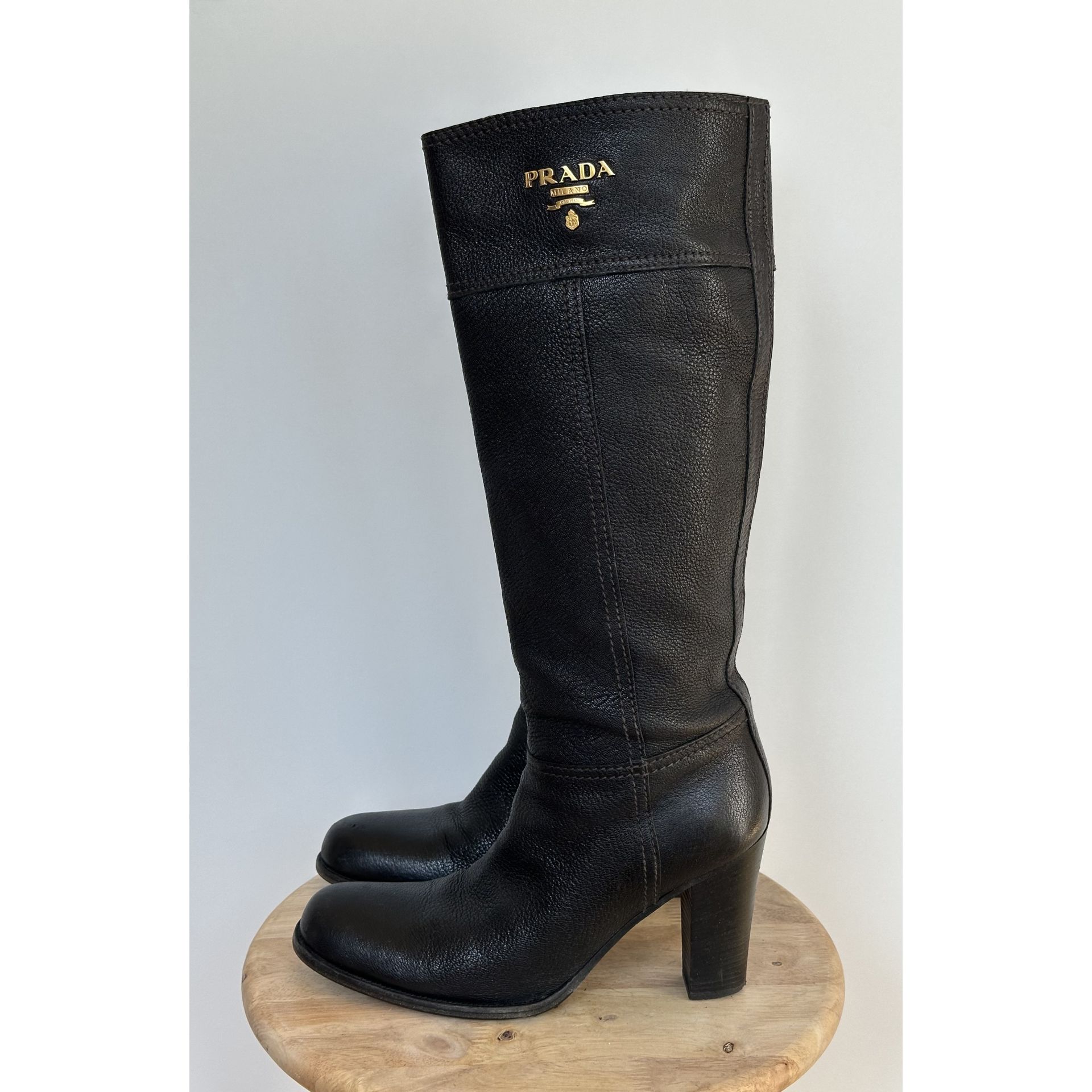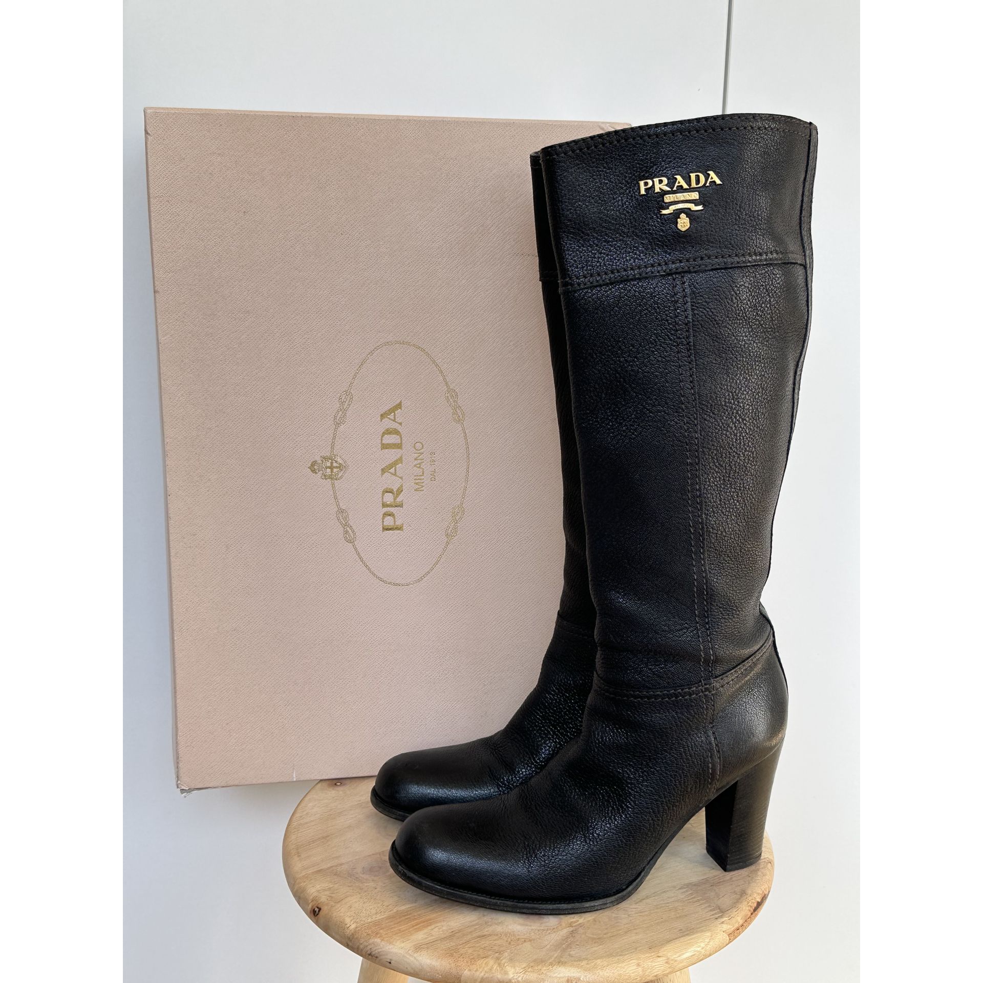 Kozaki do kolan Prada, wykonane z wysokiej jakości czarnej skóry, z eleganckim charakterystycznym złotym logo.