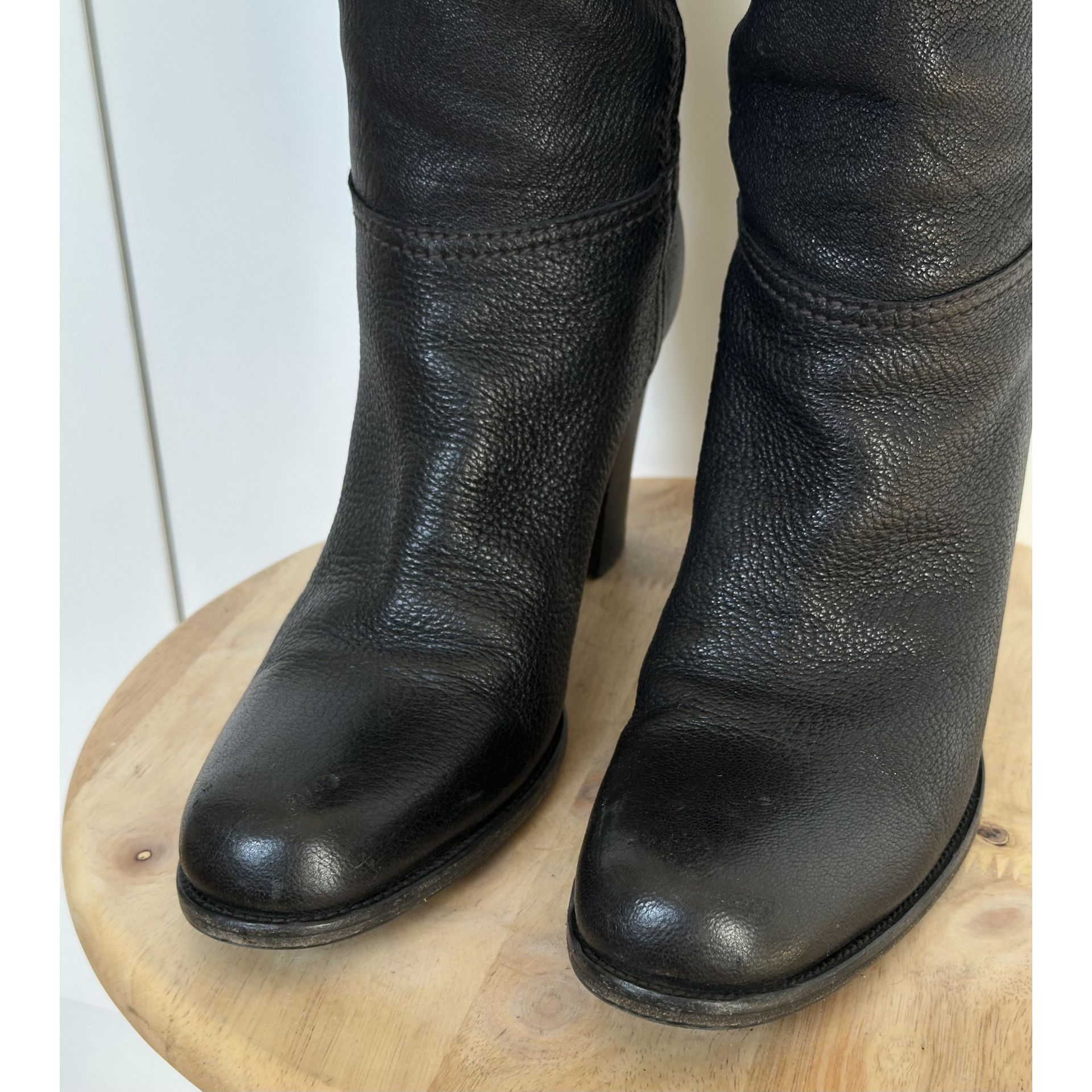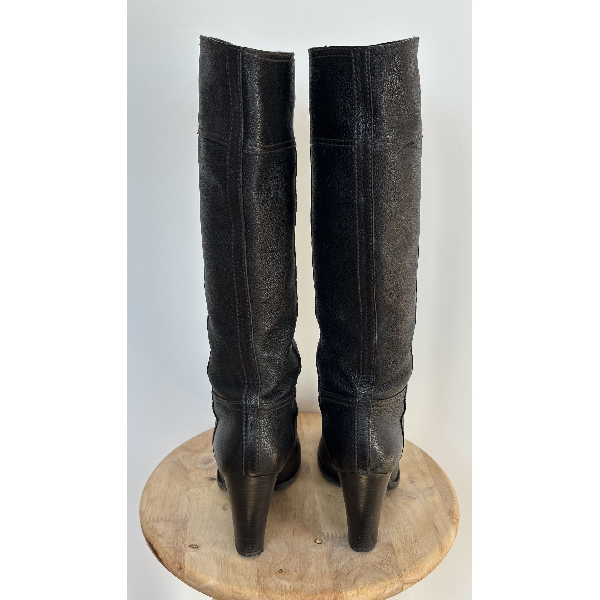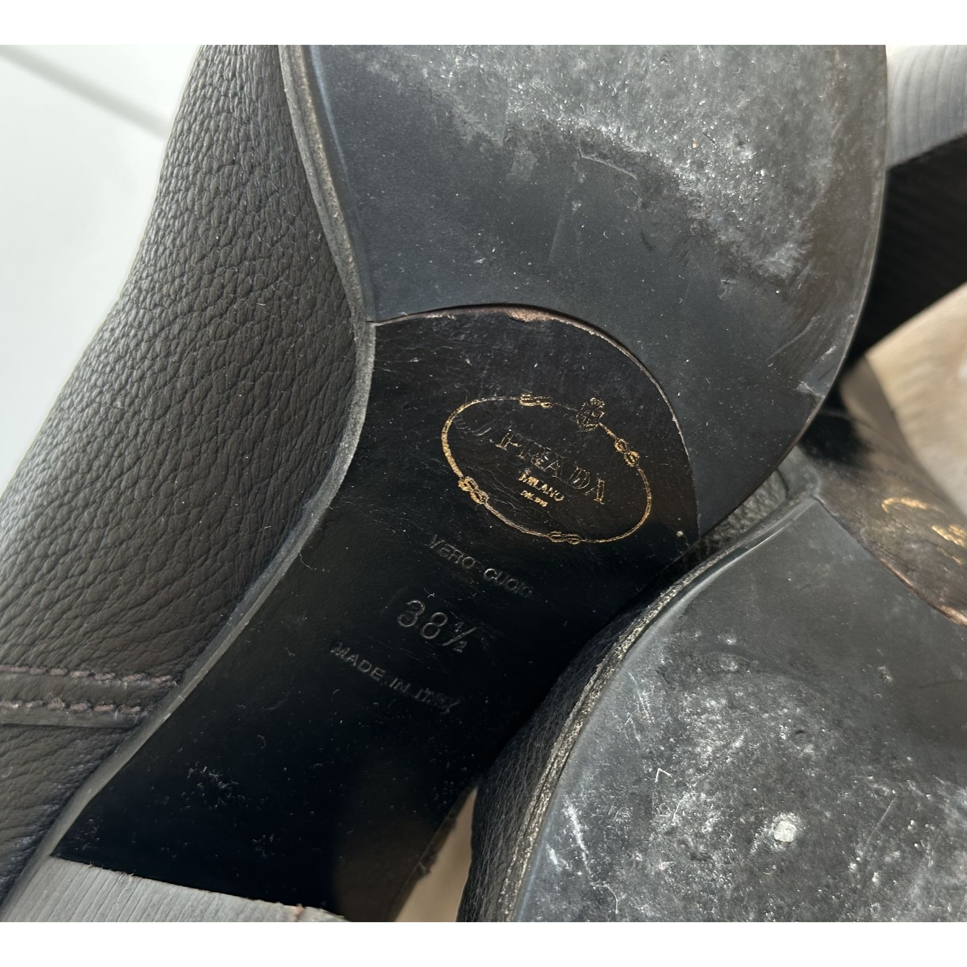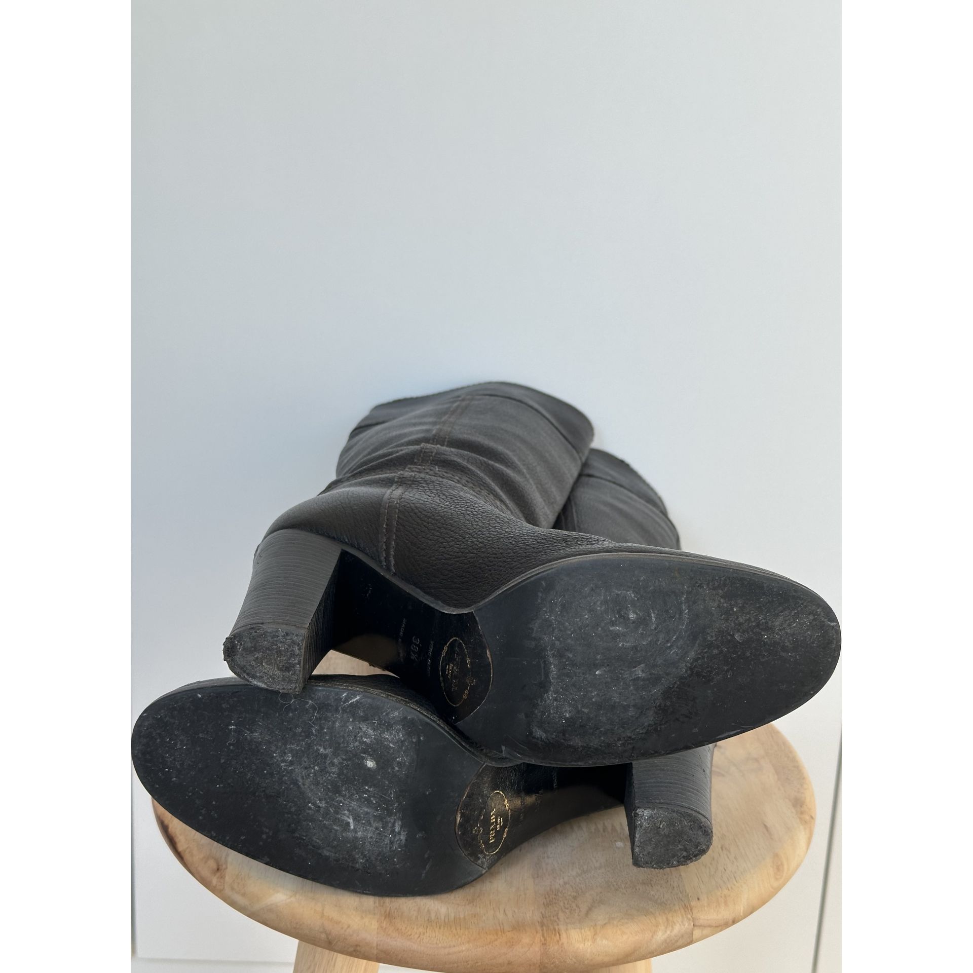 Kozaki do kolan Prada, wykonane z wysokiej jakości czarnej skóry, z eleganckim charakterystycznym złotym logo.