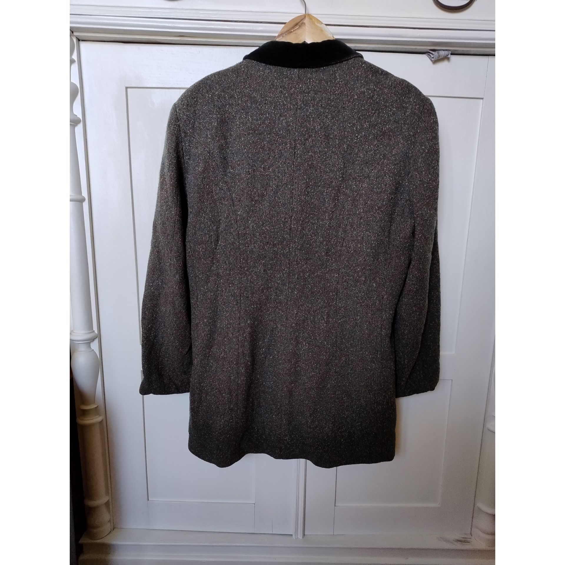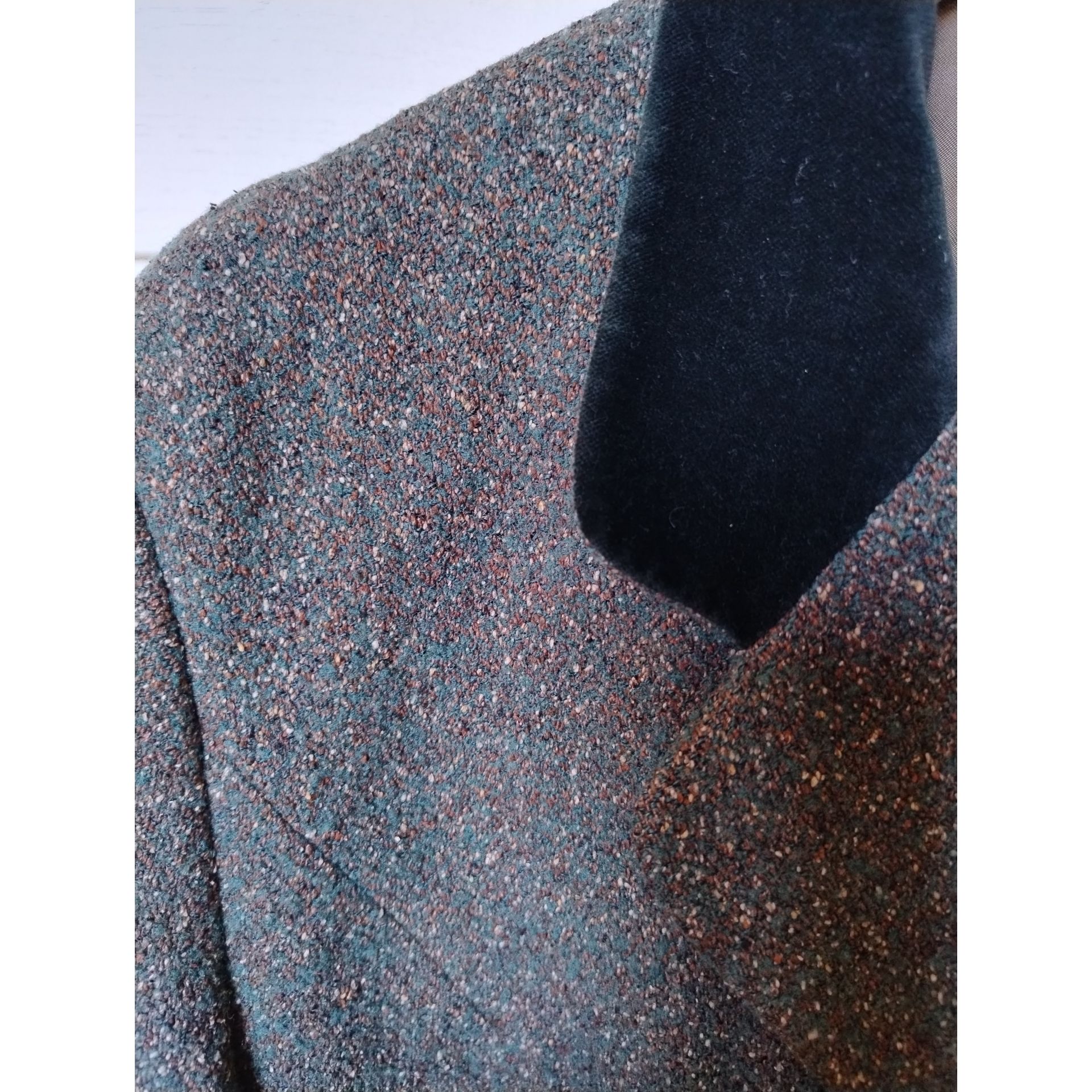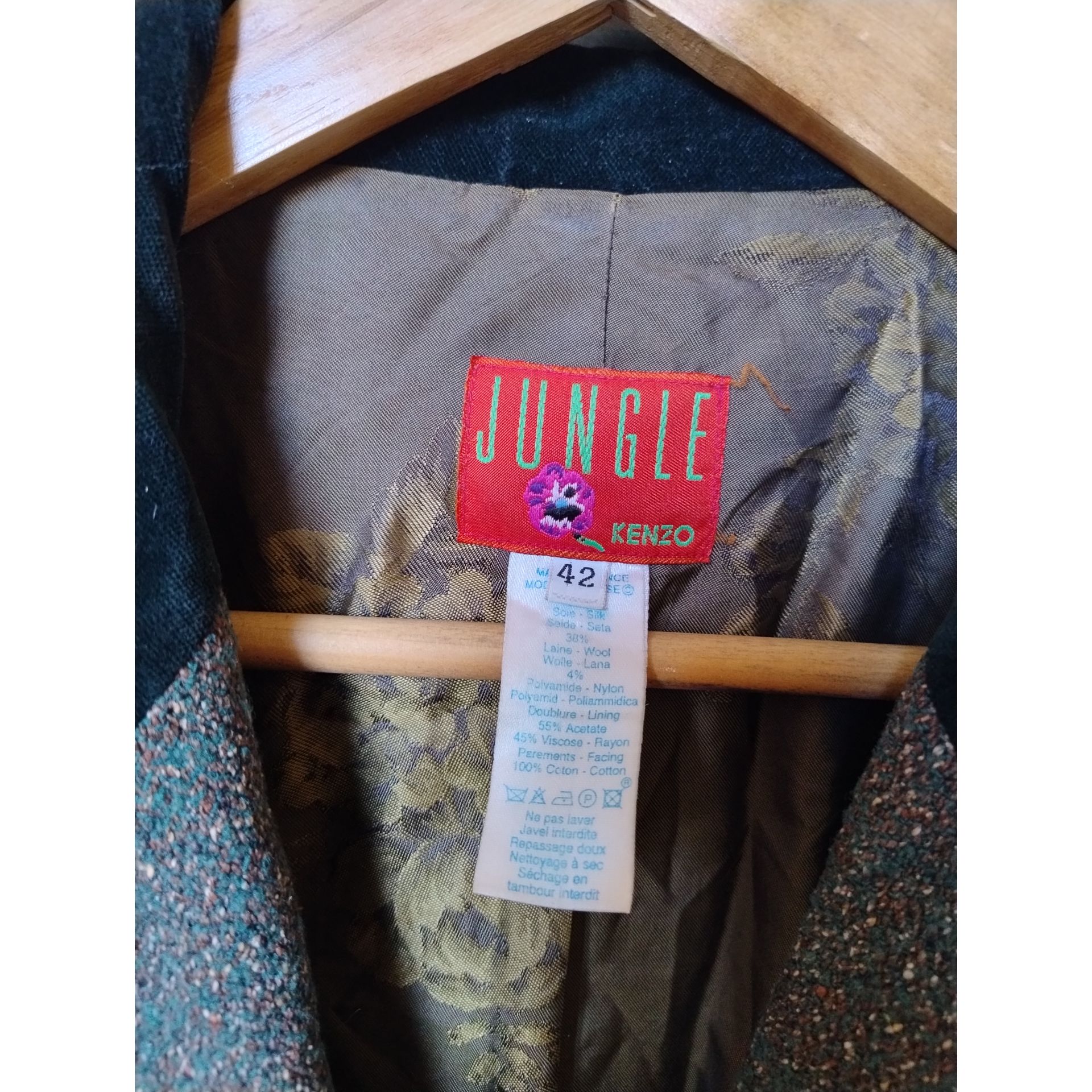 Marynarka wełna jedwab luksusowej marki Kenzo pięknie zachowany model vintage kolor zielony nakrapiany taliowana rozmiar L długość 79 cm szerokość 50 cm. Proszę o przemyślane zakupy, ponieważ nie przyjmuję zwrotów.