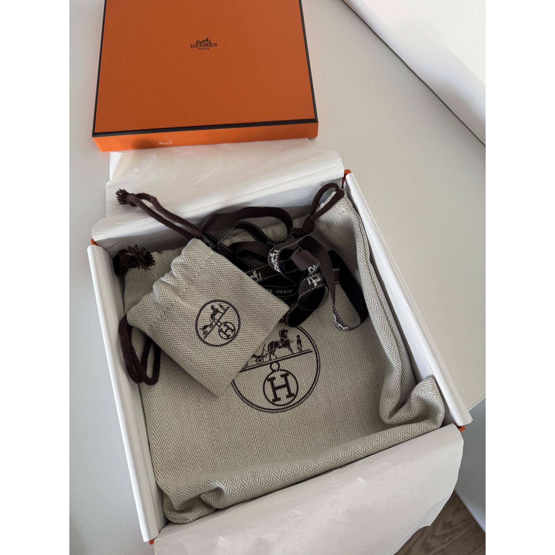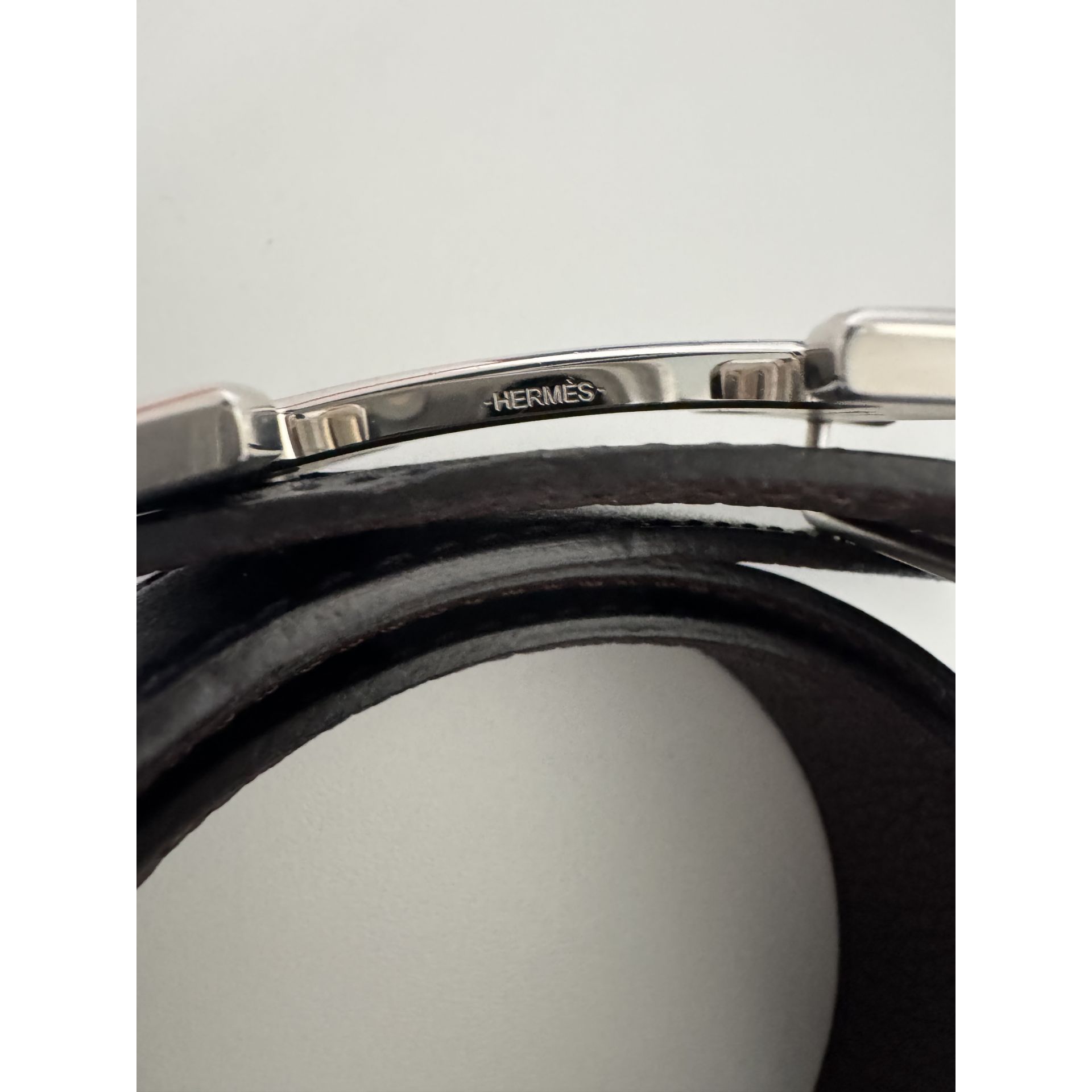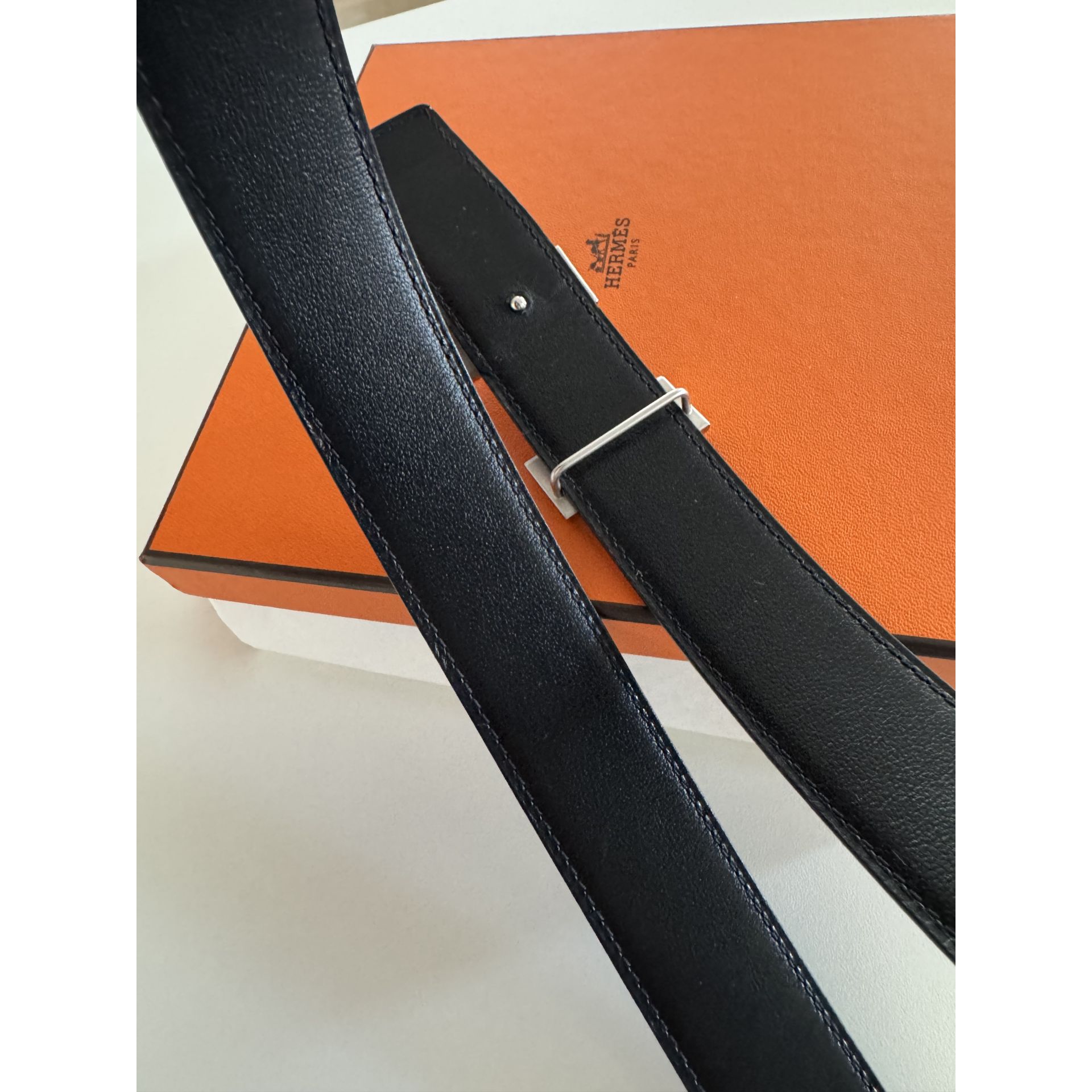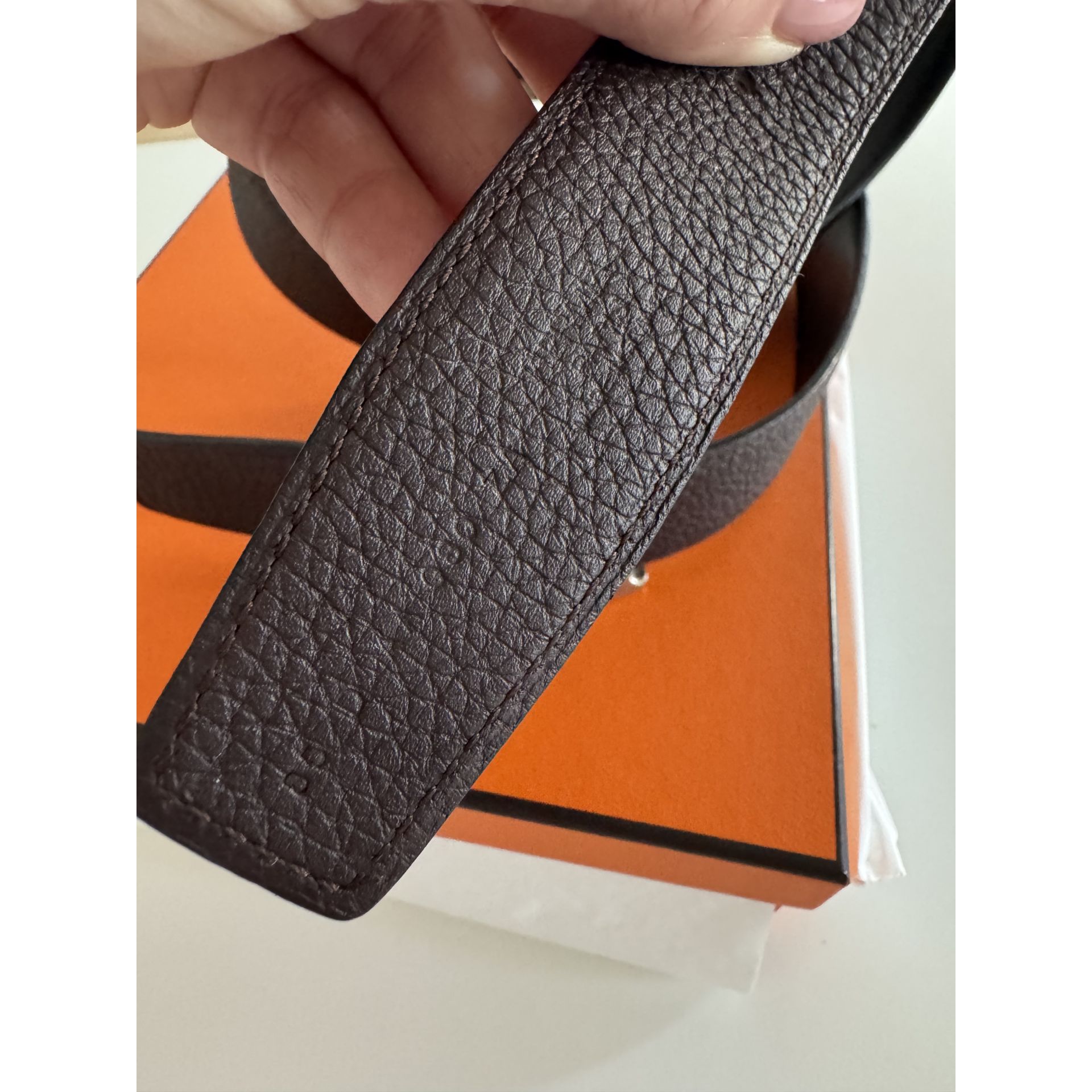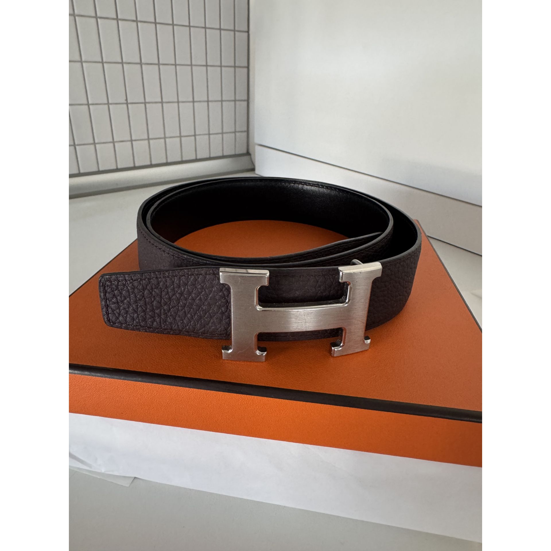 Dwustronny pasek Hermes - czekoladowa matowa skóra togo w połączeniu z czarną błyszcząca skóra cielęca, pozwala dopasować pasek zarówno do ubrań casualowych jak i eleganckich. Rozmiar 80. Klamra matowa w kolorze srebrnym. Używany bardzo sporadycznie. Posiadam rachunek, pudełko, worki przeciwkurzowe. Kupiony w butiku Hermes Warszawa. Proszę o przemyślane zakupy, ponieważ nie przyjmuję zwrotów.