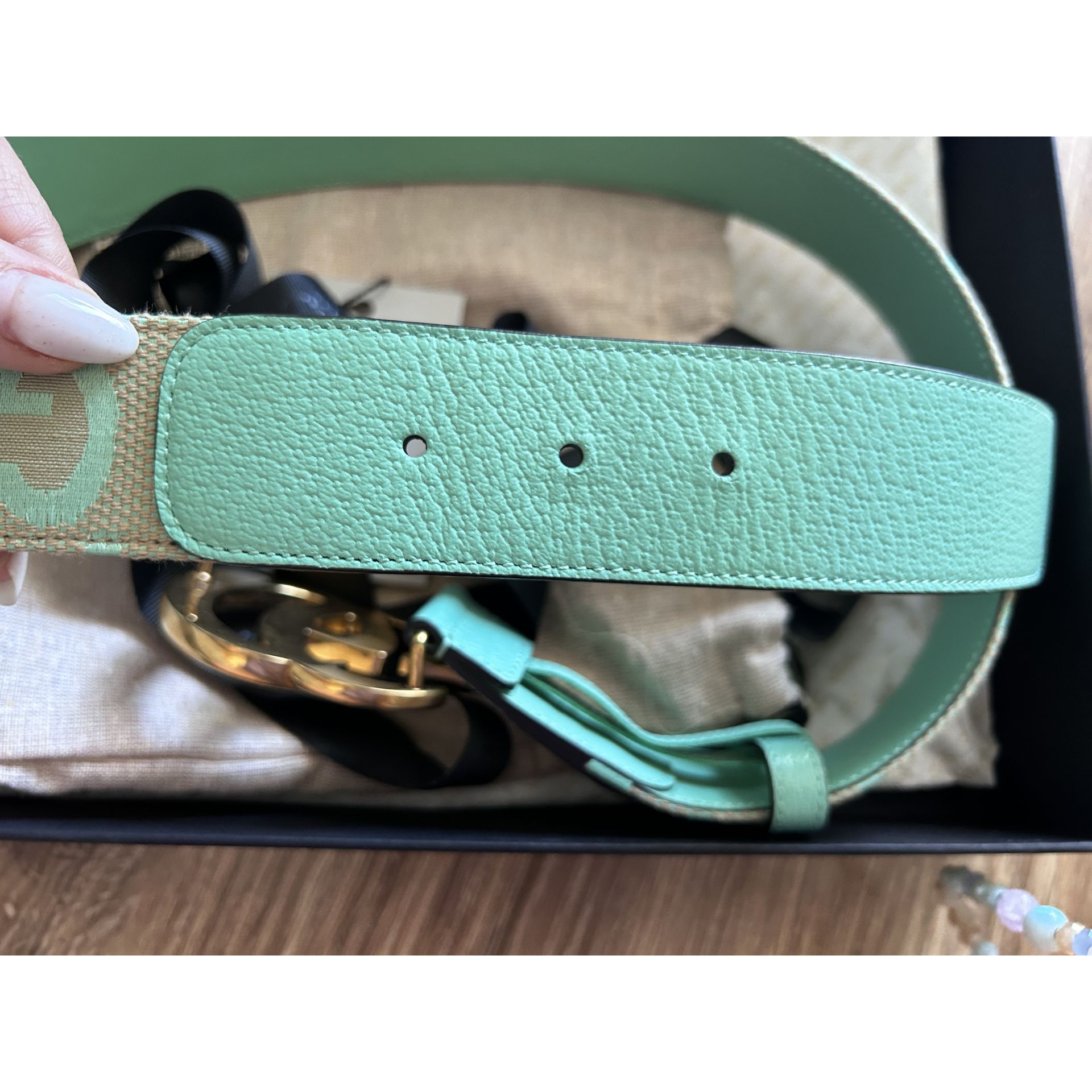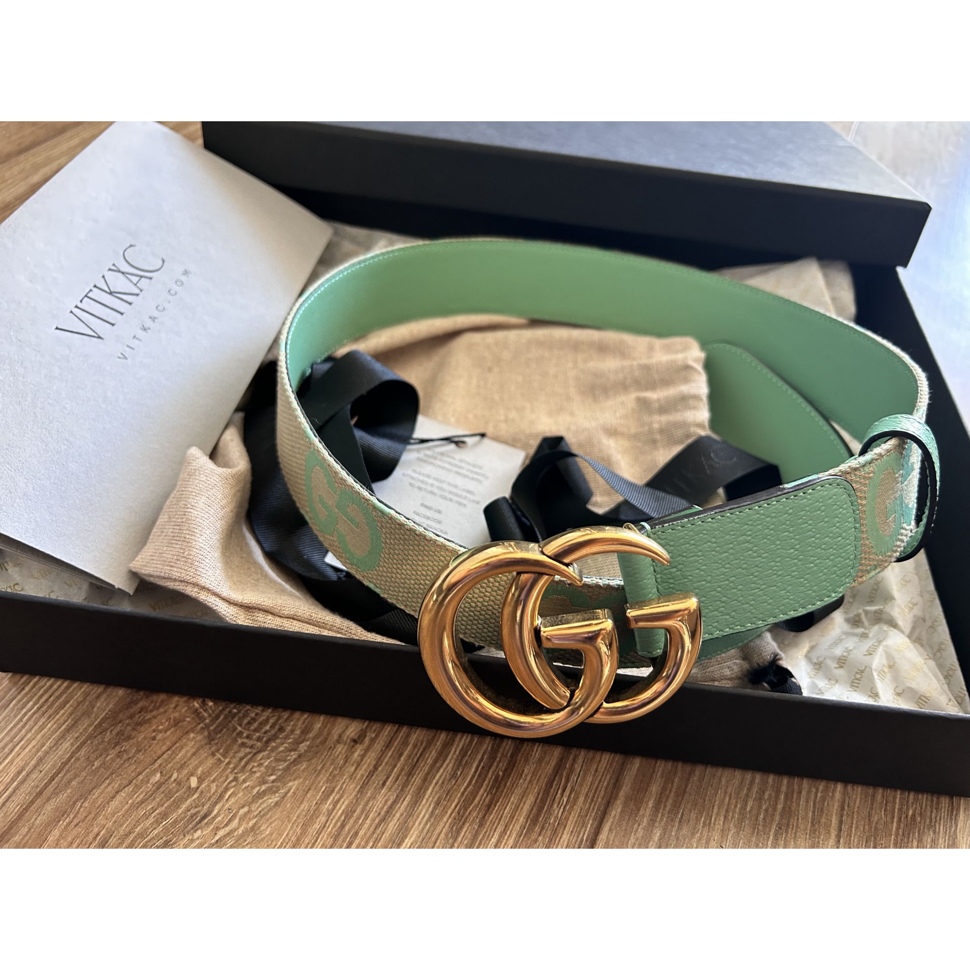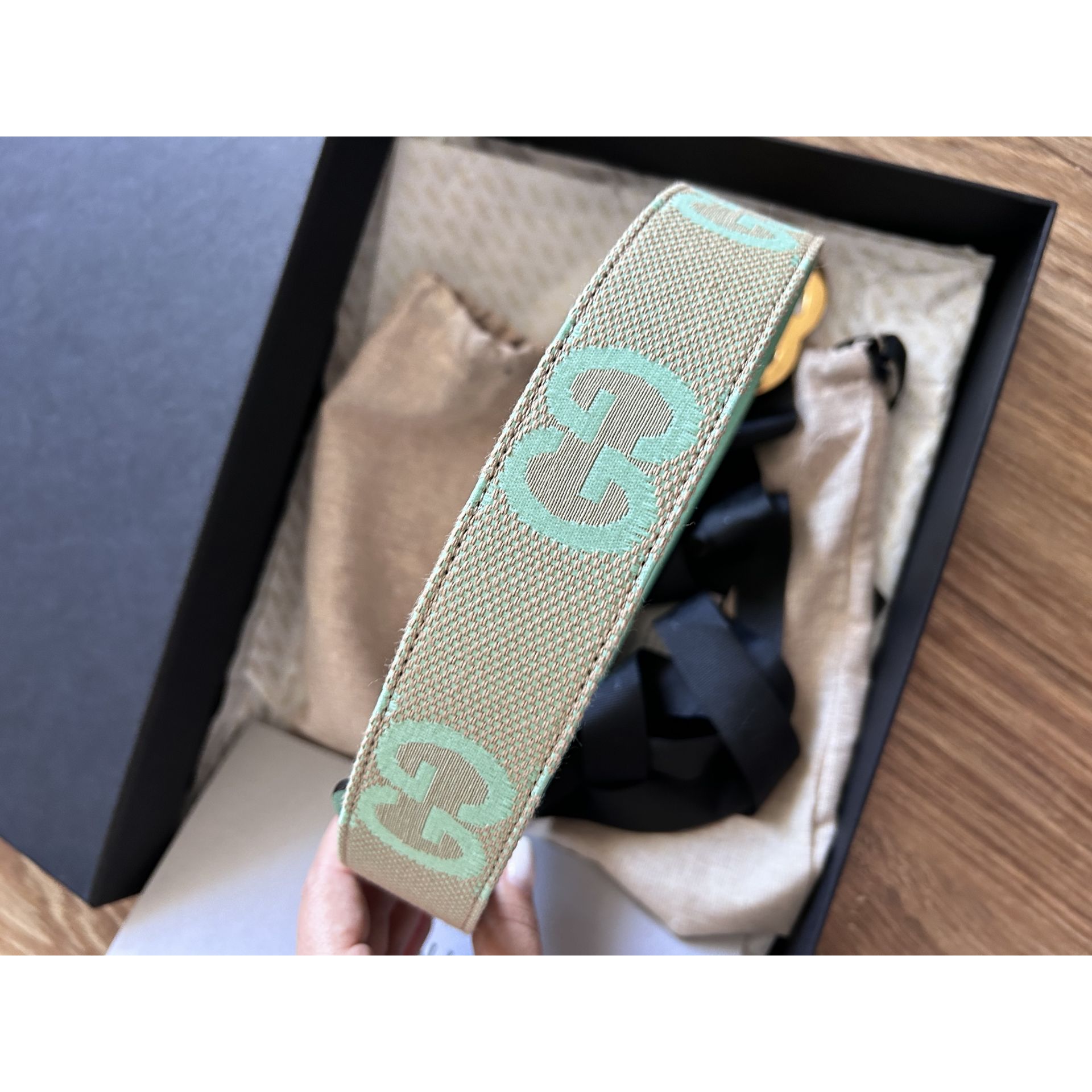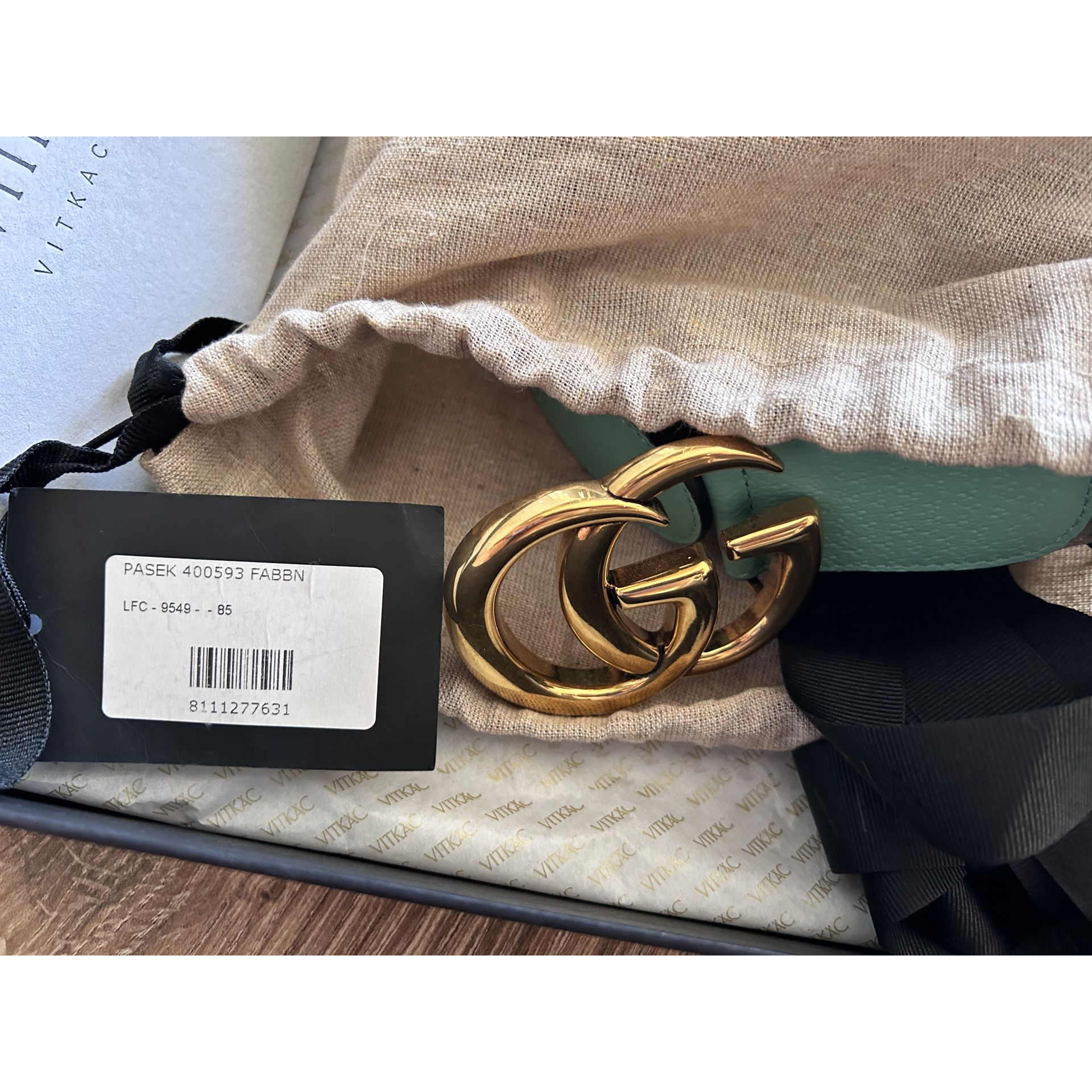 Beżowo jasno zielony pasek Gucci rozmiar 85 Wykonany z materiału i skóry cielęcej. Klamra Logo GG postarzałe złoto. Stan jak nowy miałam go na sobie 2 razy. Kupiony w Vitkacu w grudniu. Pełen komplet może być na prezent. Proszę o przemyślane zakupy, ponieważ nie przyjmuję zwrotów