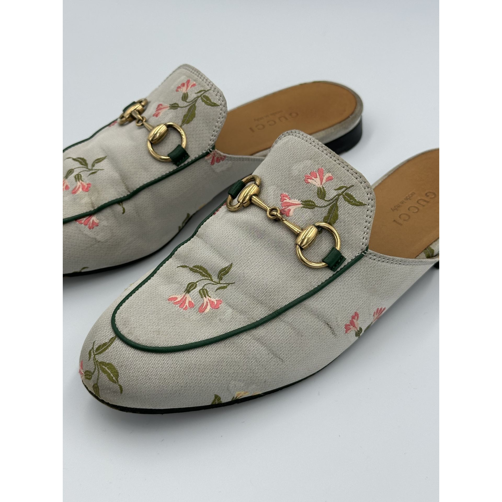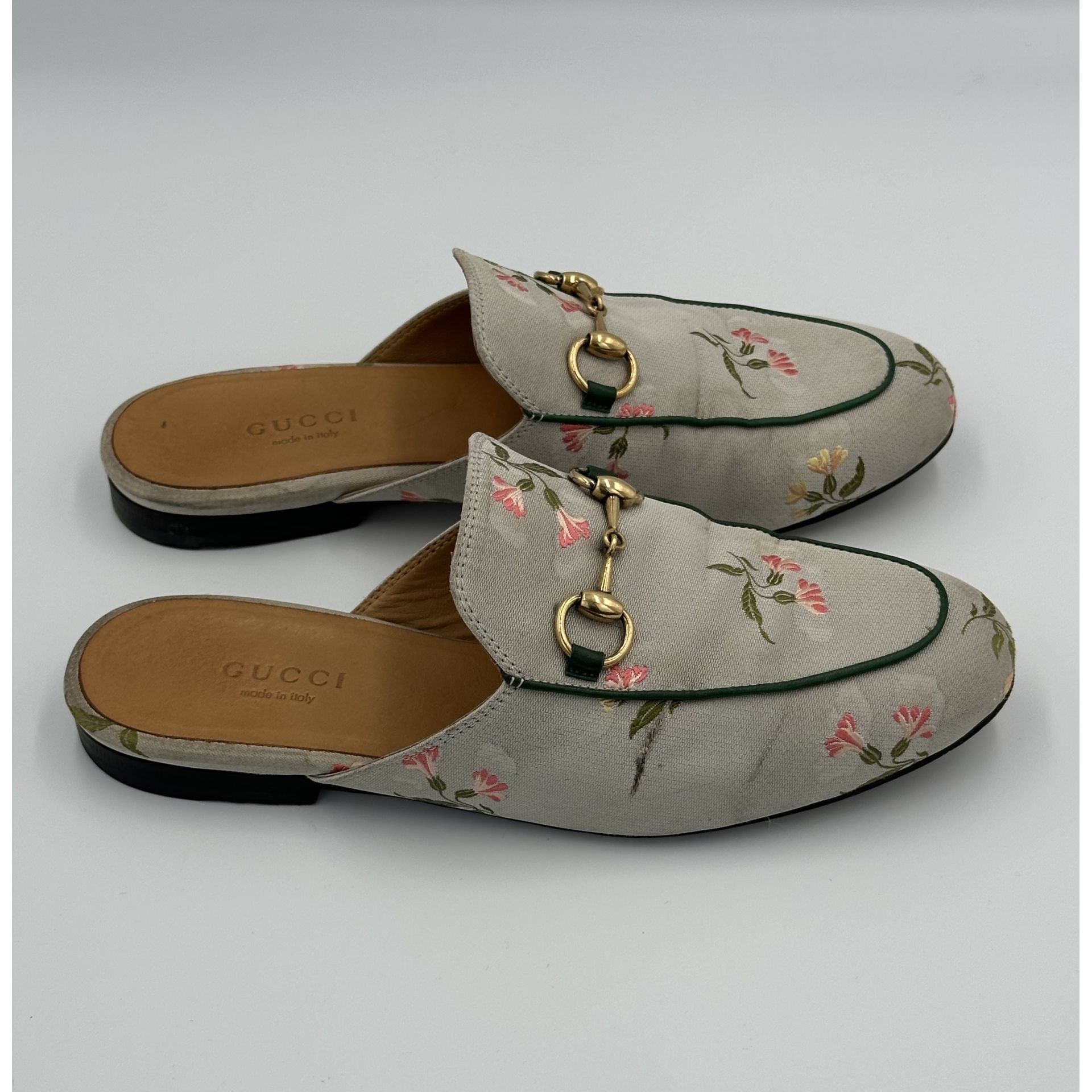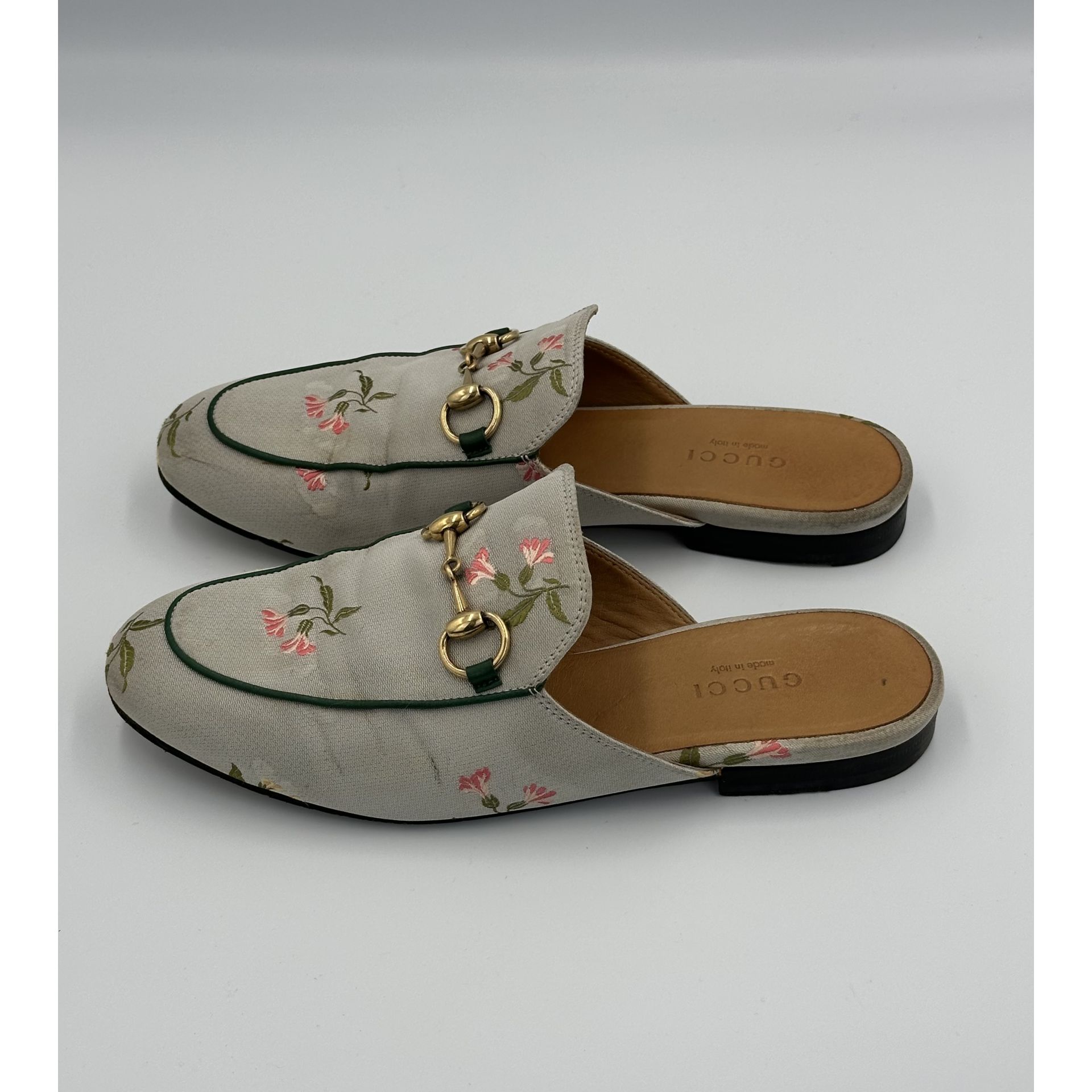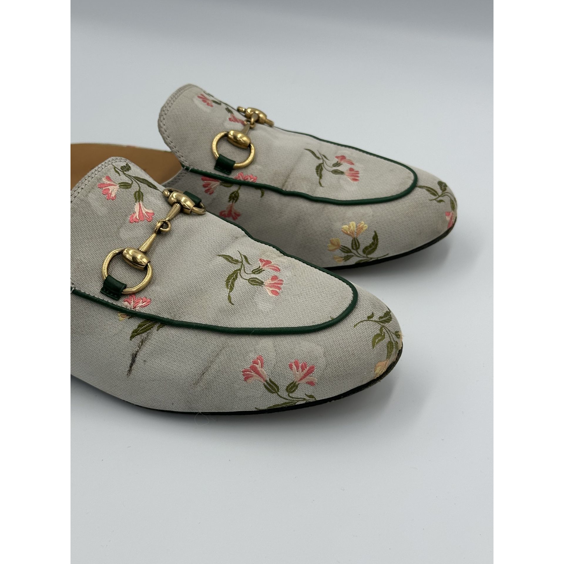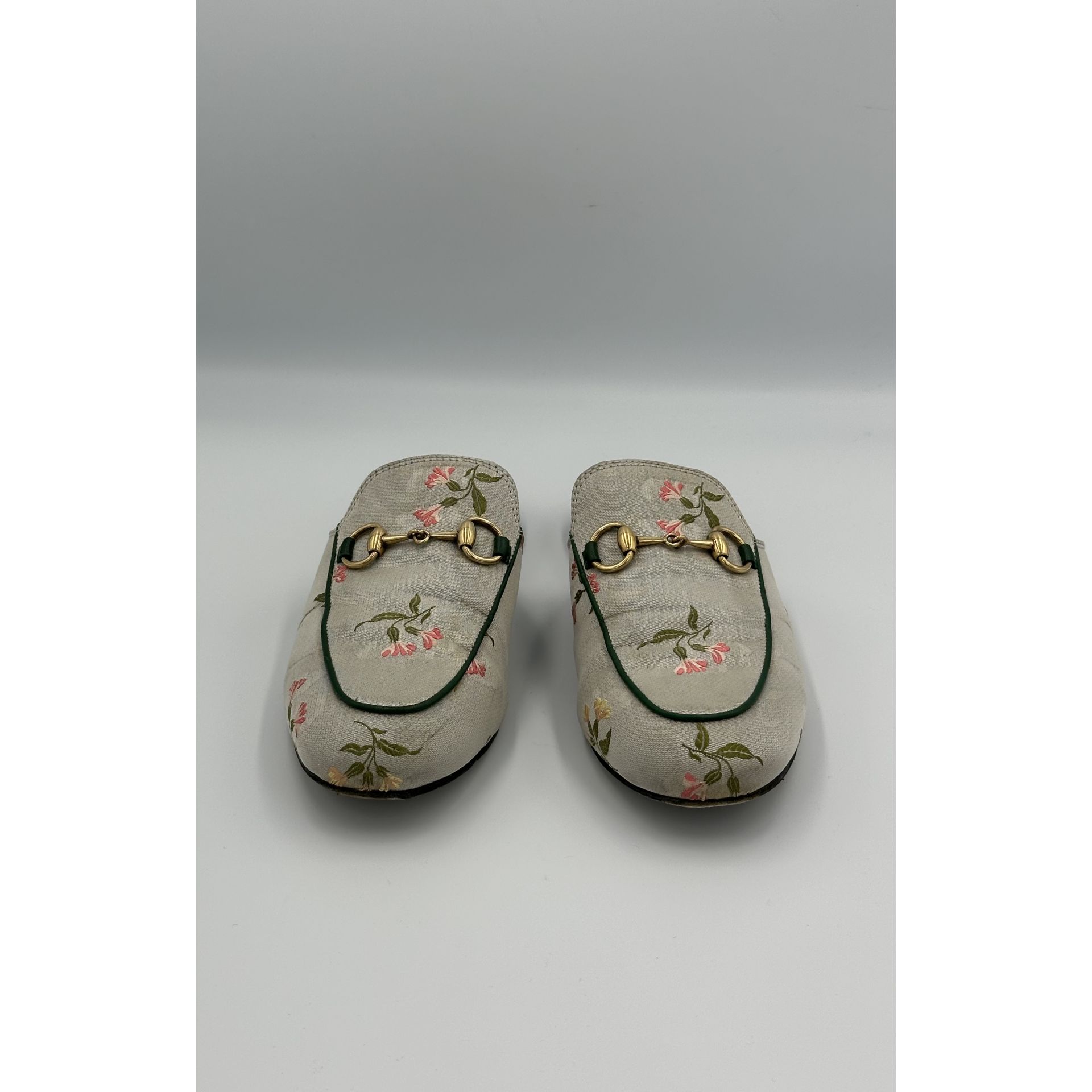 Gucci Princetown – szare klapki z tkaniny w kwiaty, z metalową sprzączką horsebit