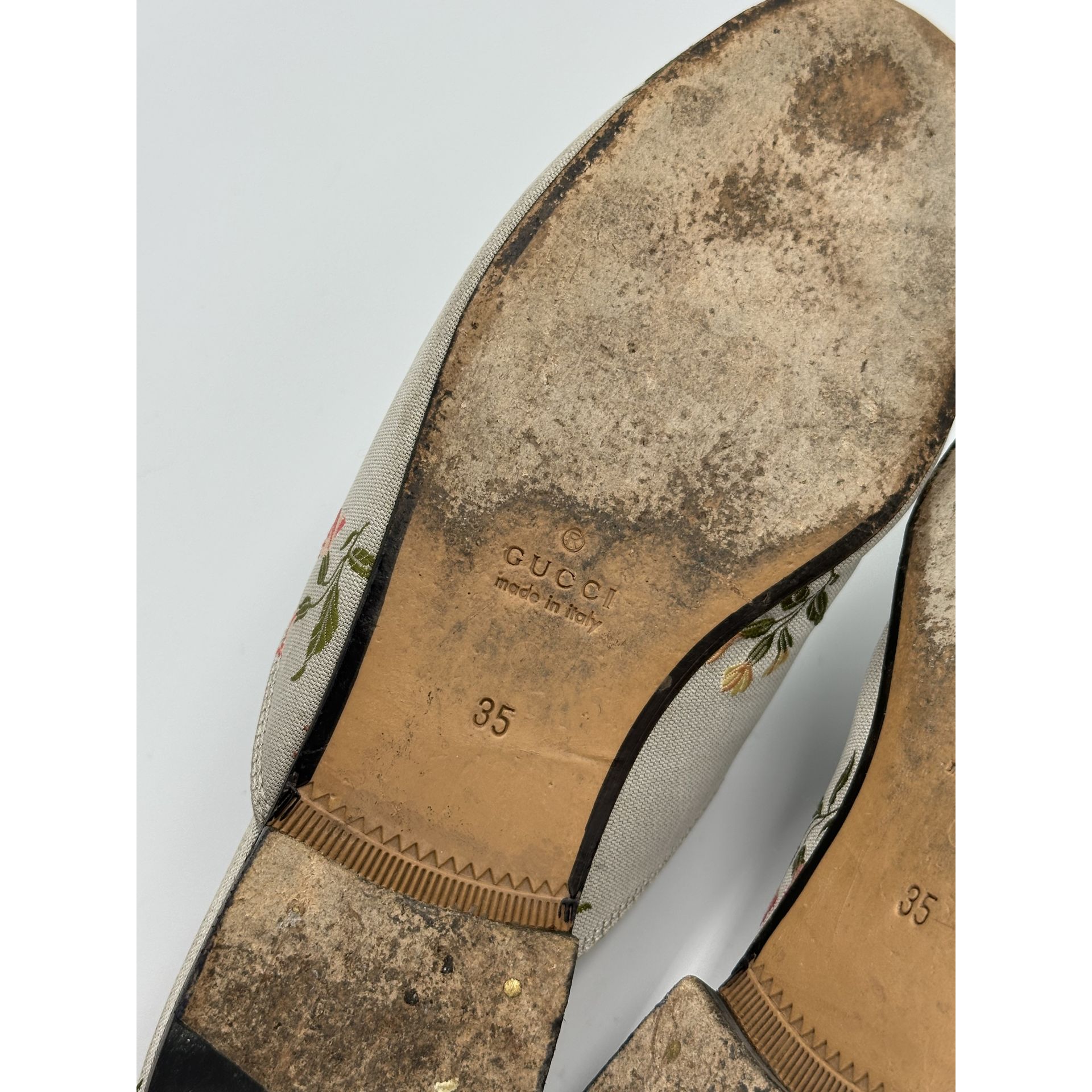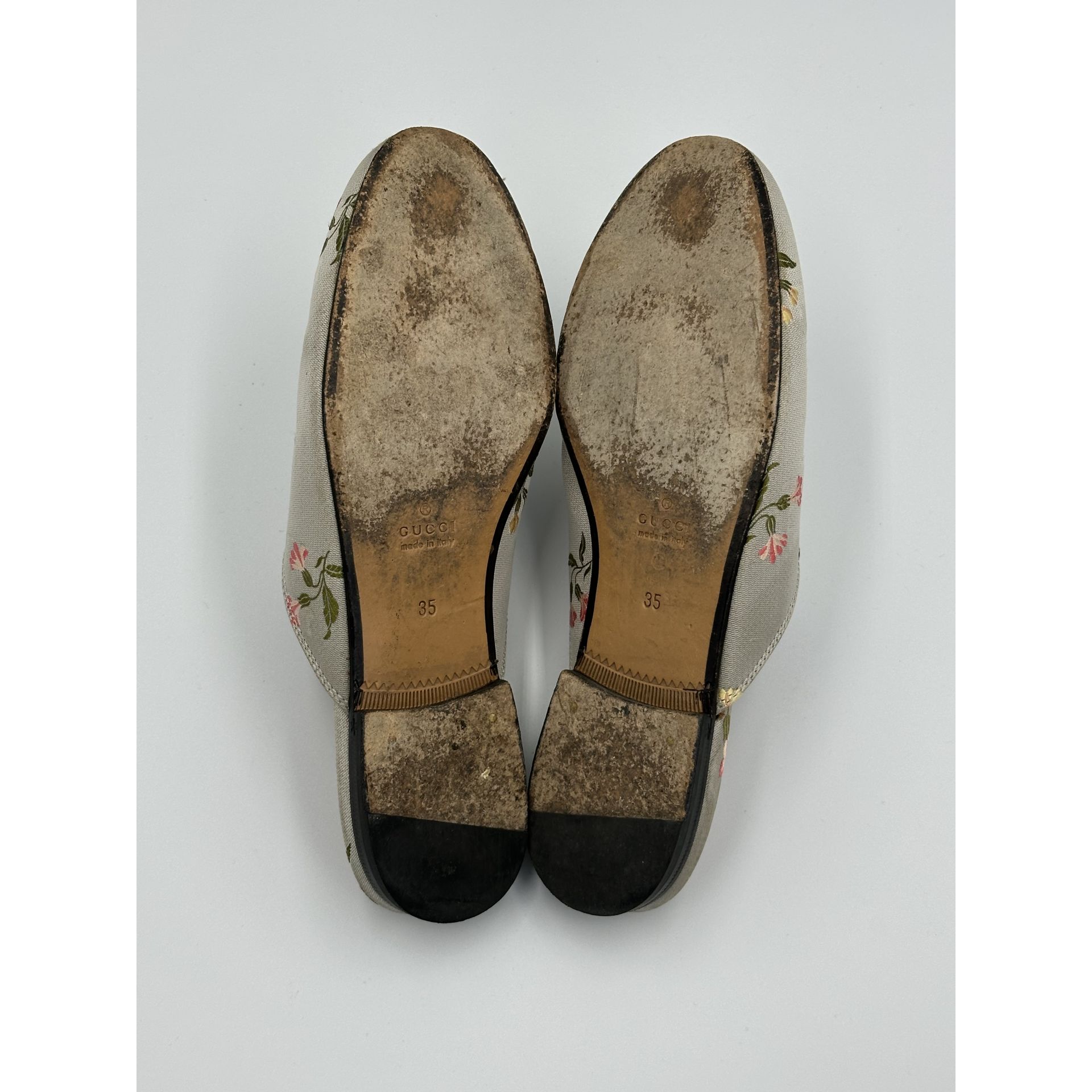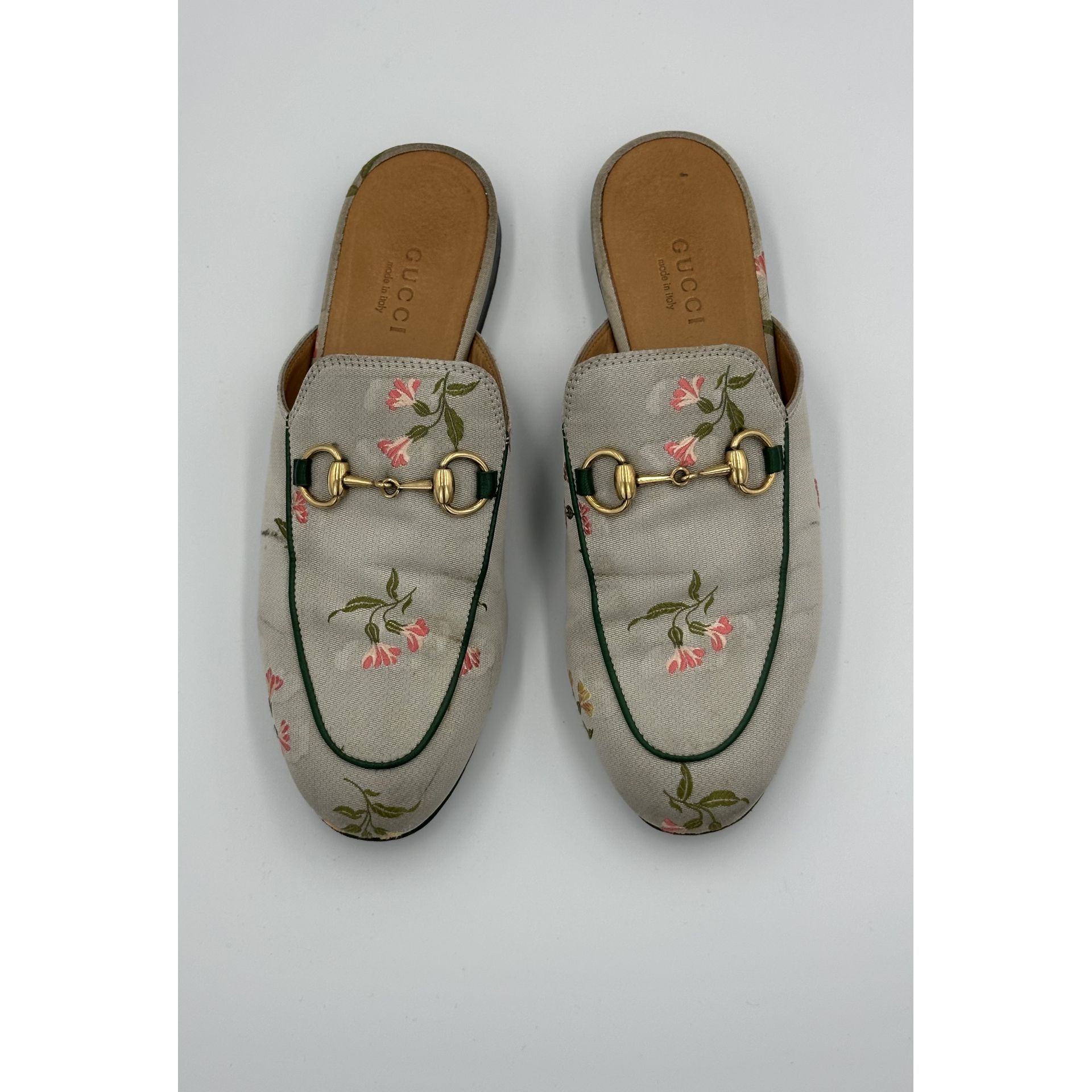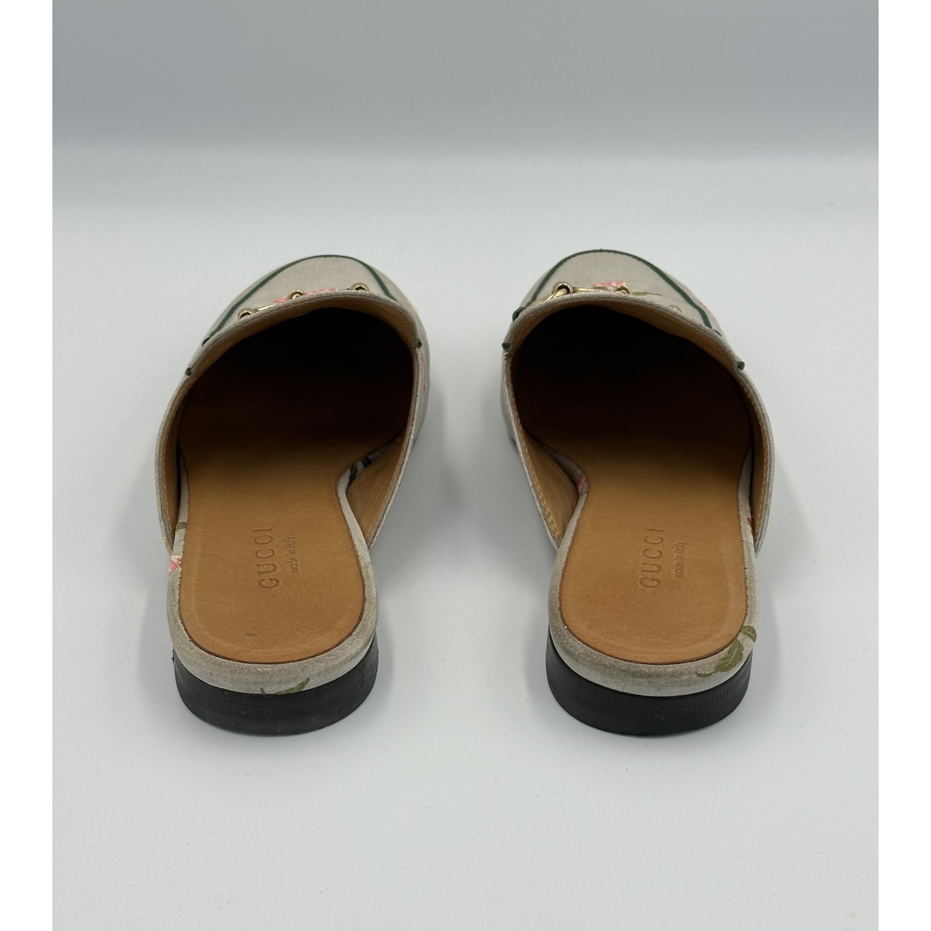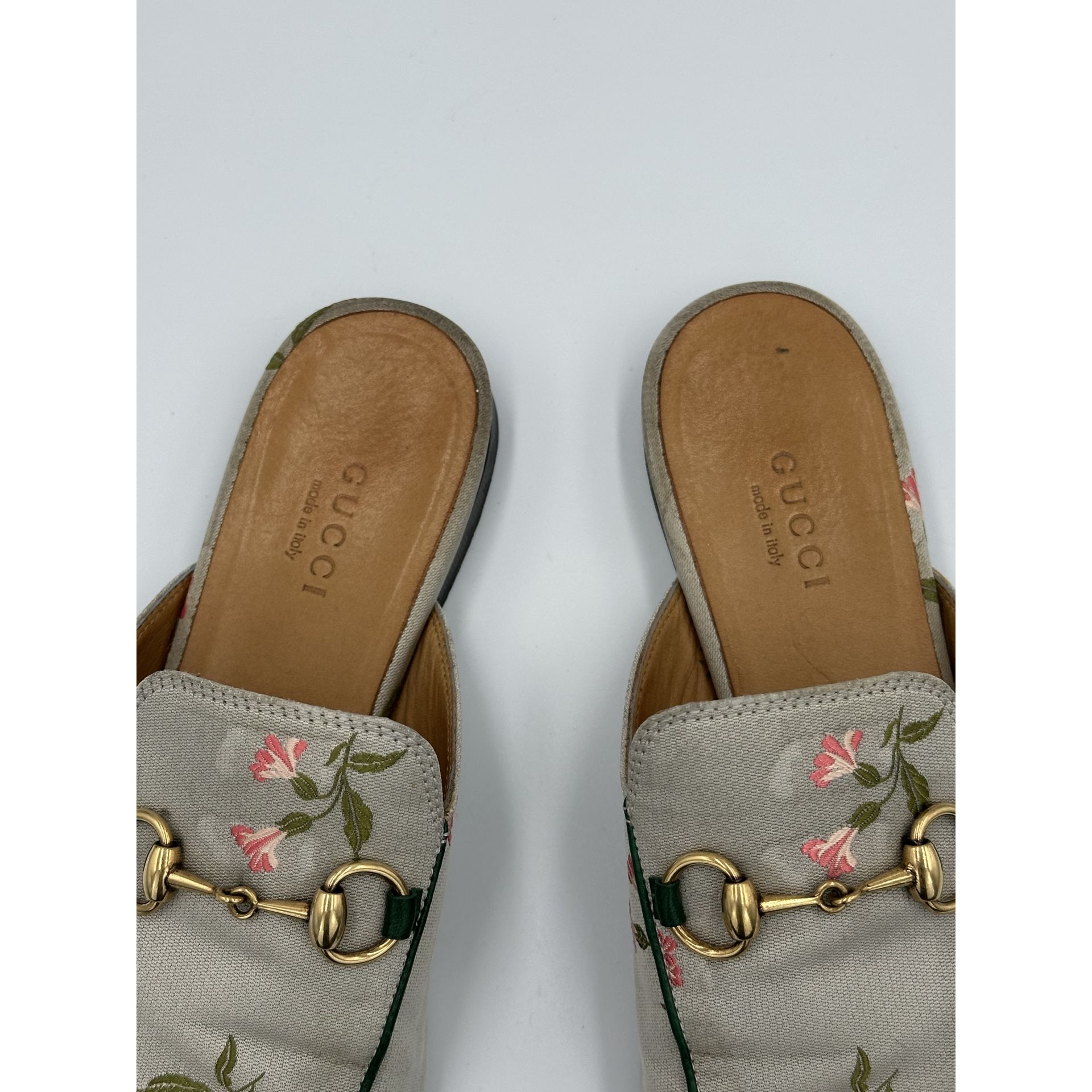 Gucci Princetown – szare klapki z tkaniny w kwiaty, z metalową sprzączką horsebit