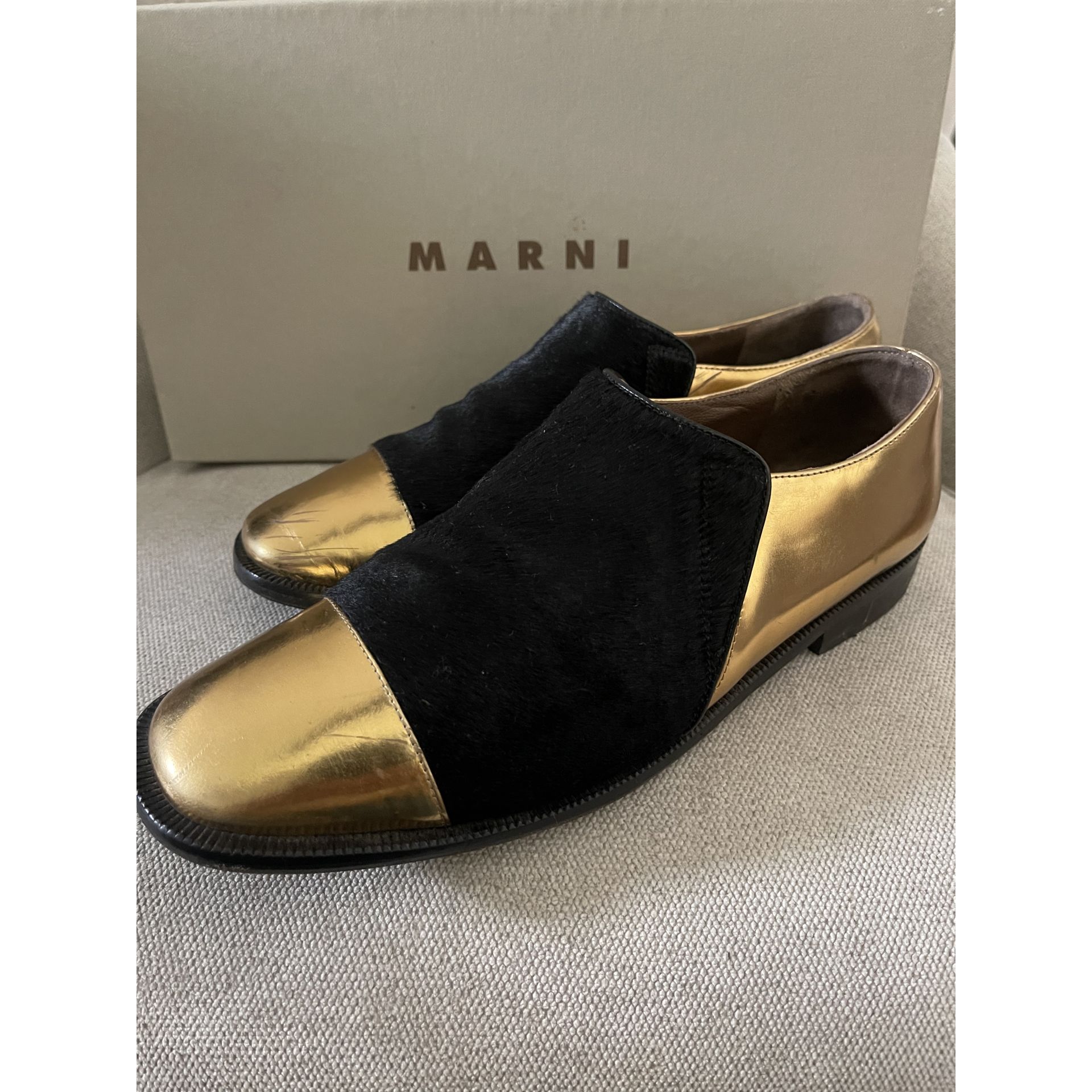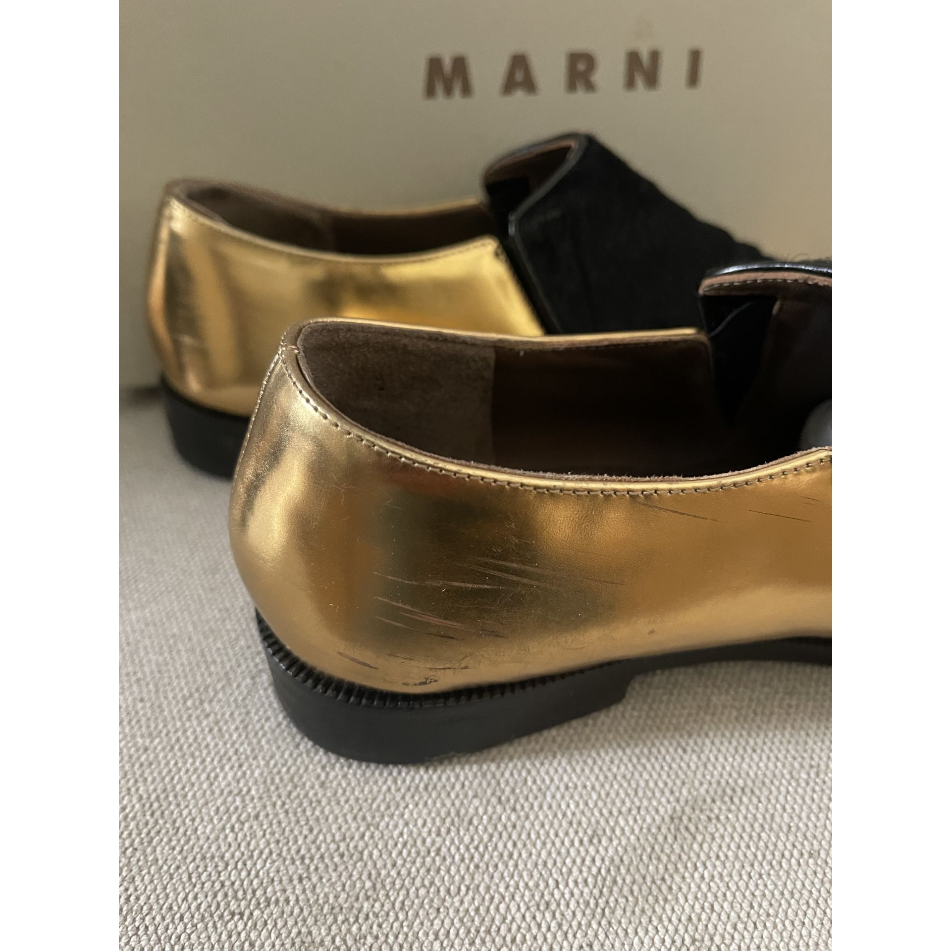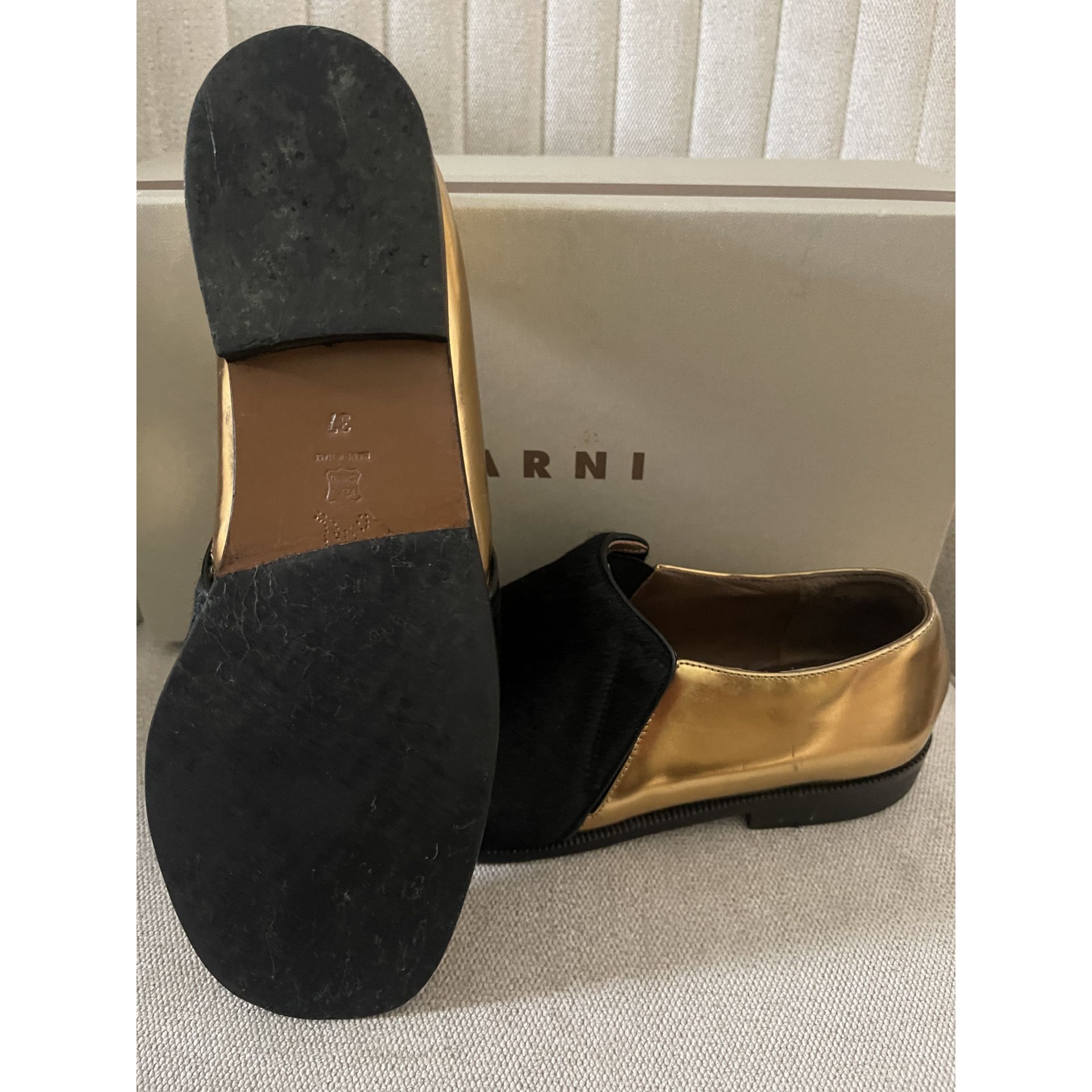 Mokasyny Marni. Skóra w kolorze złotym łączona z pony w kolorze czarnym. Rozmiar 37. Wychodzą ciut większe. Bardzo wygodne. Pięknie leżą na nodze. Zarysowania na złotej części butów uwidocznione są na zdjęciach. Stan oceniam na bdb-.