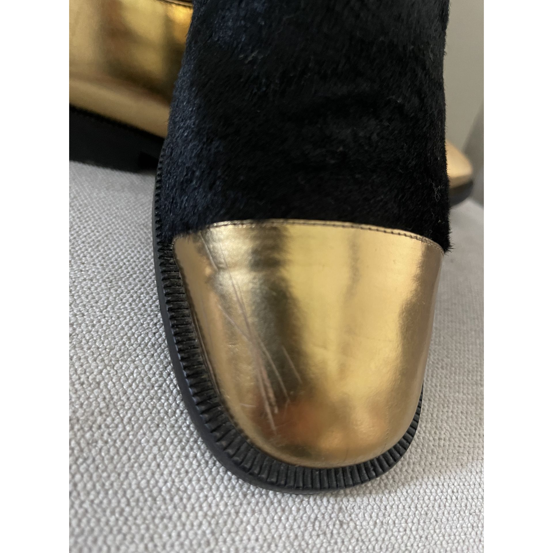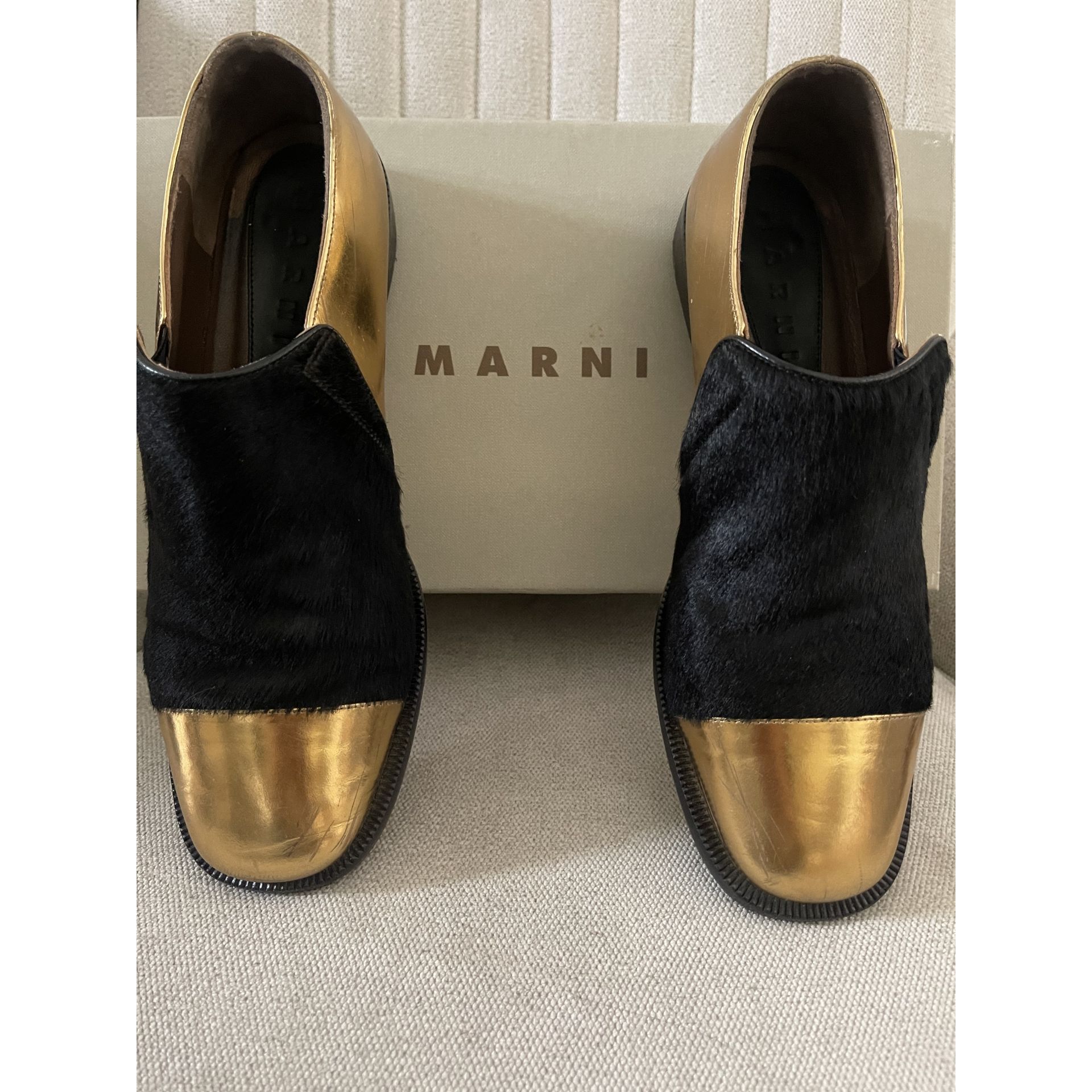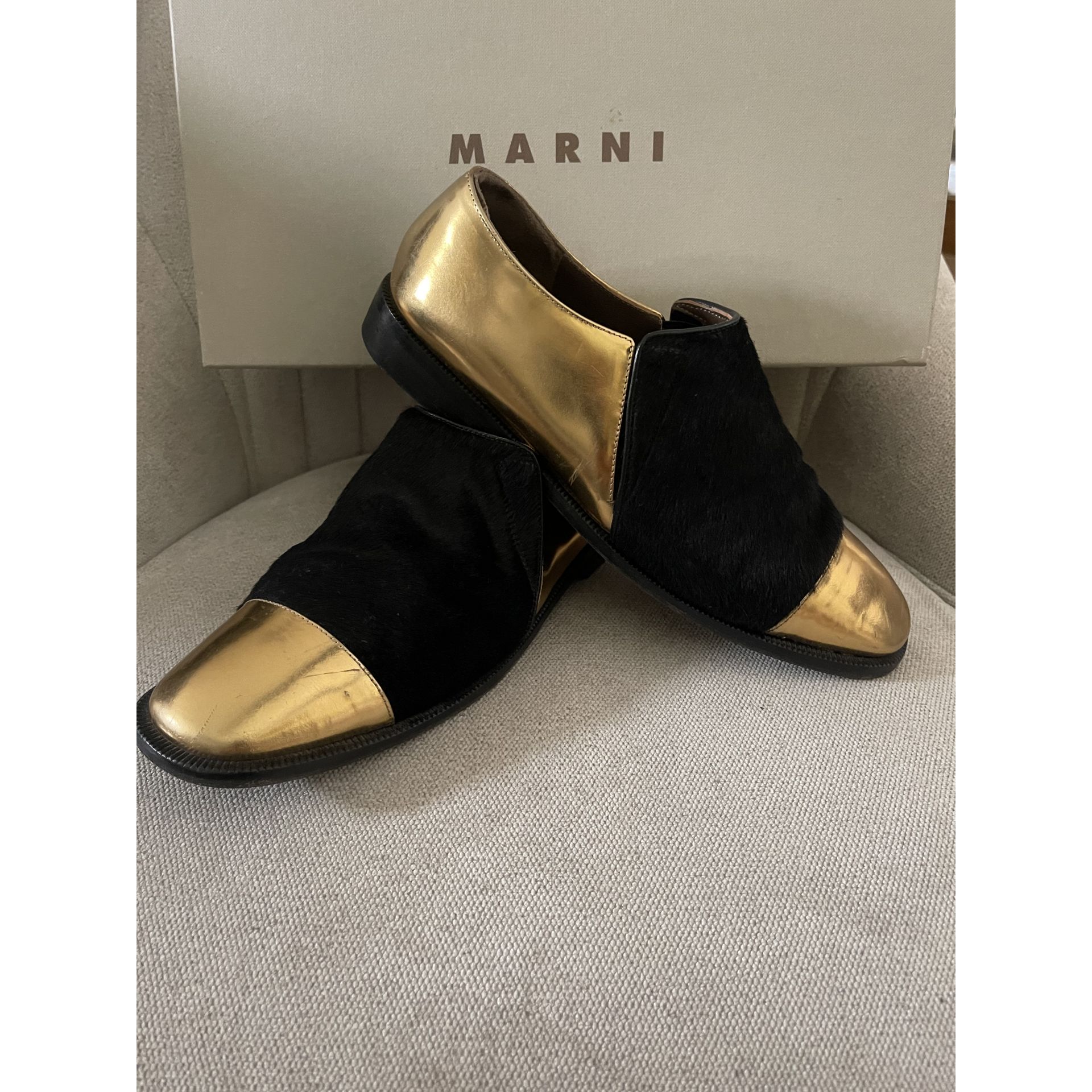 Mokasyny Marni. Skóra w kolorze złotym łączona z pony w kolorze czarnym. Rozmiar 37. Wychodzą ciut większe. Bardzo wygodne. Pięknie leżą na nodze. Zarysowania na złotej części butów uwidocznione są na zdjęciach. Stan oceniam na bdb-.