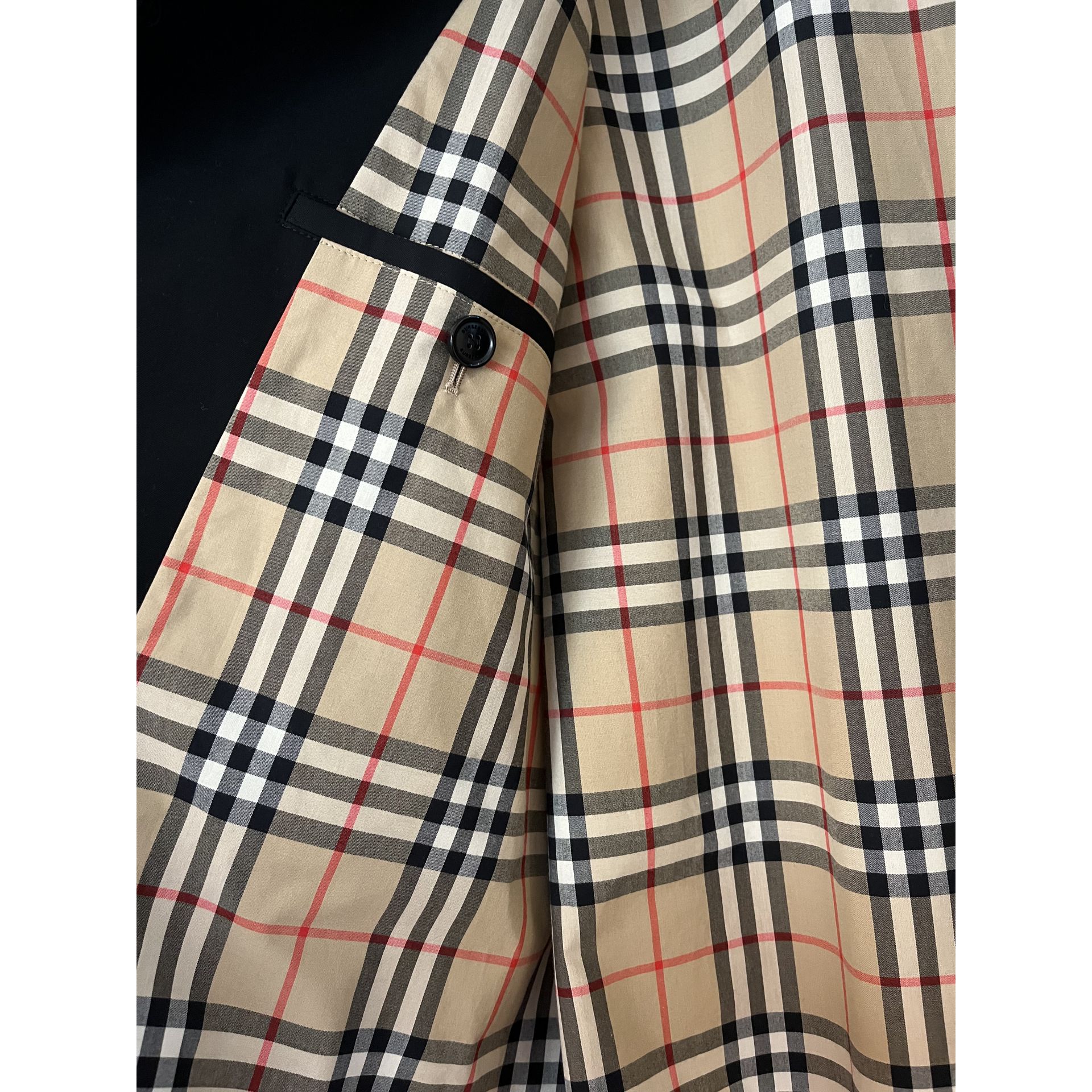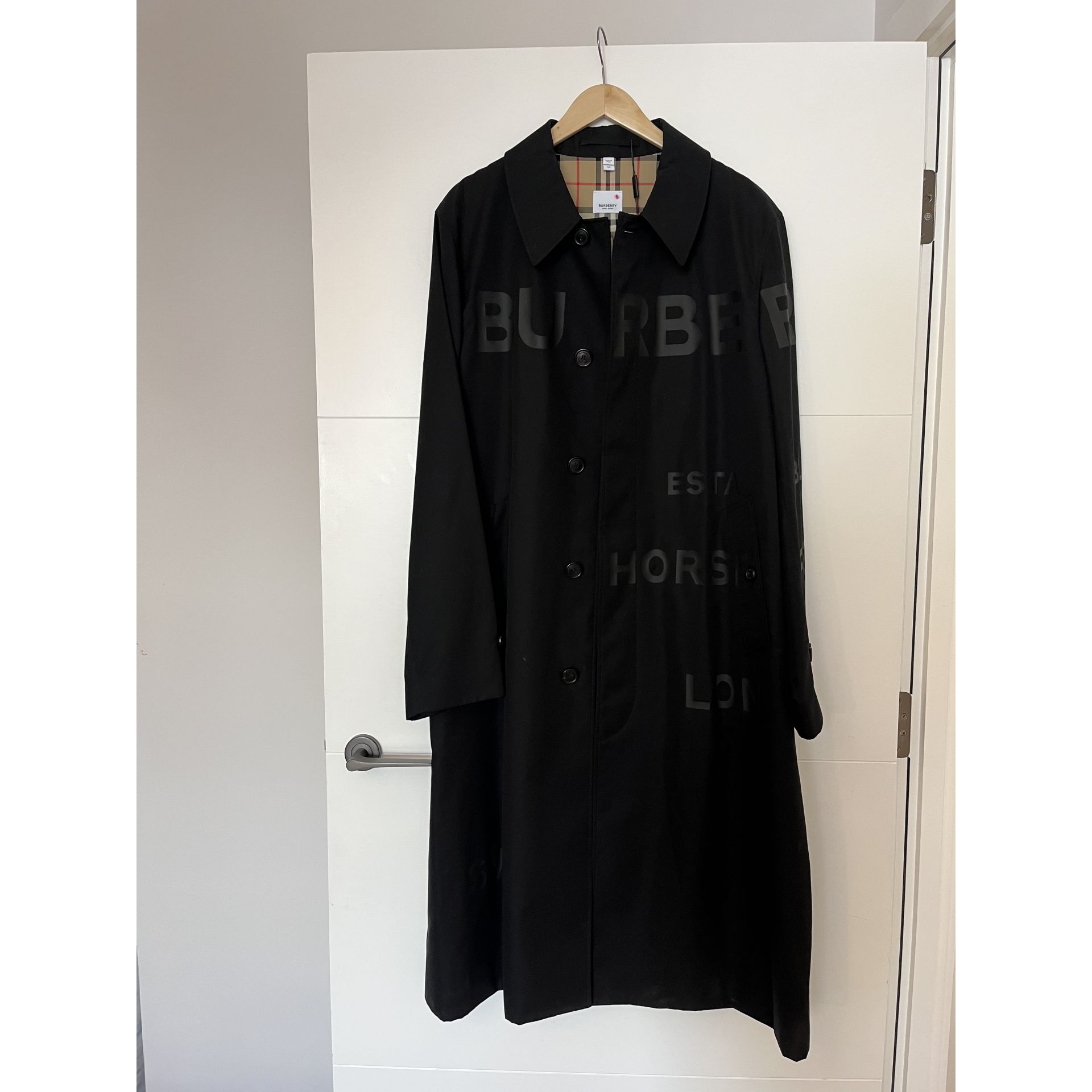 Czarny, bawełniany płaszcz Burberry. Zapinany na guziki oraz haftkę. Ozdobiony nadrukowanym wzorem horseferry z logo w kolorze czarnym. Z przodu dwie kieszenie zamykane na guziki.