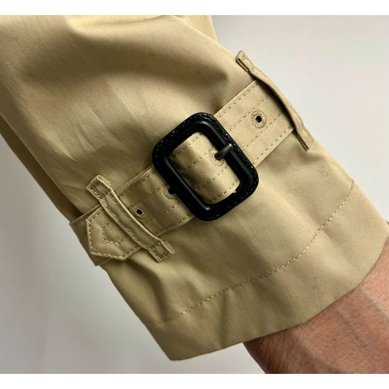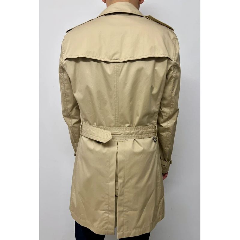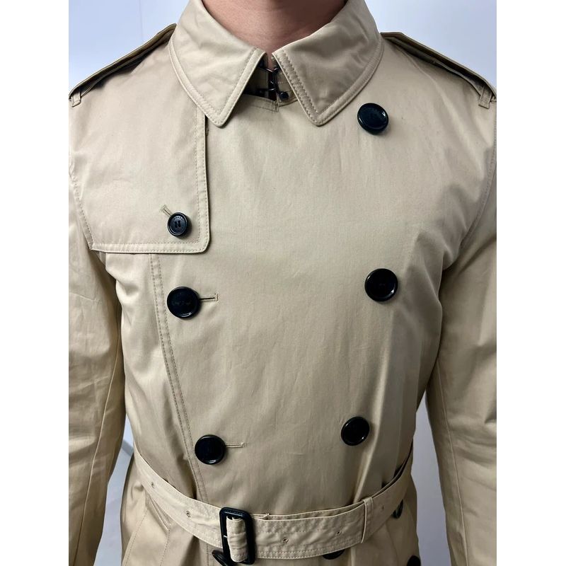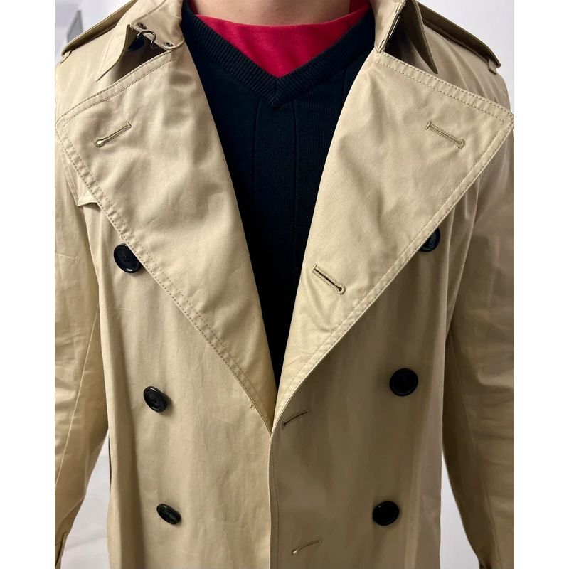 Nowy męski trench dwurzędowy przewiązywany paskiem.