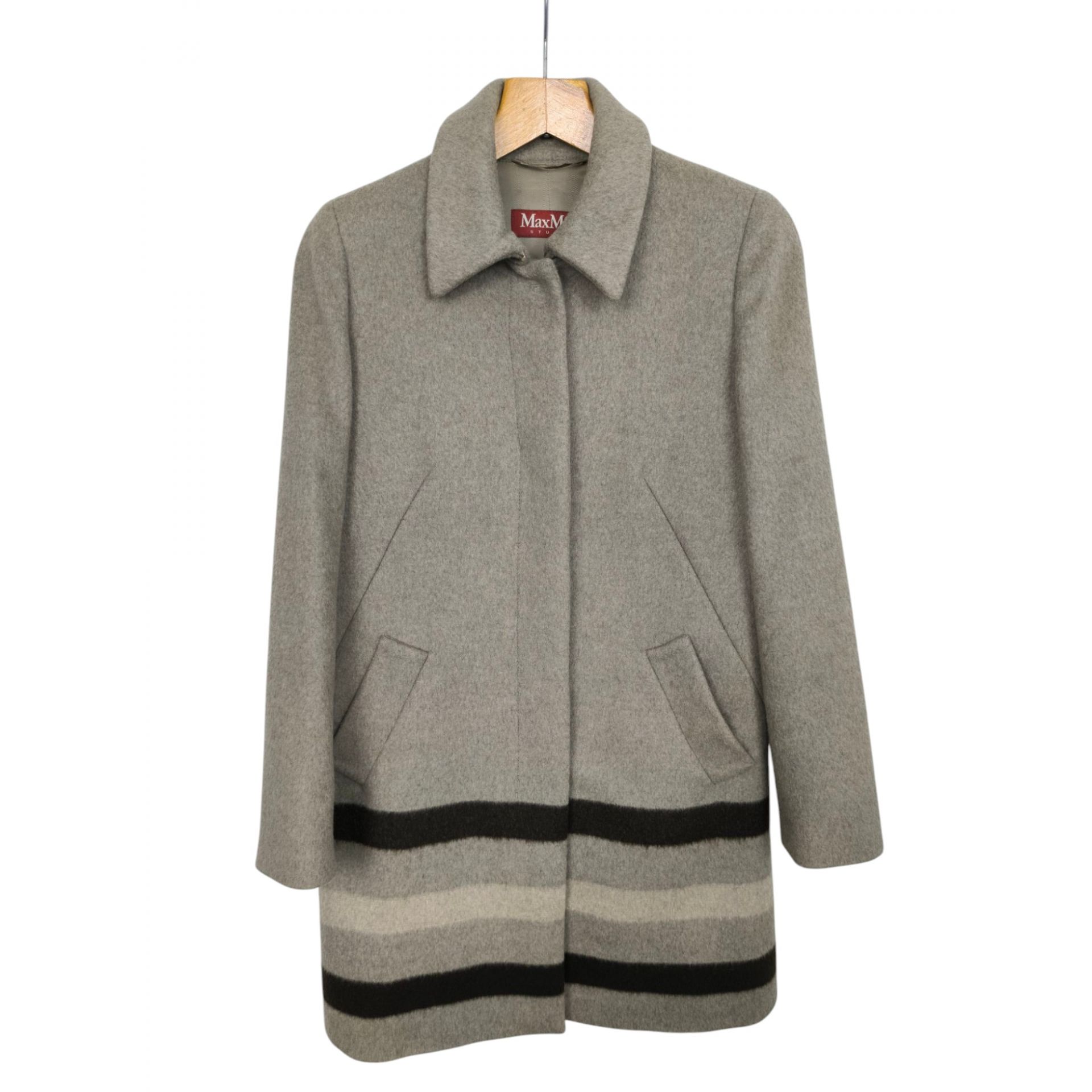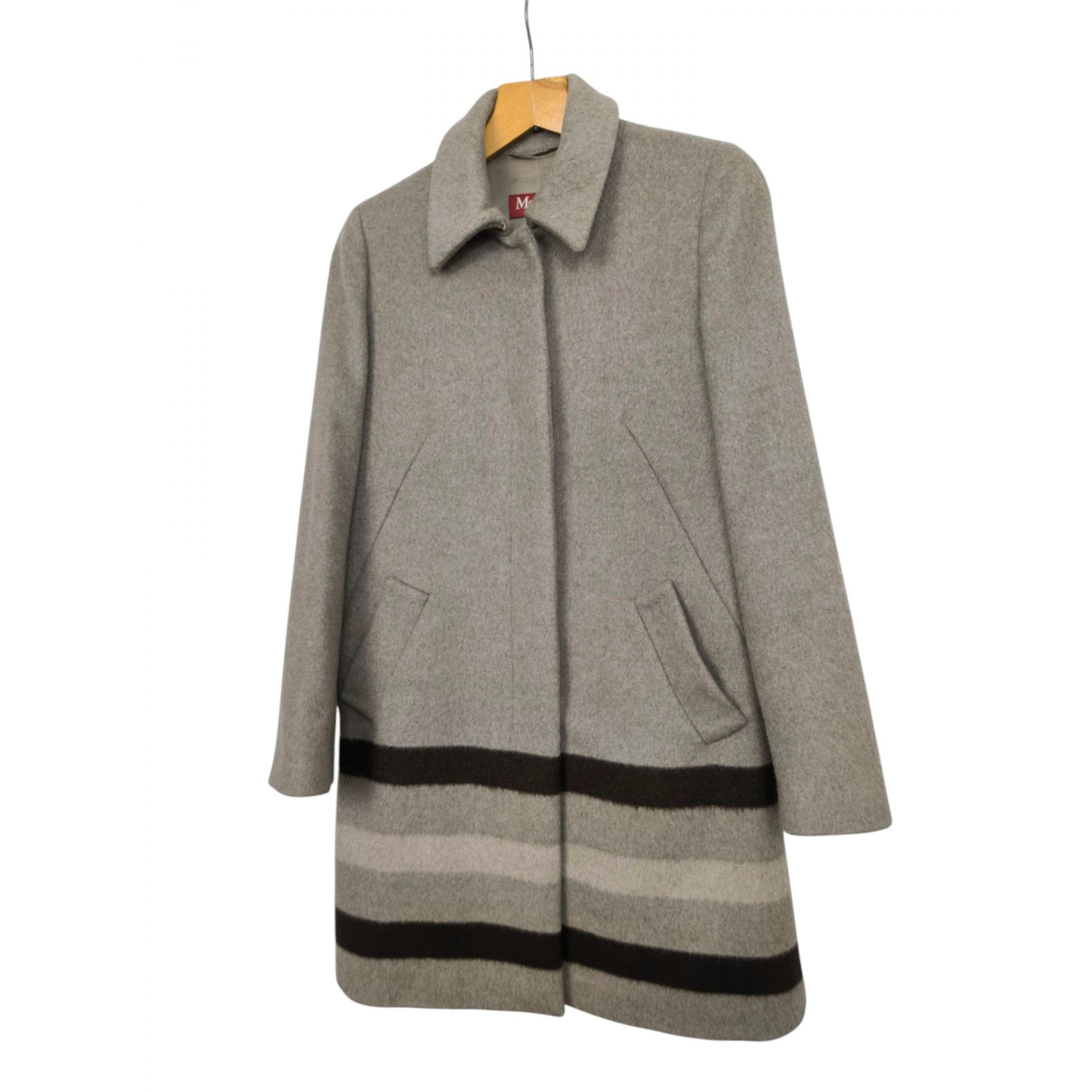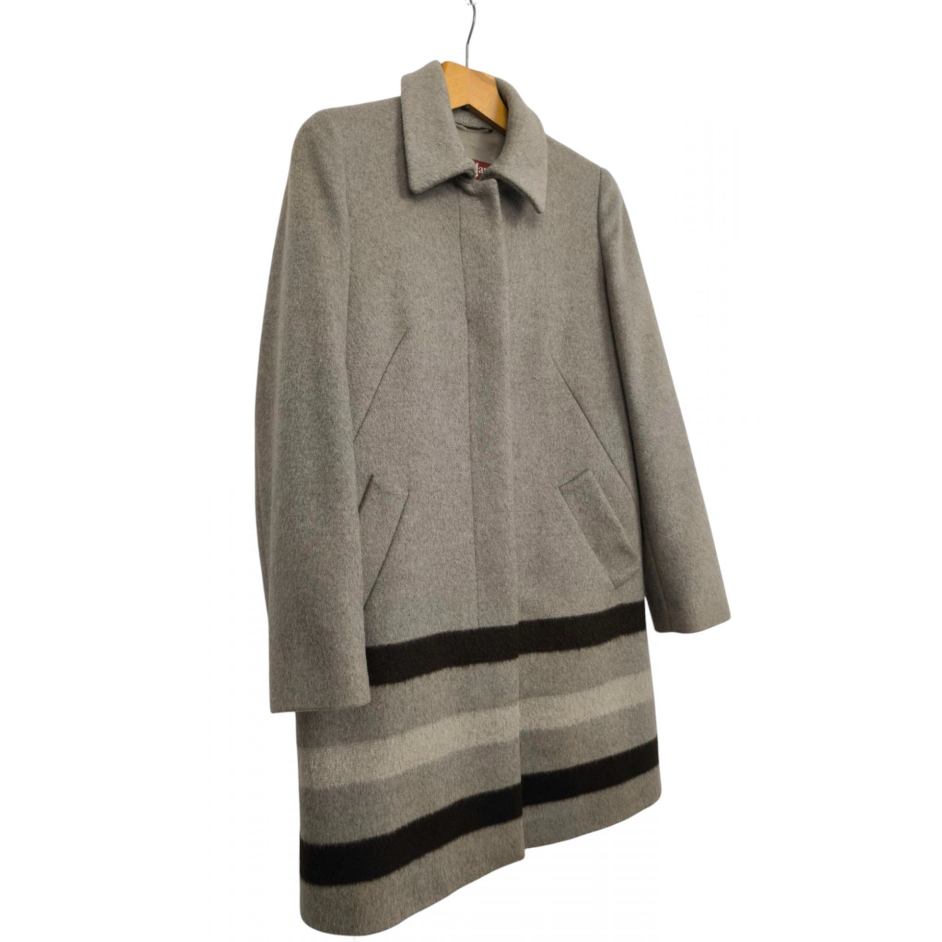 Płaszcz luksusowej marki Max Mara, wykonany w 97% wełny dziewiczej, 2% moheru i 1 % polyamidu. Podszewka to wiskoza i acetat. Płaszcz w kolorze piaskowy z kontrastującymi pasami na dole, krój prosty, zapinany na górną haftkę, zatrzask i 3 guziki chowane pod warstwę materiału. Niesamowita jakość wykonania i materiału.