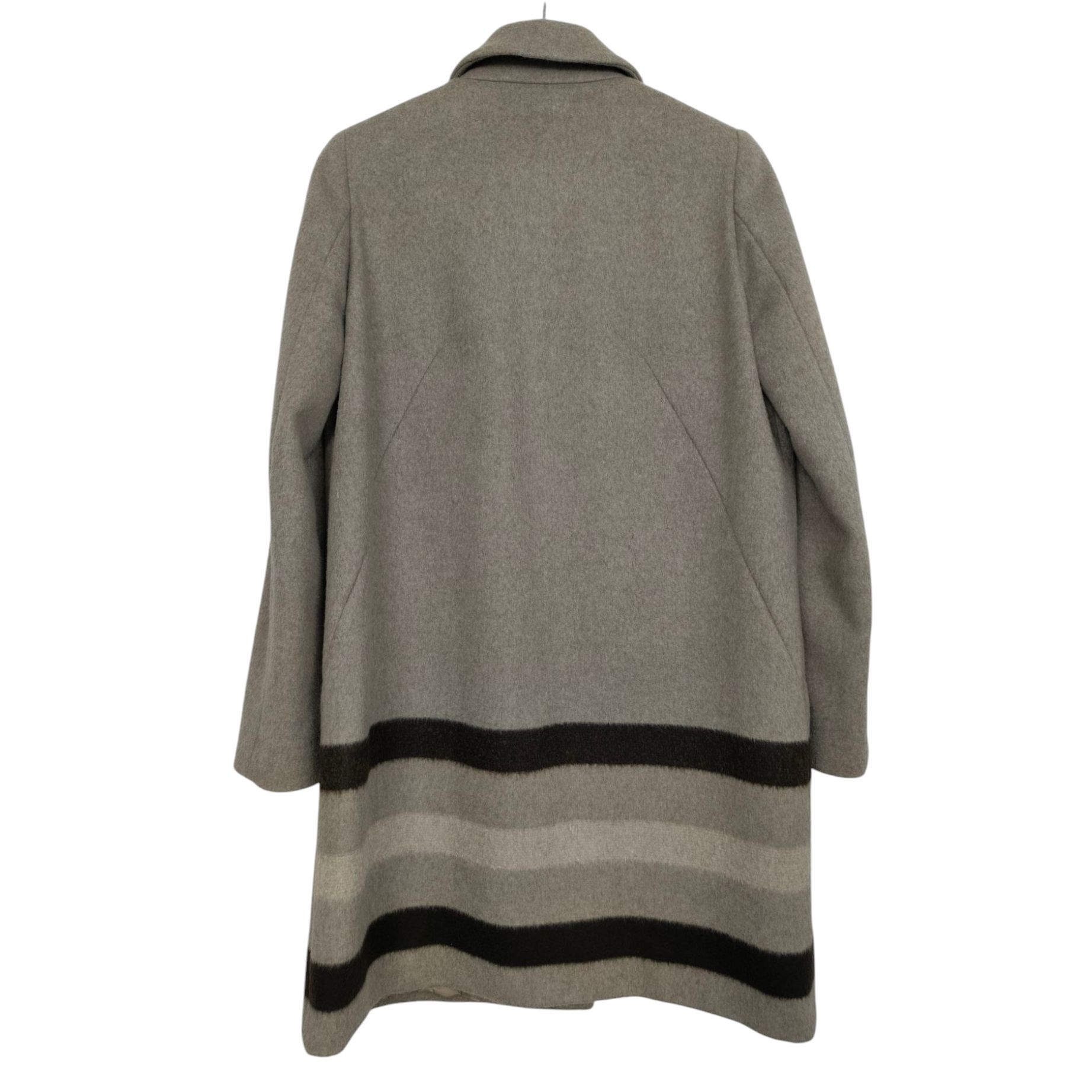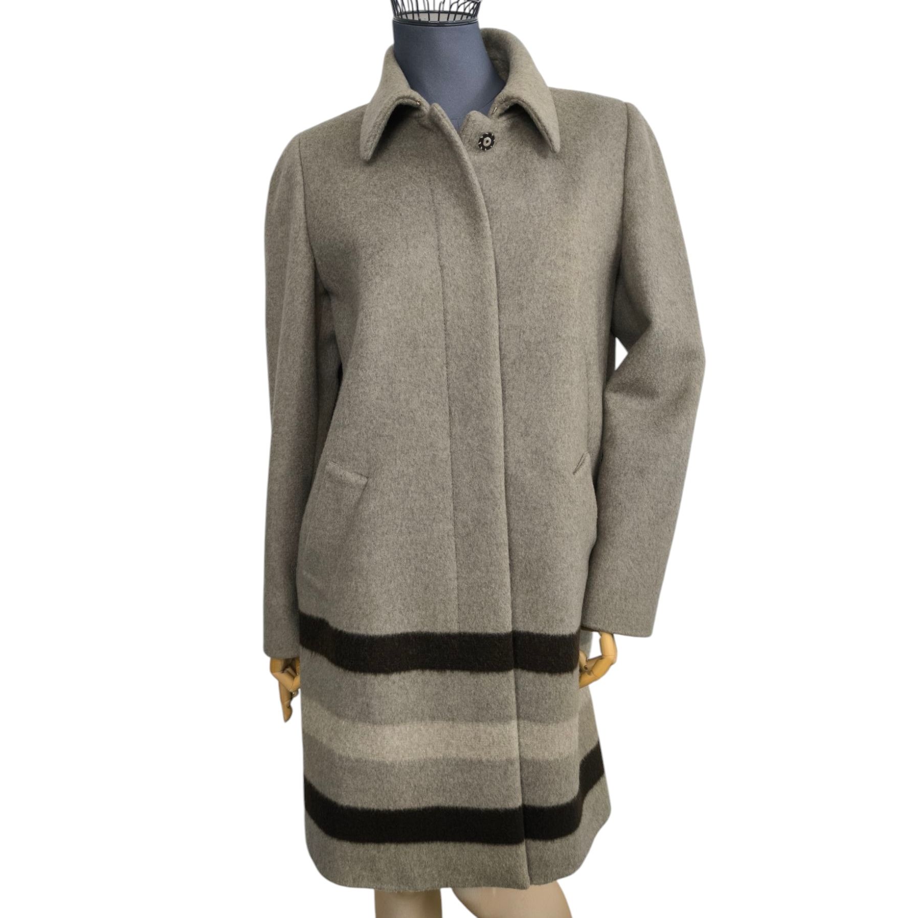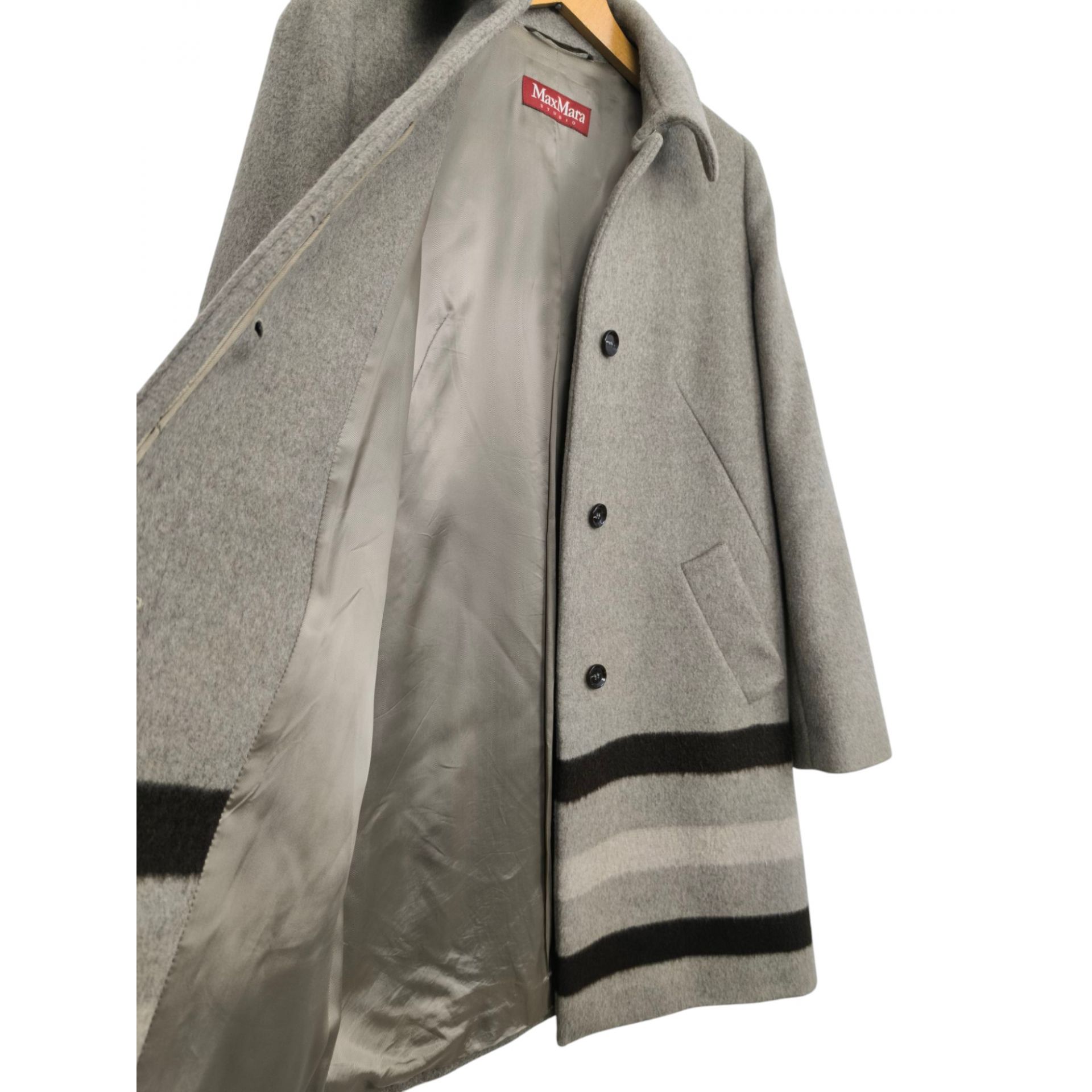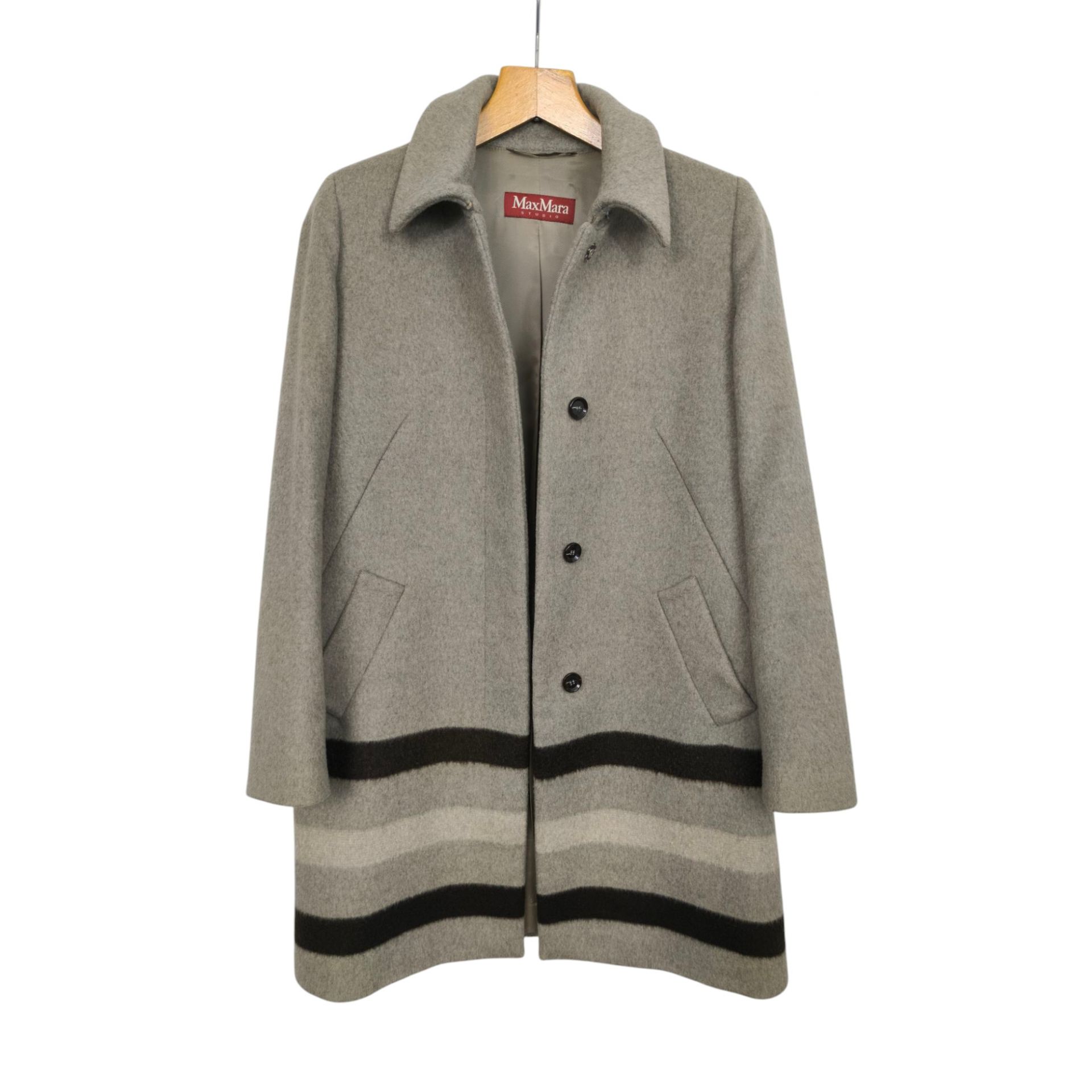 Płaszcz luksusowej marki Max Mara, wykonany w 97% wełny dziewiczej, 2% moheru i 1 % polyamidu. Podszewka to wiskoza i acetat. Płaszcz w kolorze piaskowy z kontrastującymi pasami na dole, krój prosty, zapinany na górną haftkę, zatrzask i 3 guziki chowane pod warstwę materiału. Niesamowita jakość wykonania i materiału.