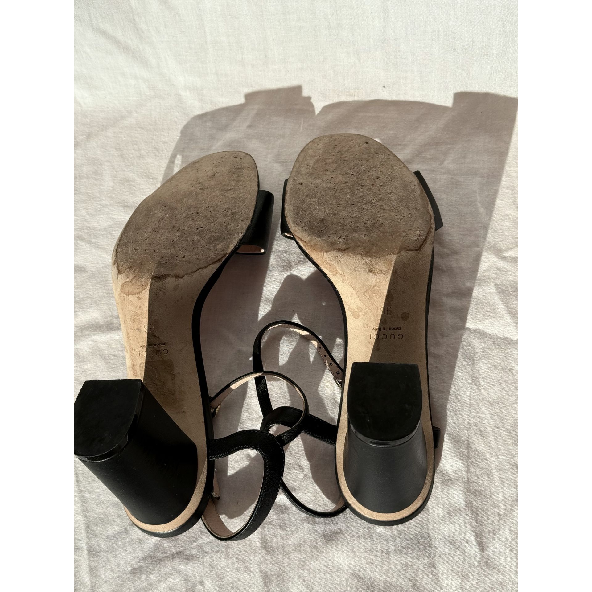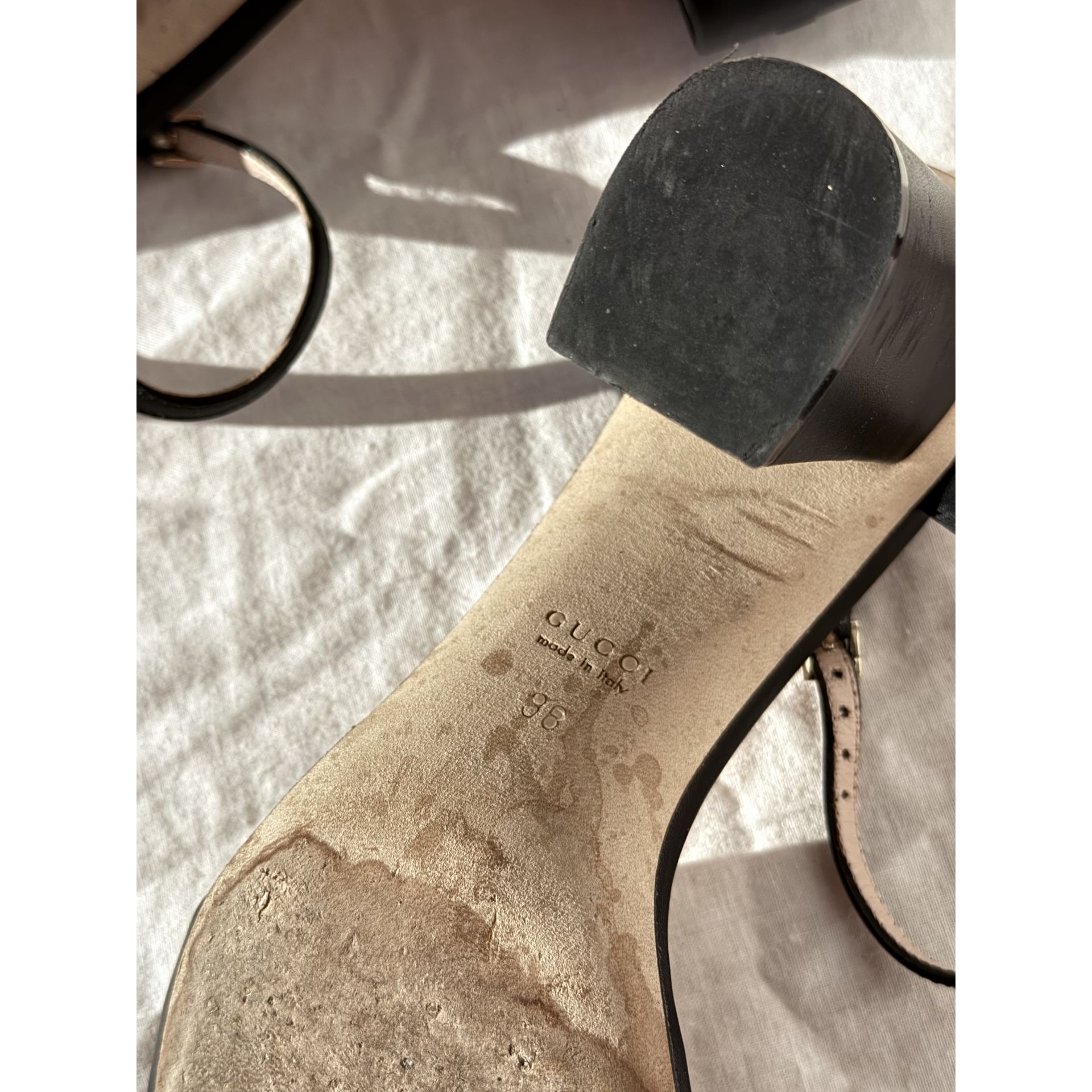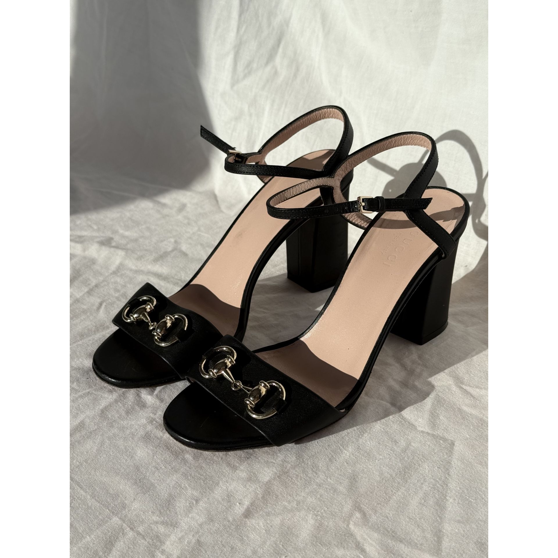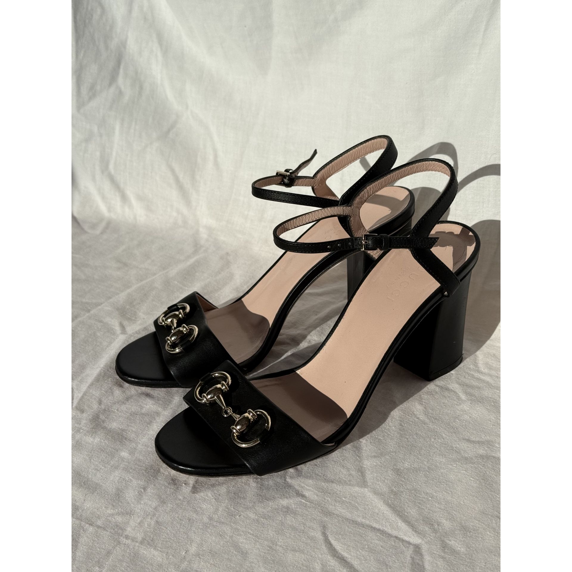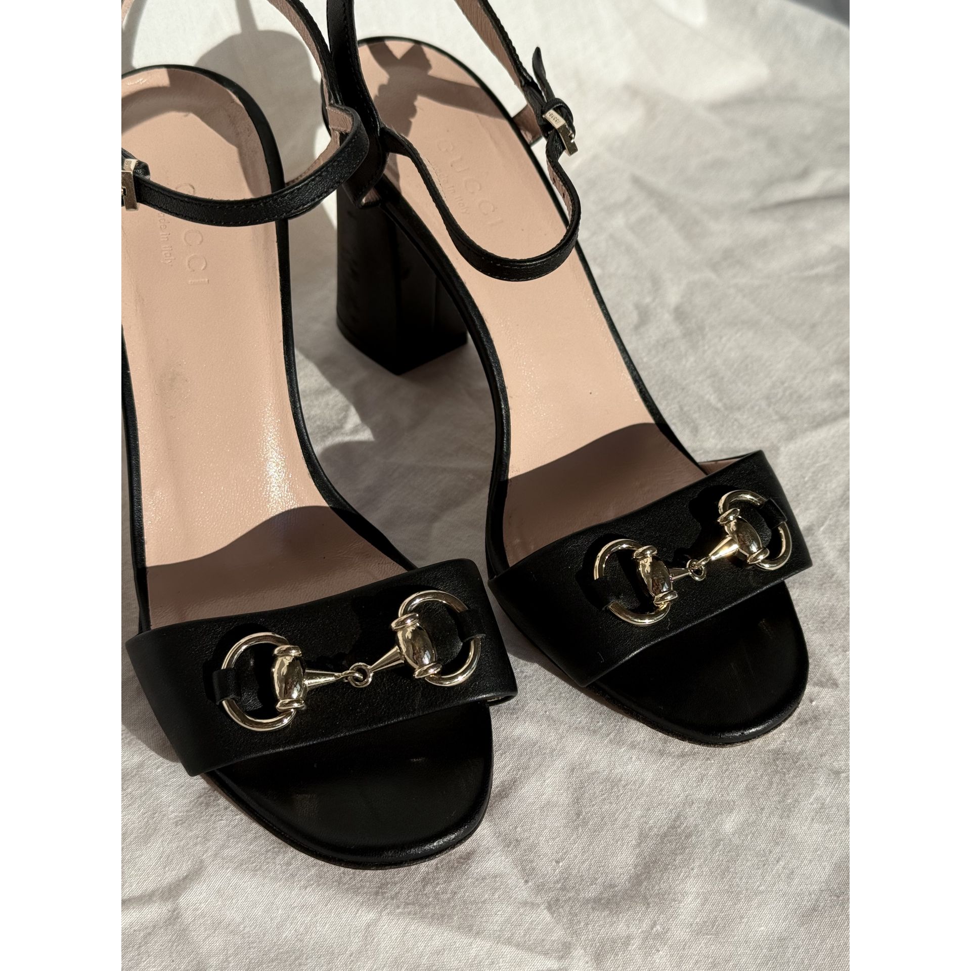 Czarne skórzane sandałki Gucci ze złotym horsebit, na obcasie słupku.
