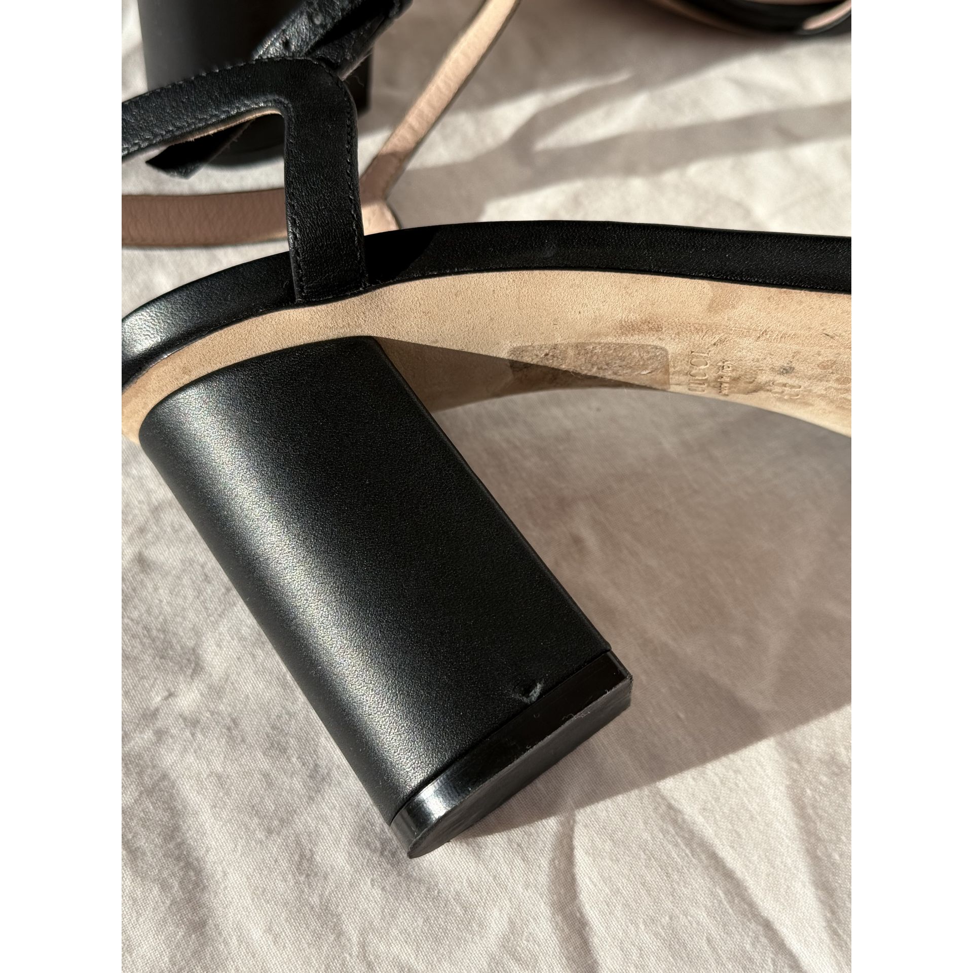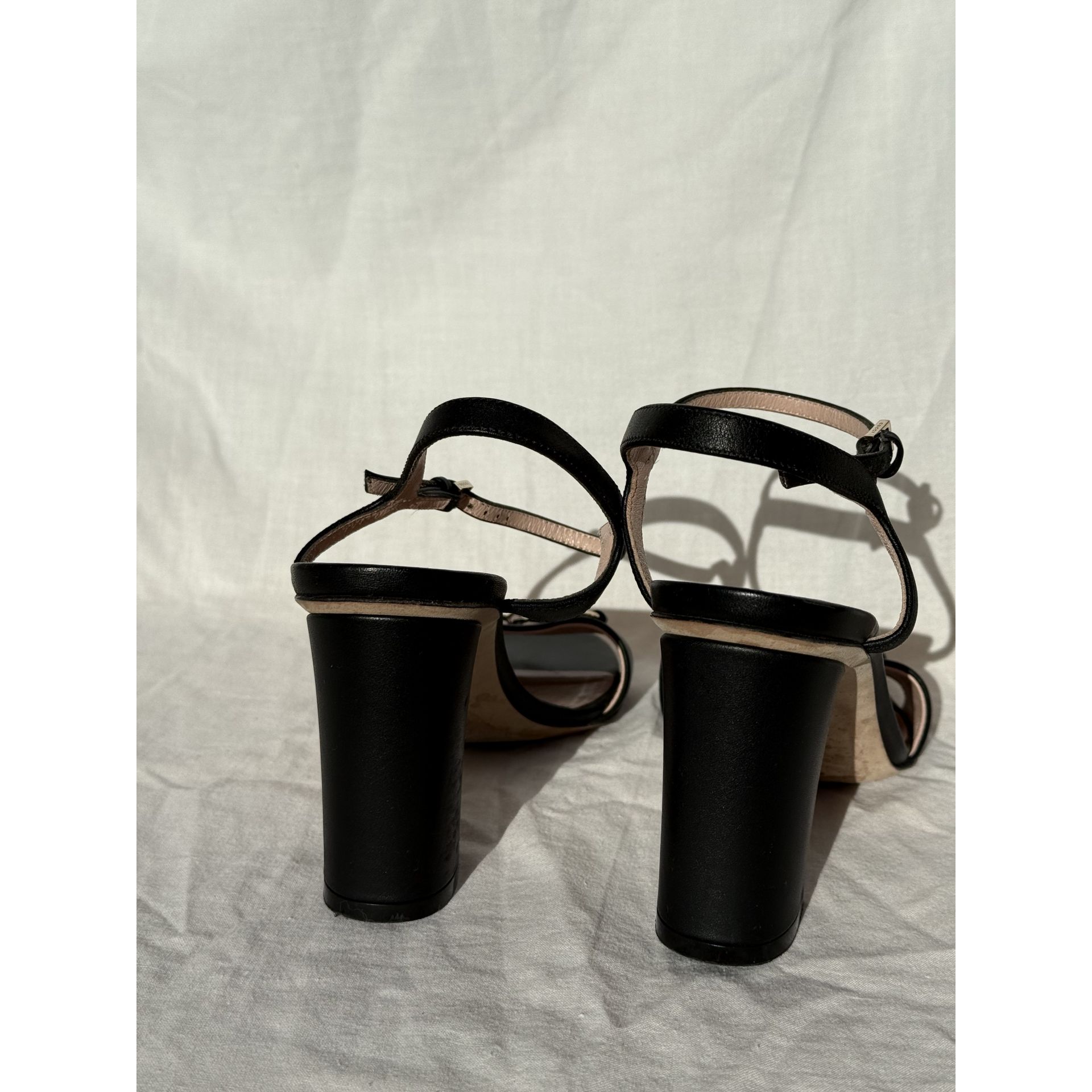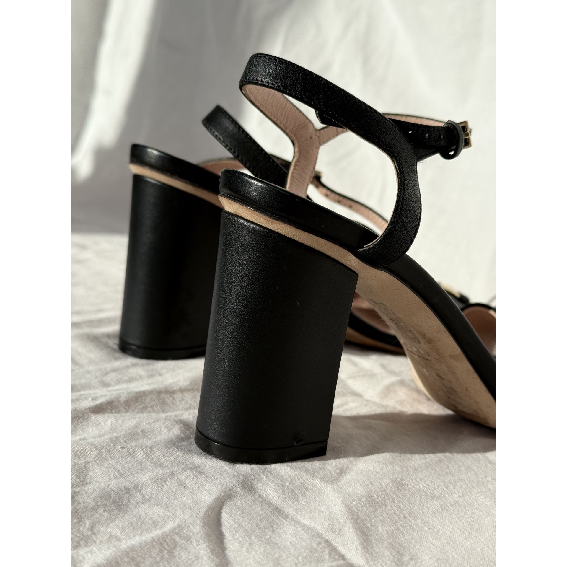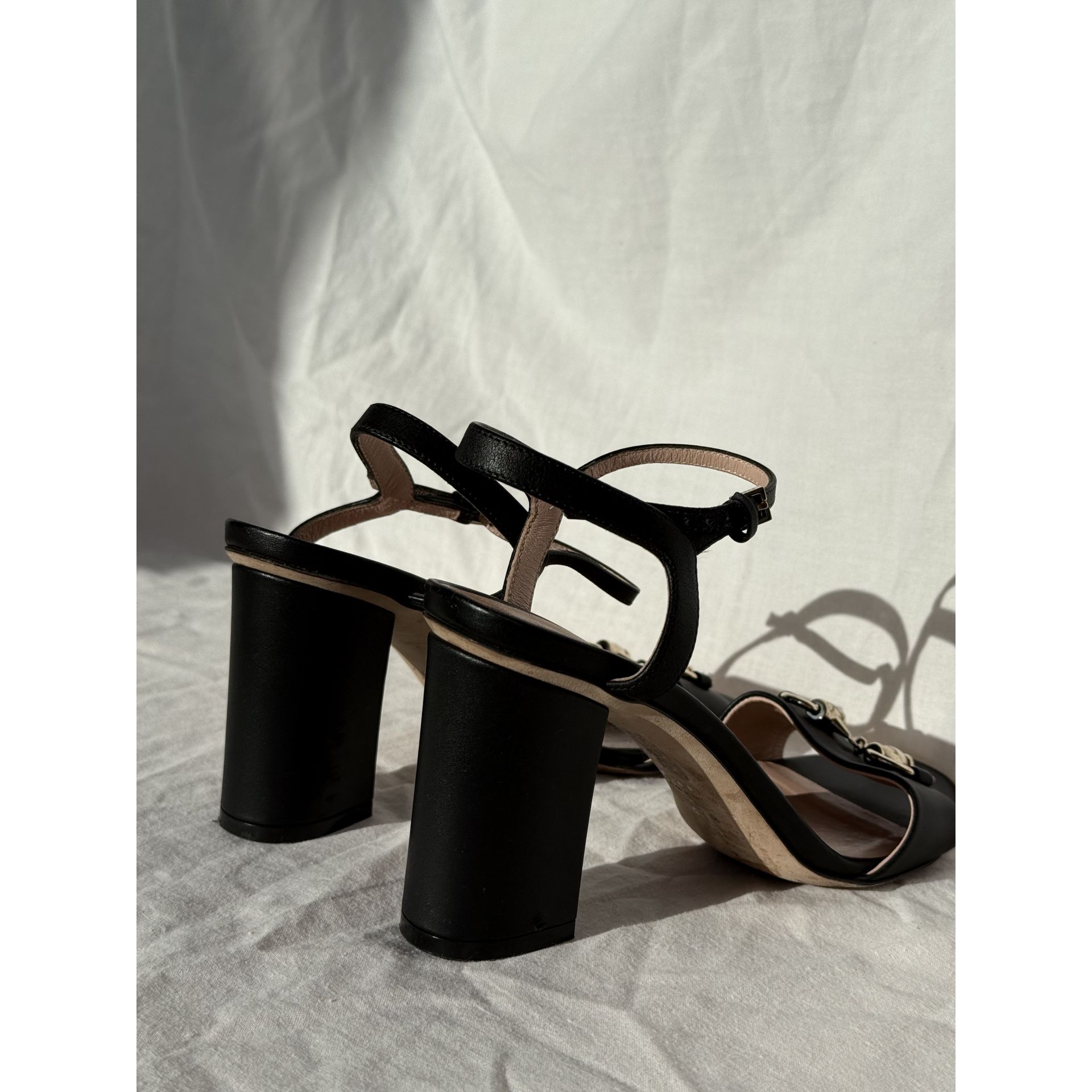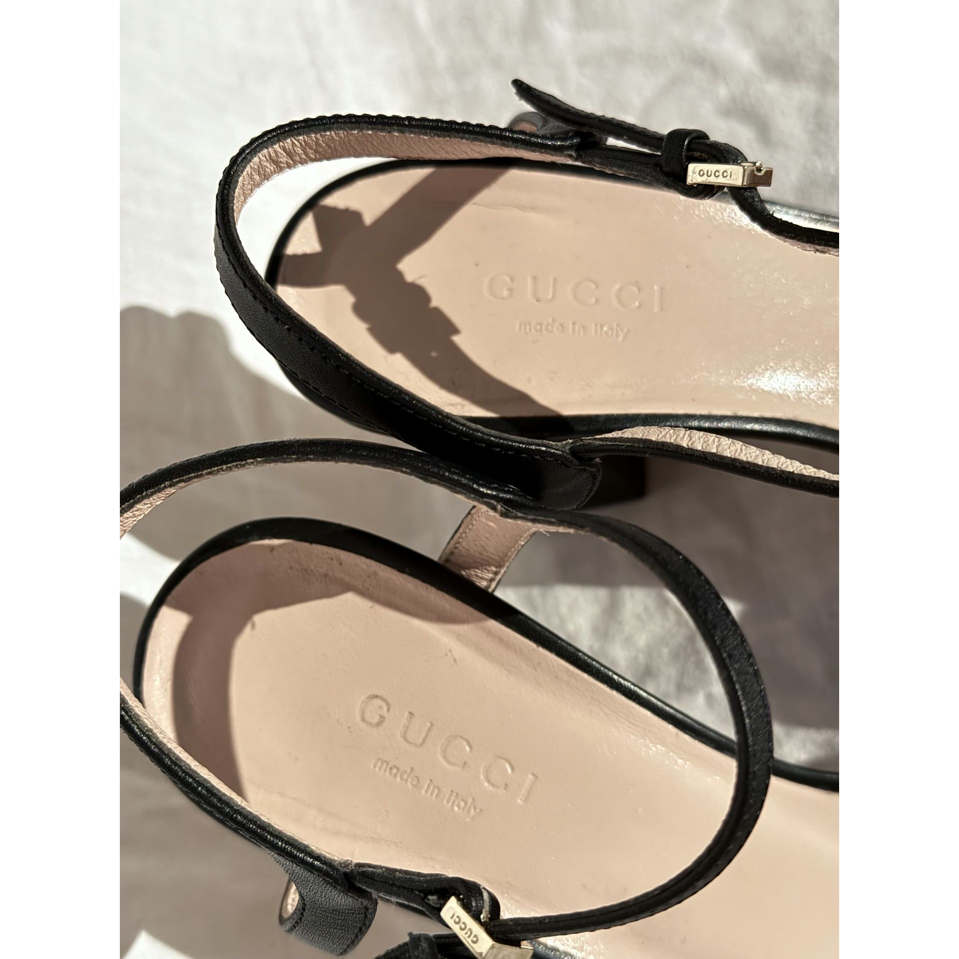 Czarne skórzane sandałki Gucci ze złotym horsebit, na obcasie słupku.