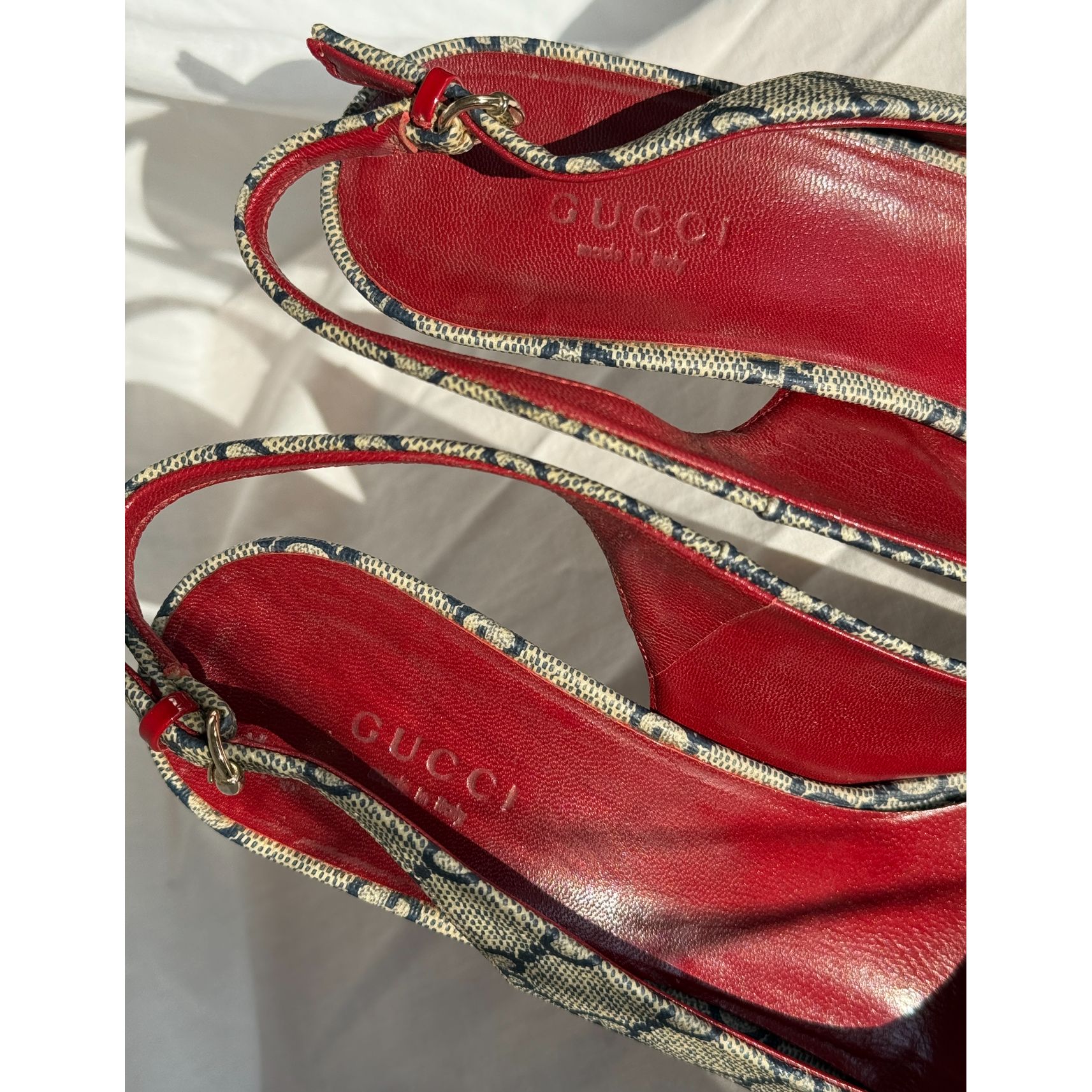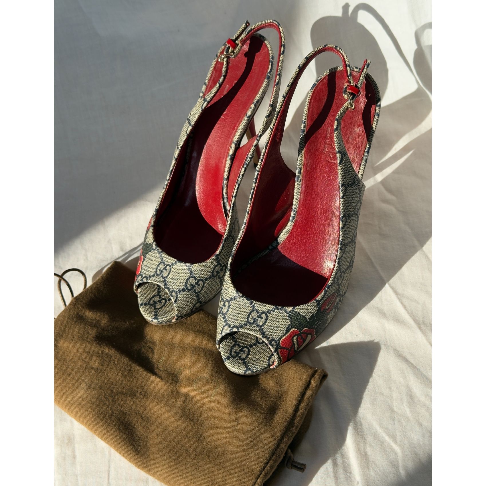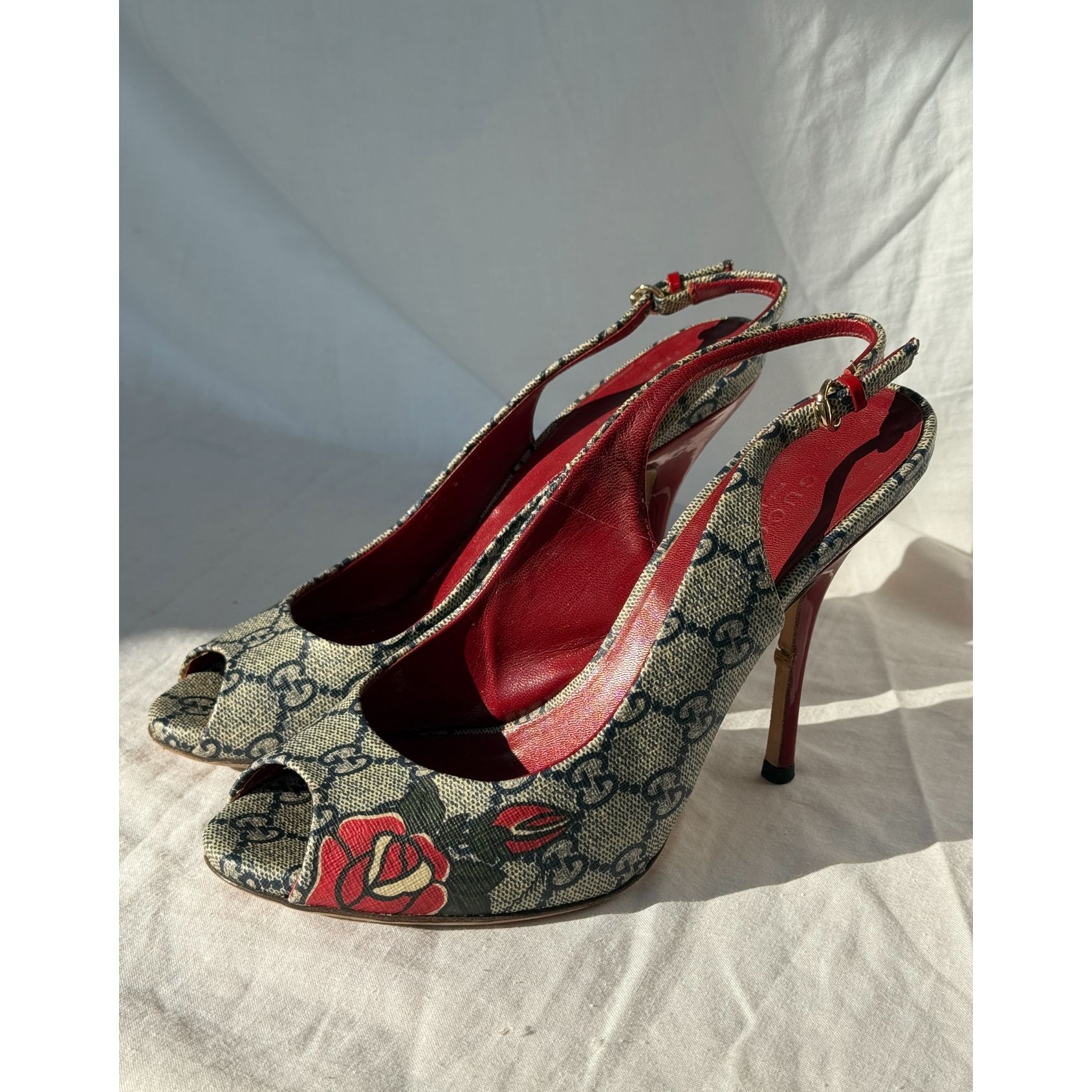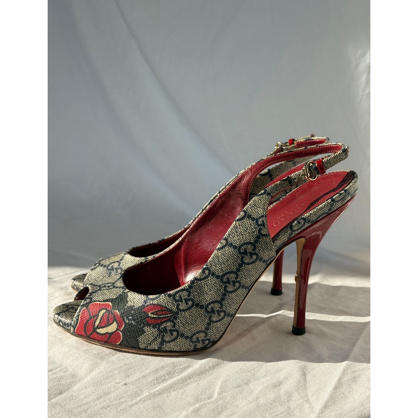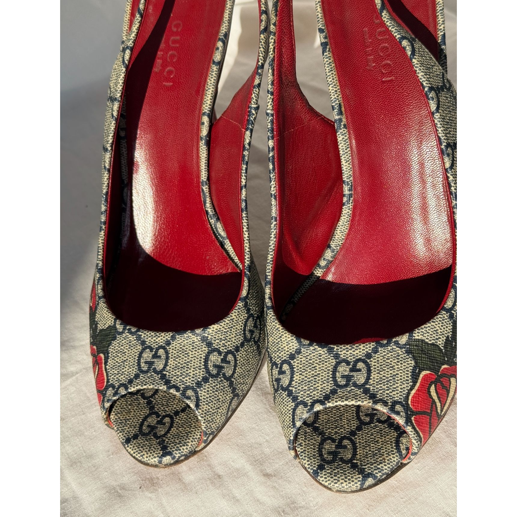 Sandałki Gucci w monogram z motywem róży, odkryte palce i pięty. Przepięknie wyglądają na nodze, bardzo kobiece.