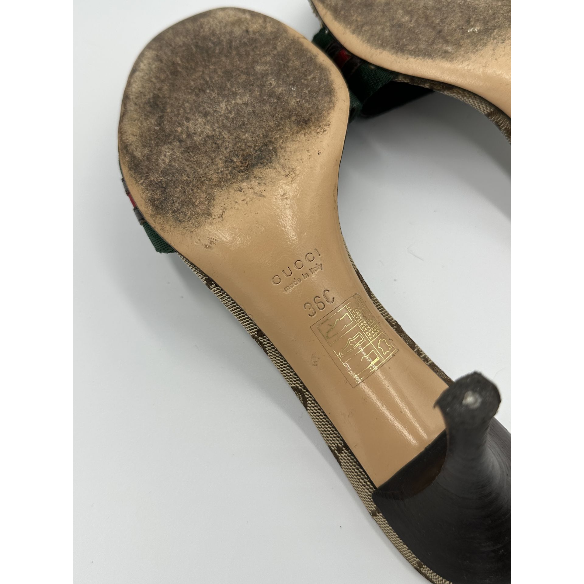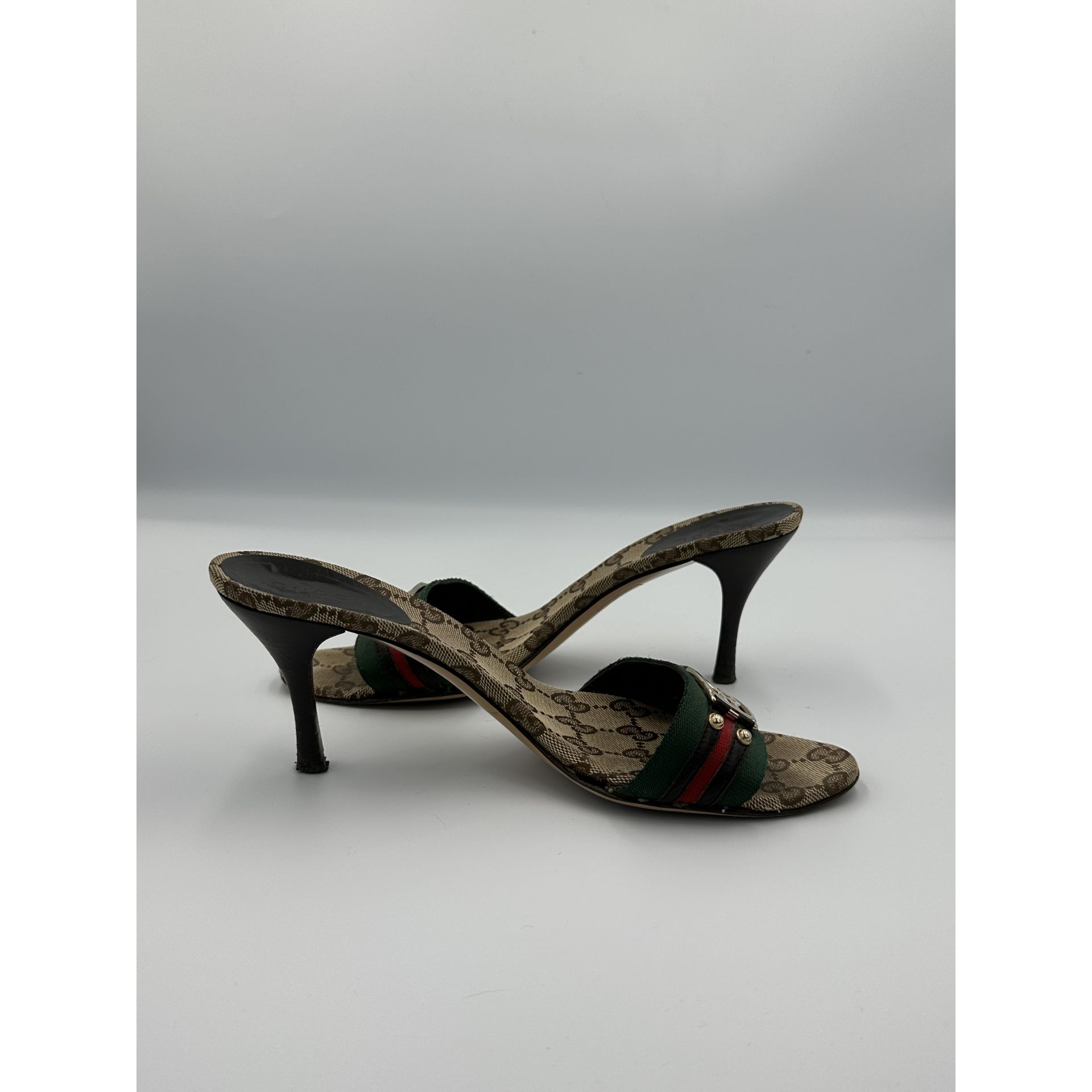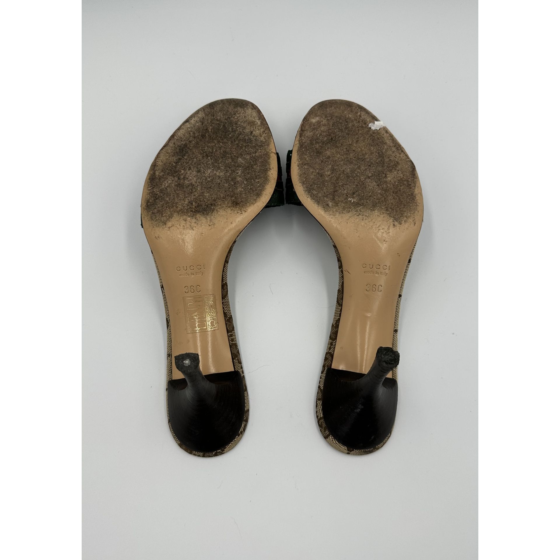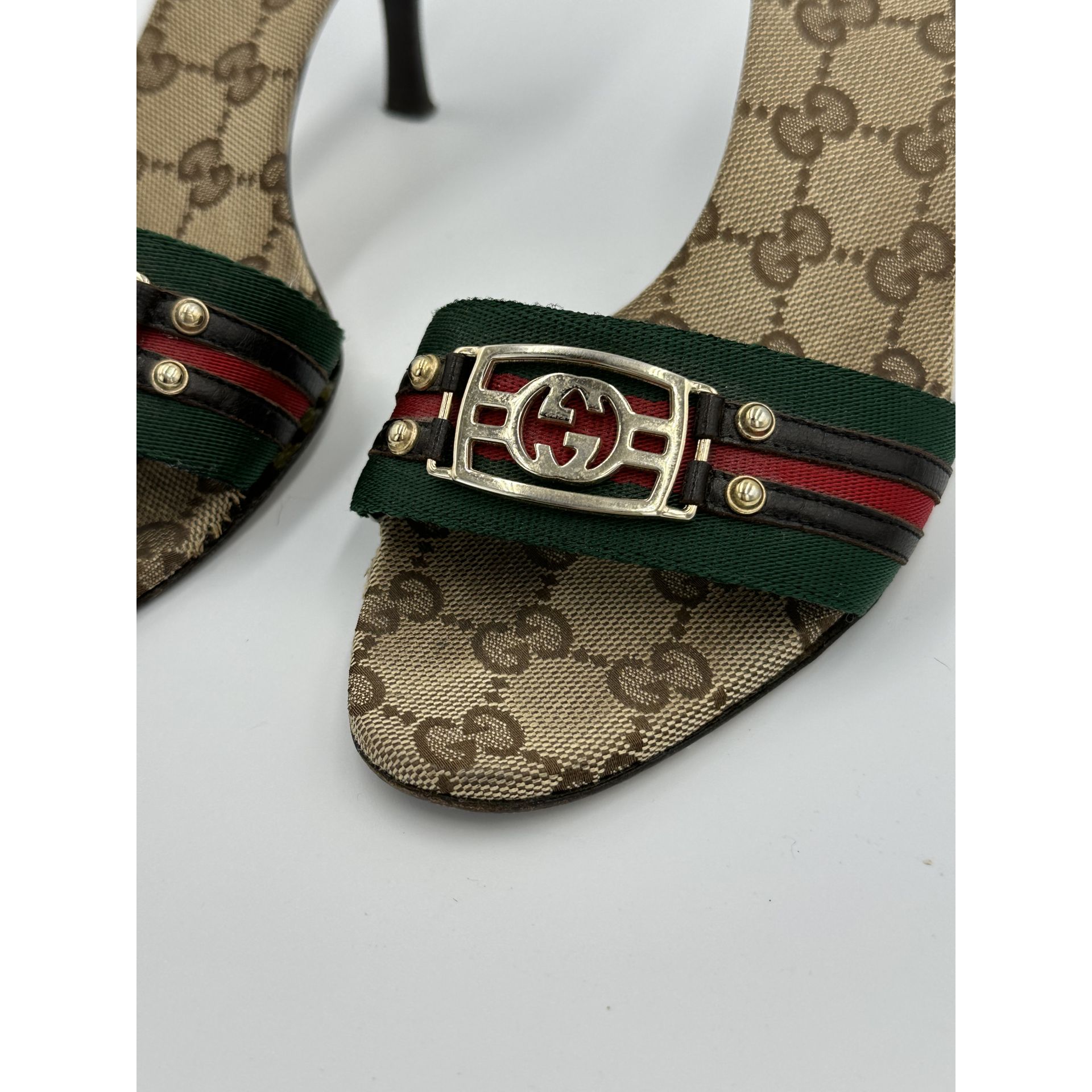 Sandały na obcasie Gucci z tkaniny, ozdobione monogramem i logo GG, w zestawie z oryginalnym pudełkiem