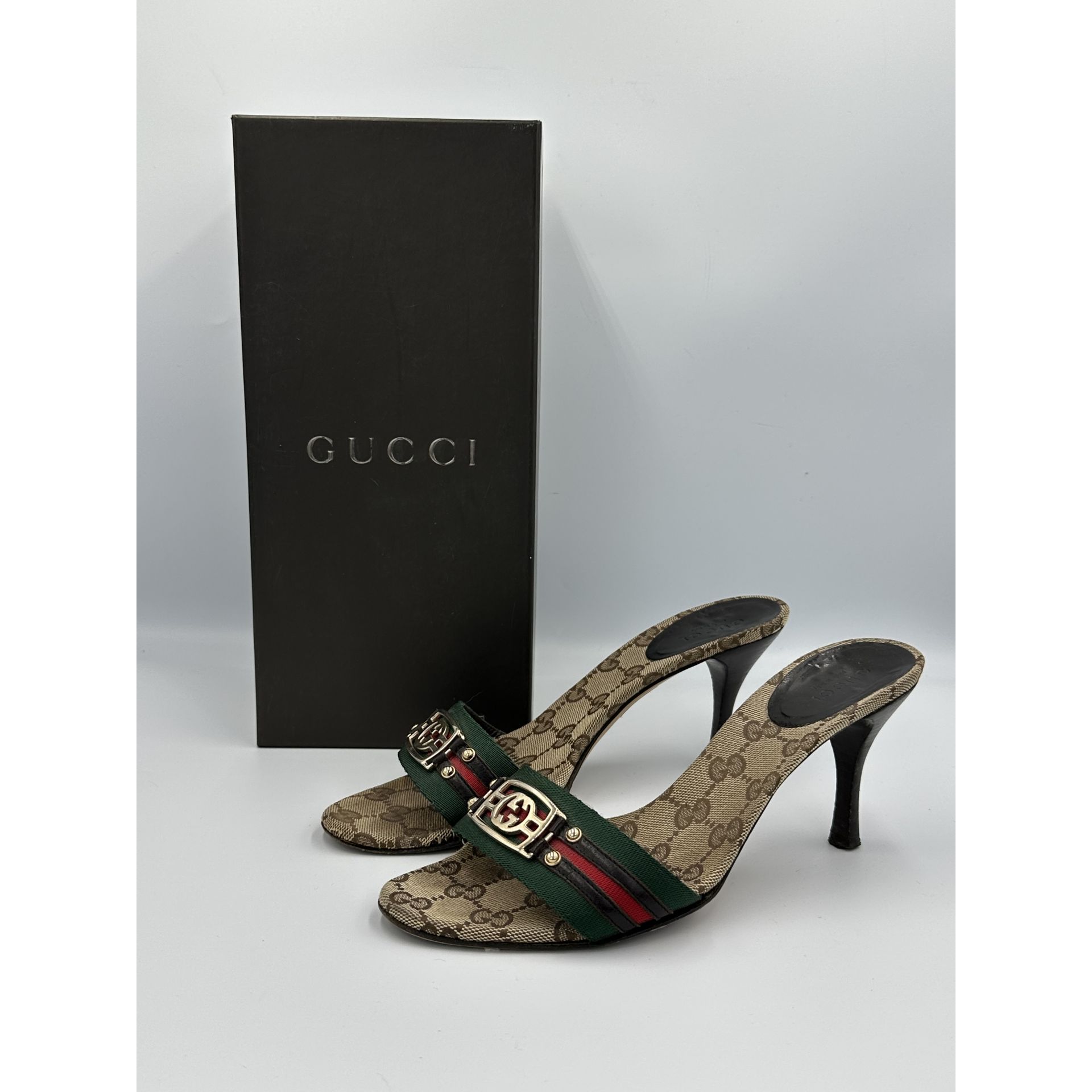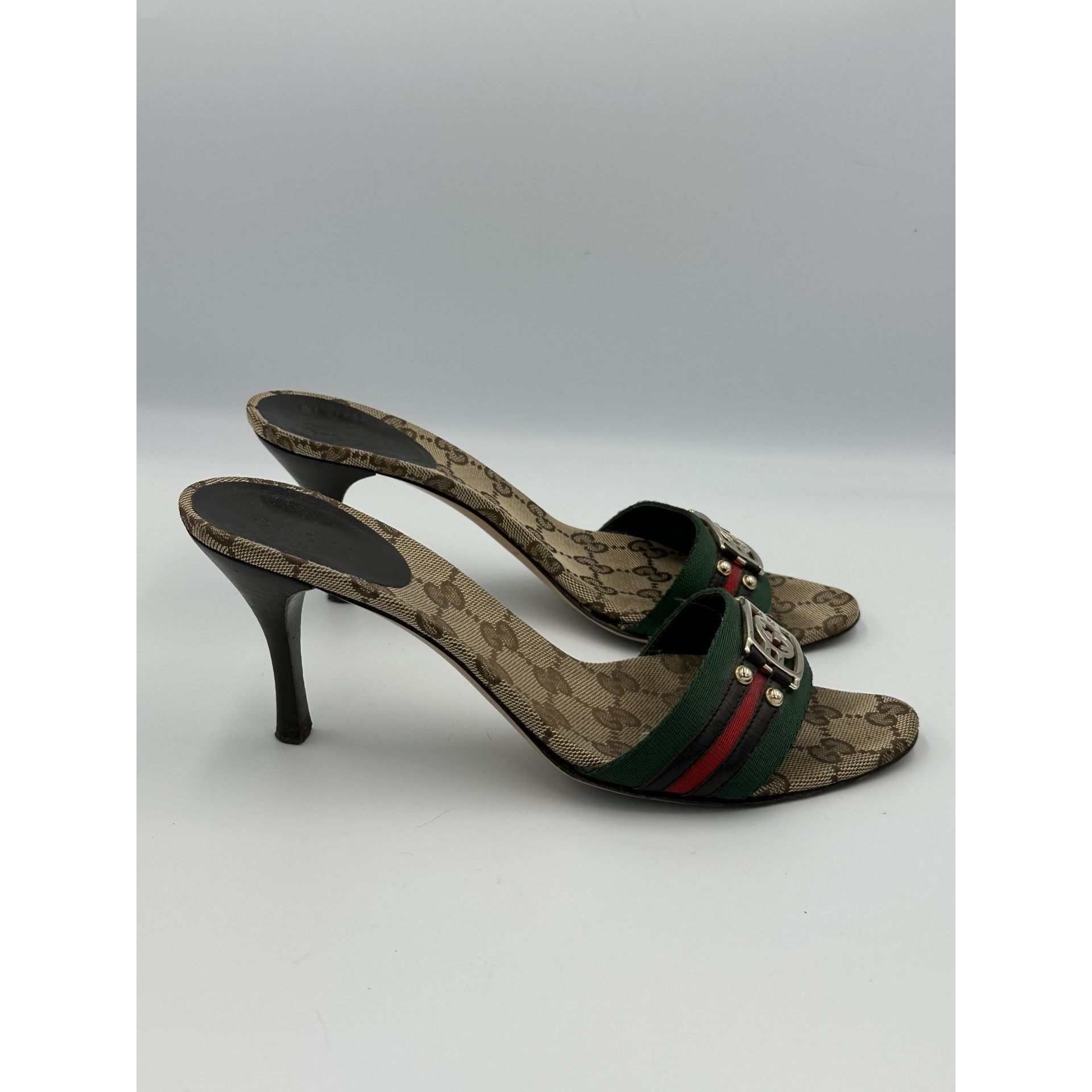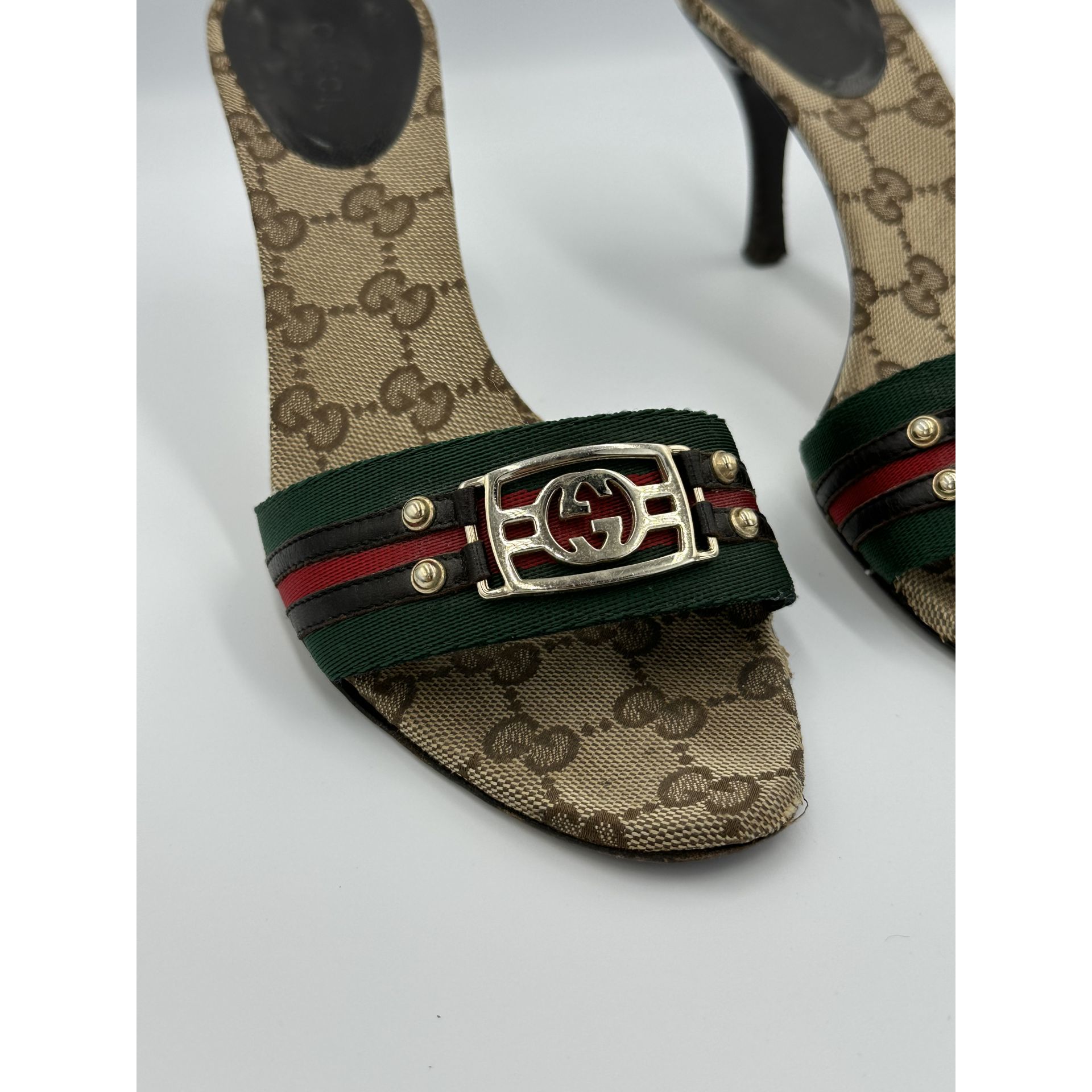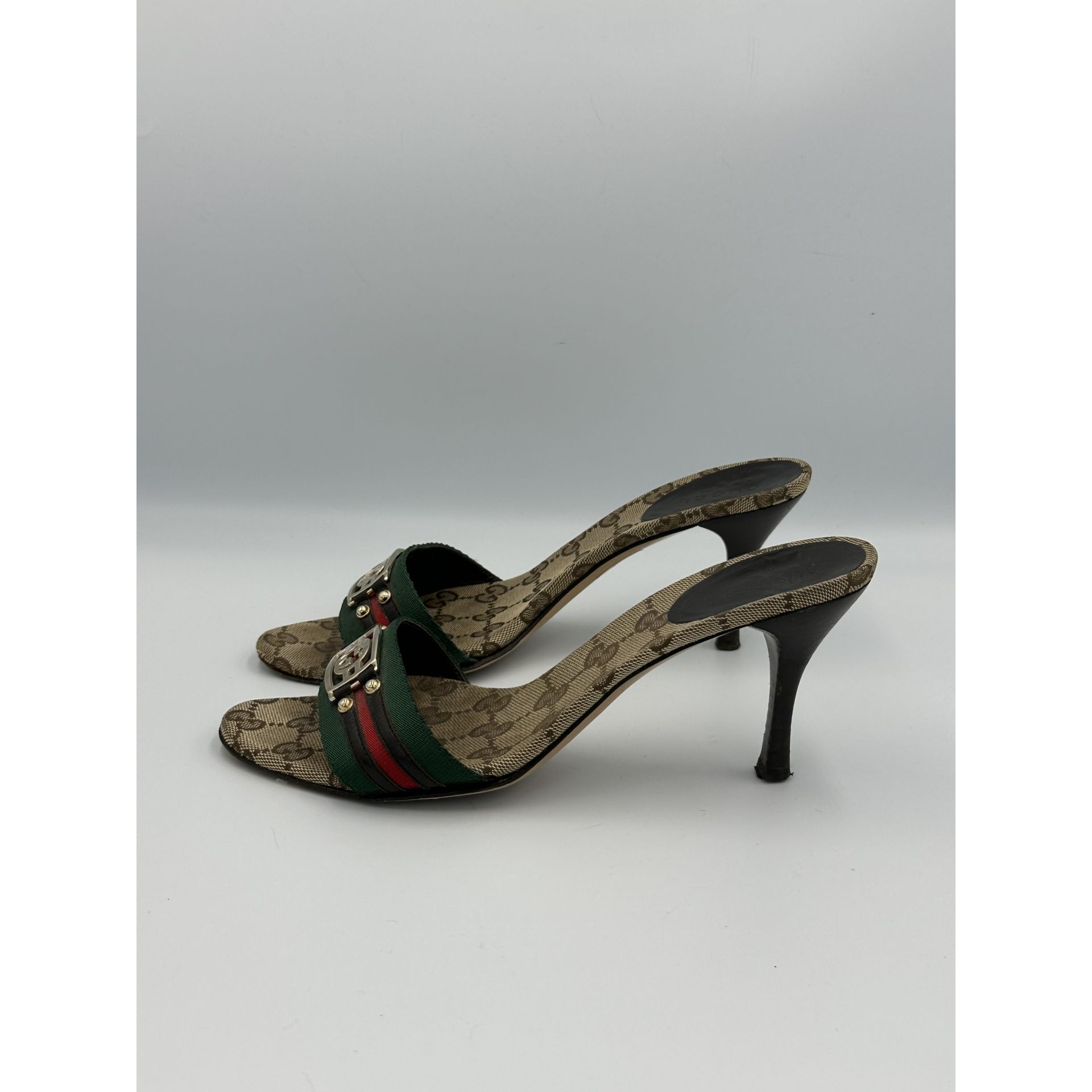 Sandały na obcasie Gucci z tkaniny, ozdobione monogramem i logo GG, w zestawie z oryginalnym pudełkiem