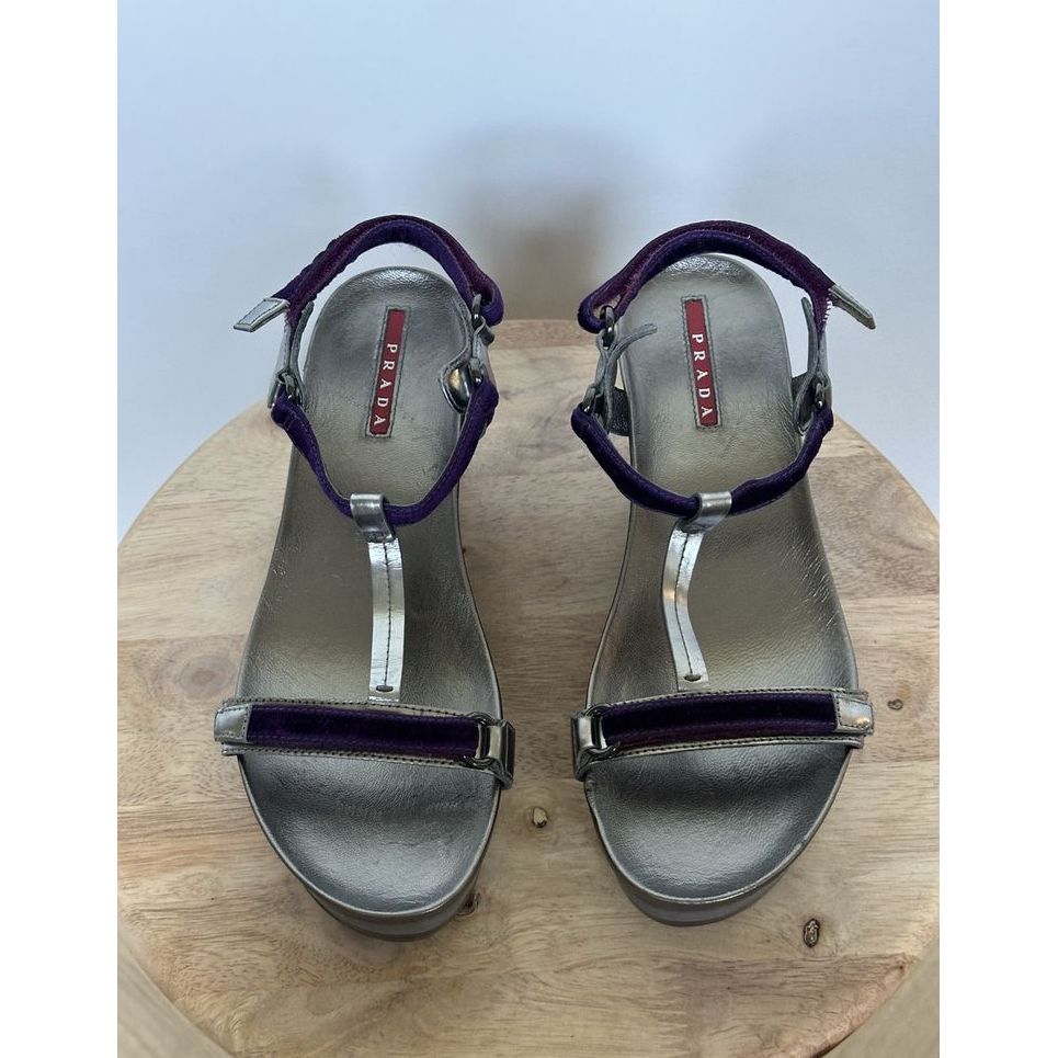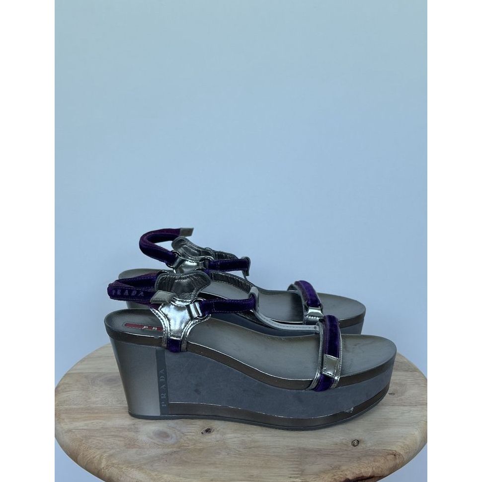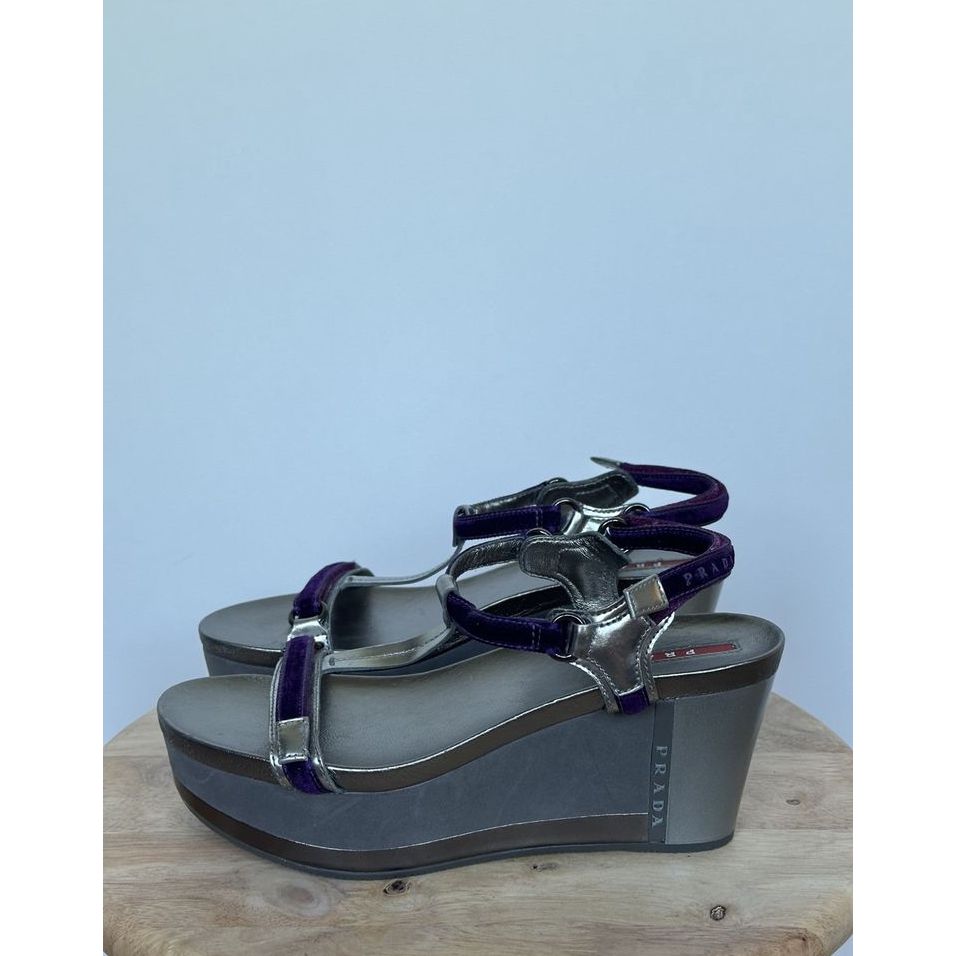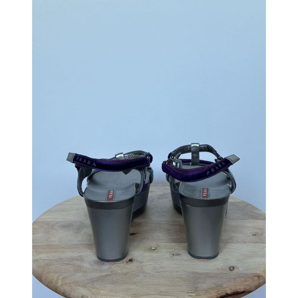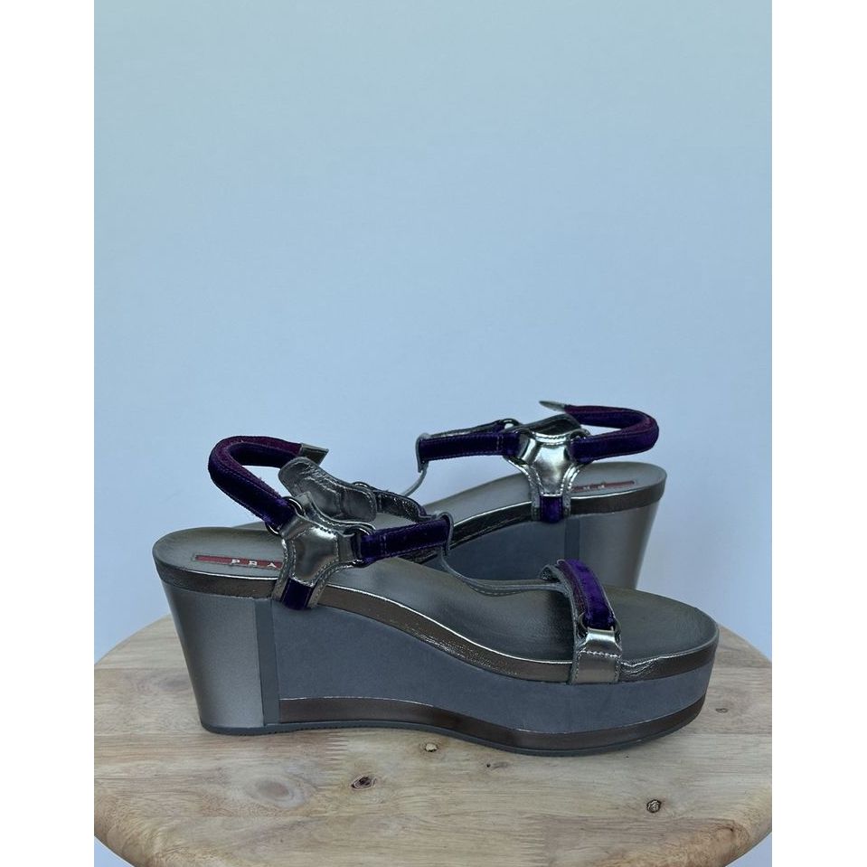 Prada sandały na koturnie, skóra i aksamit, szare / fioletowe, z pudełkiem