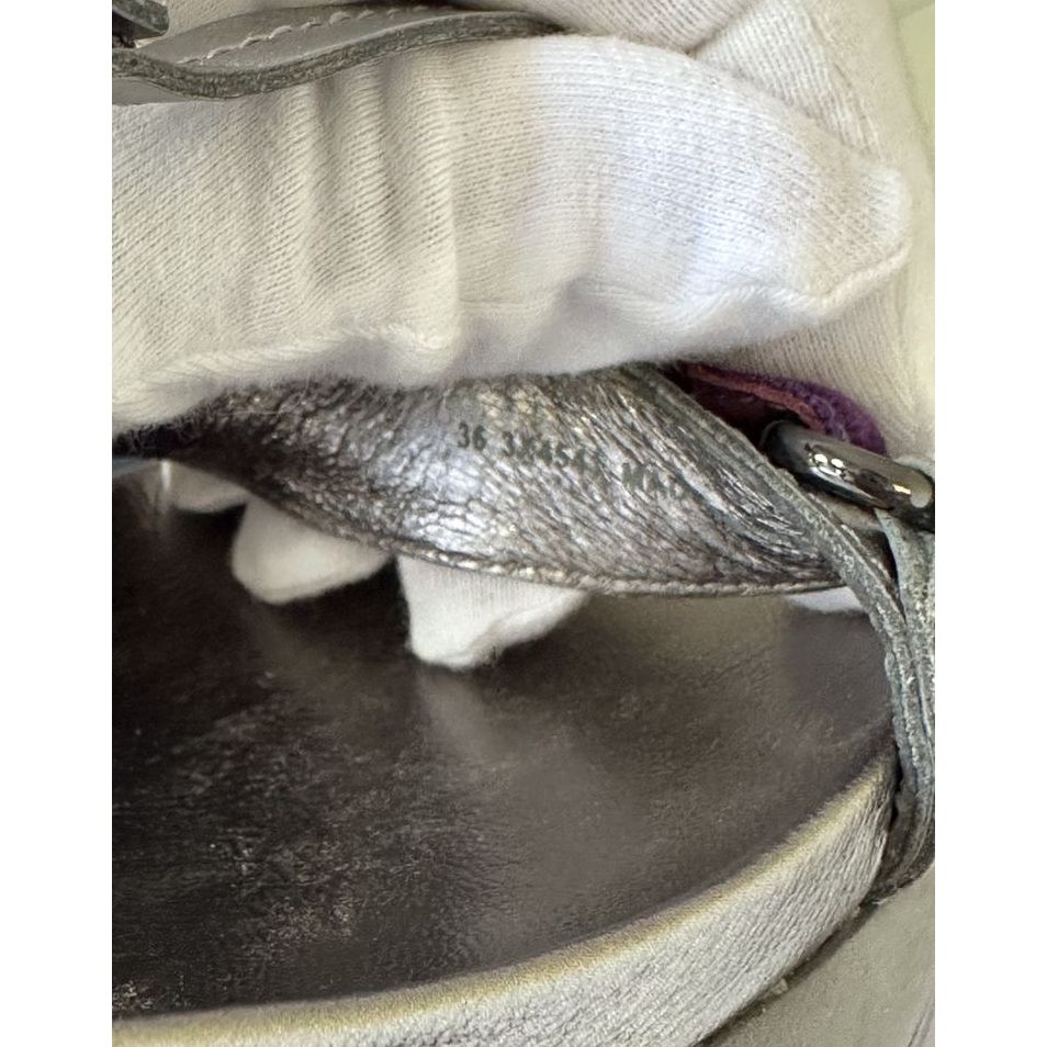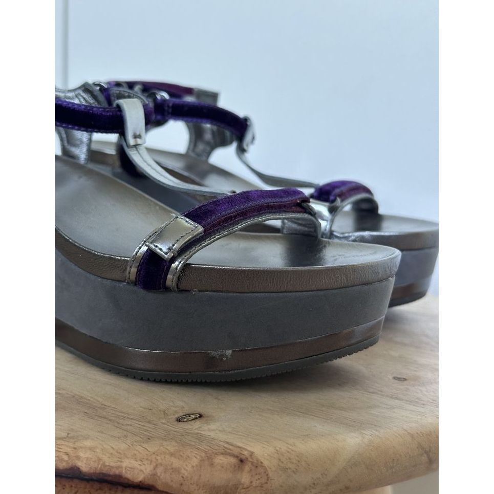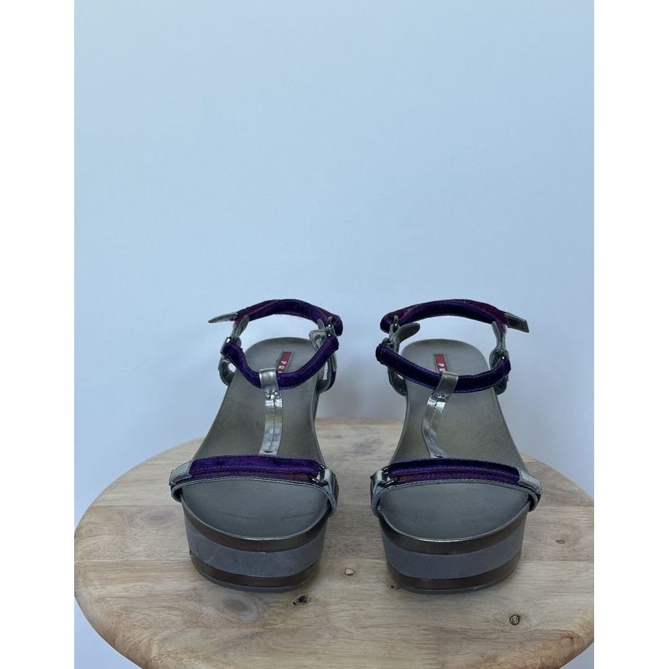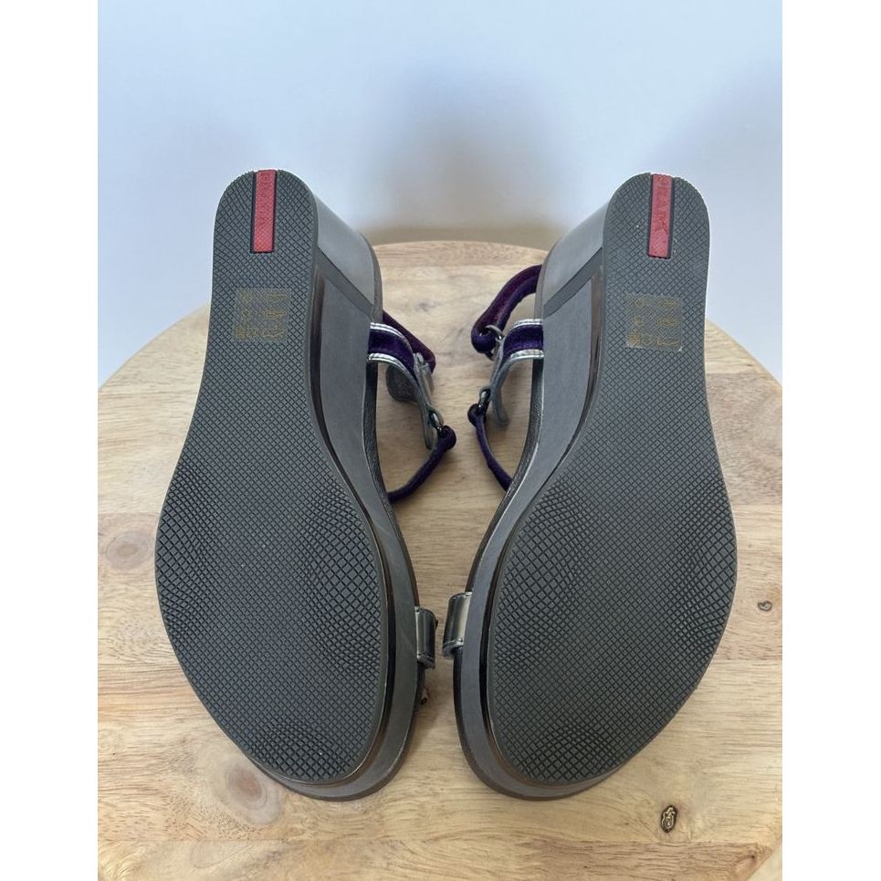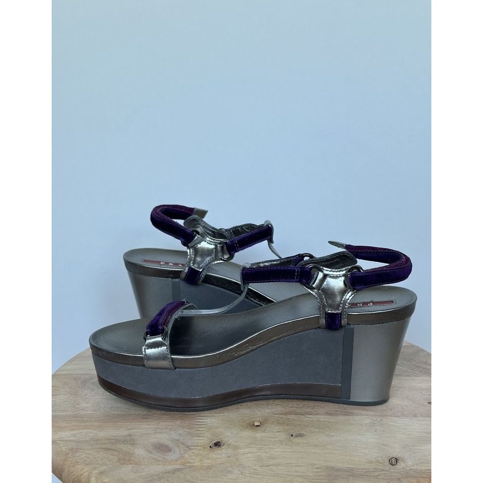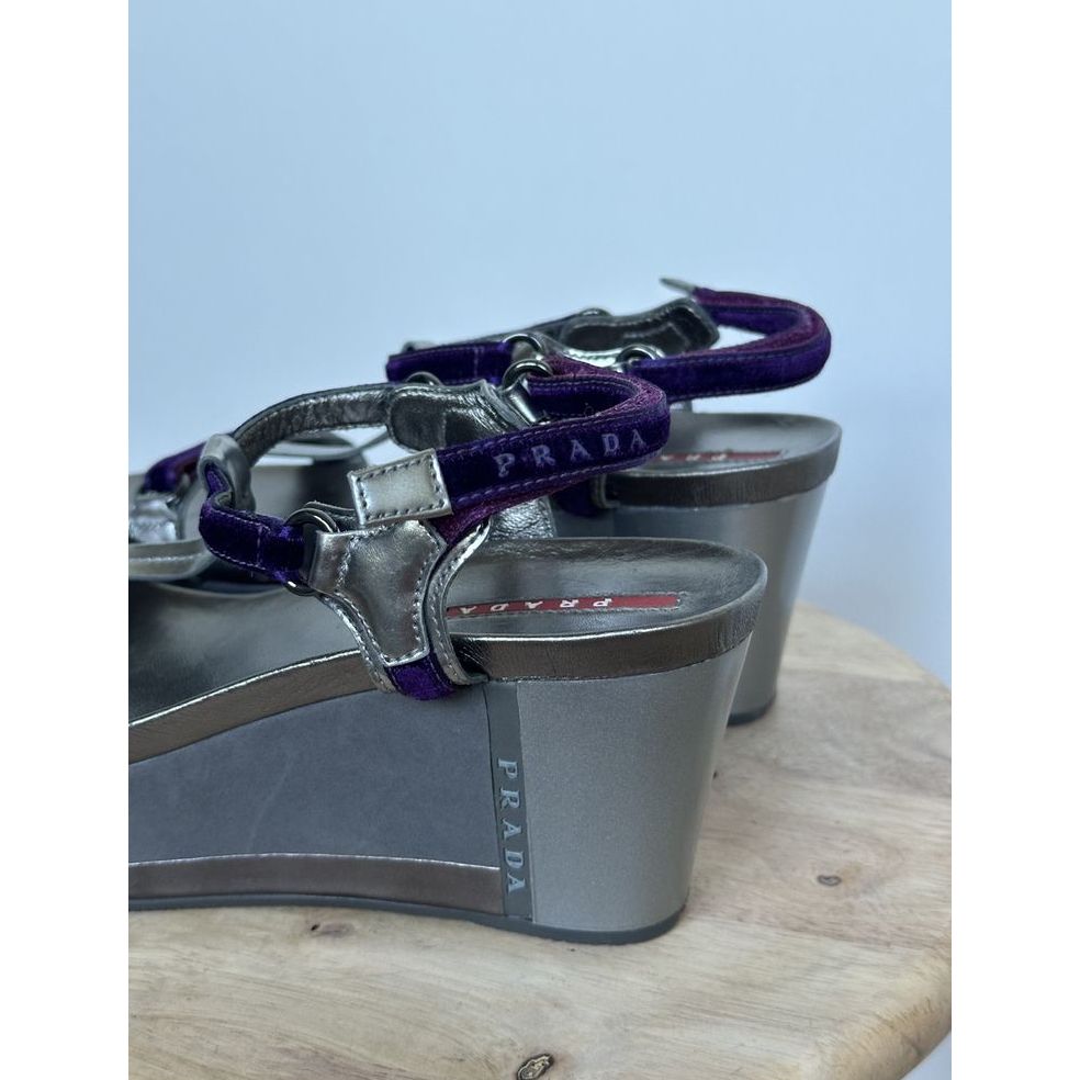 Prada sandały na koturnie, skóra i aksamit, szare / fioletowe, z pudełkiem