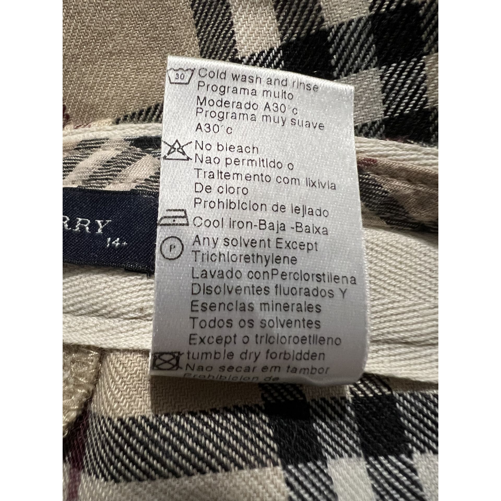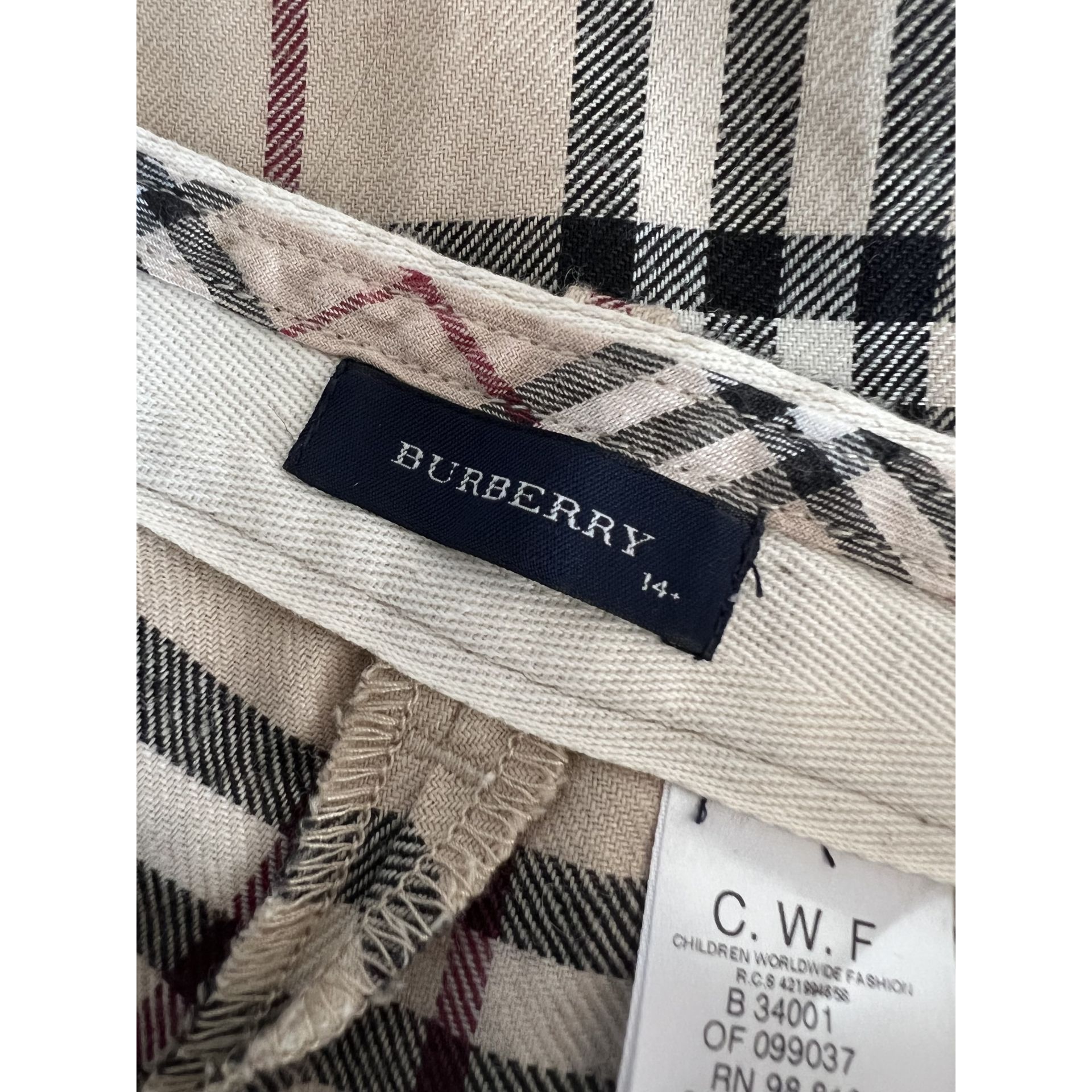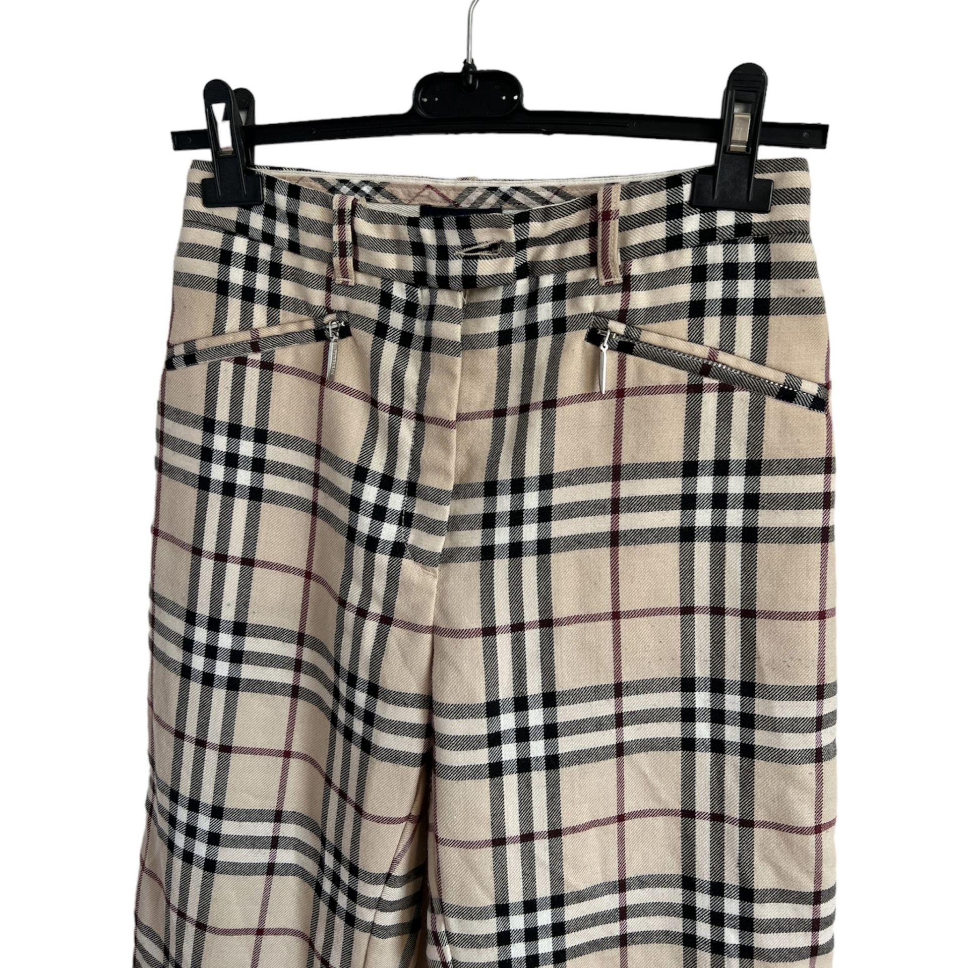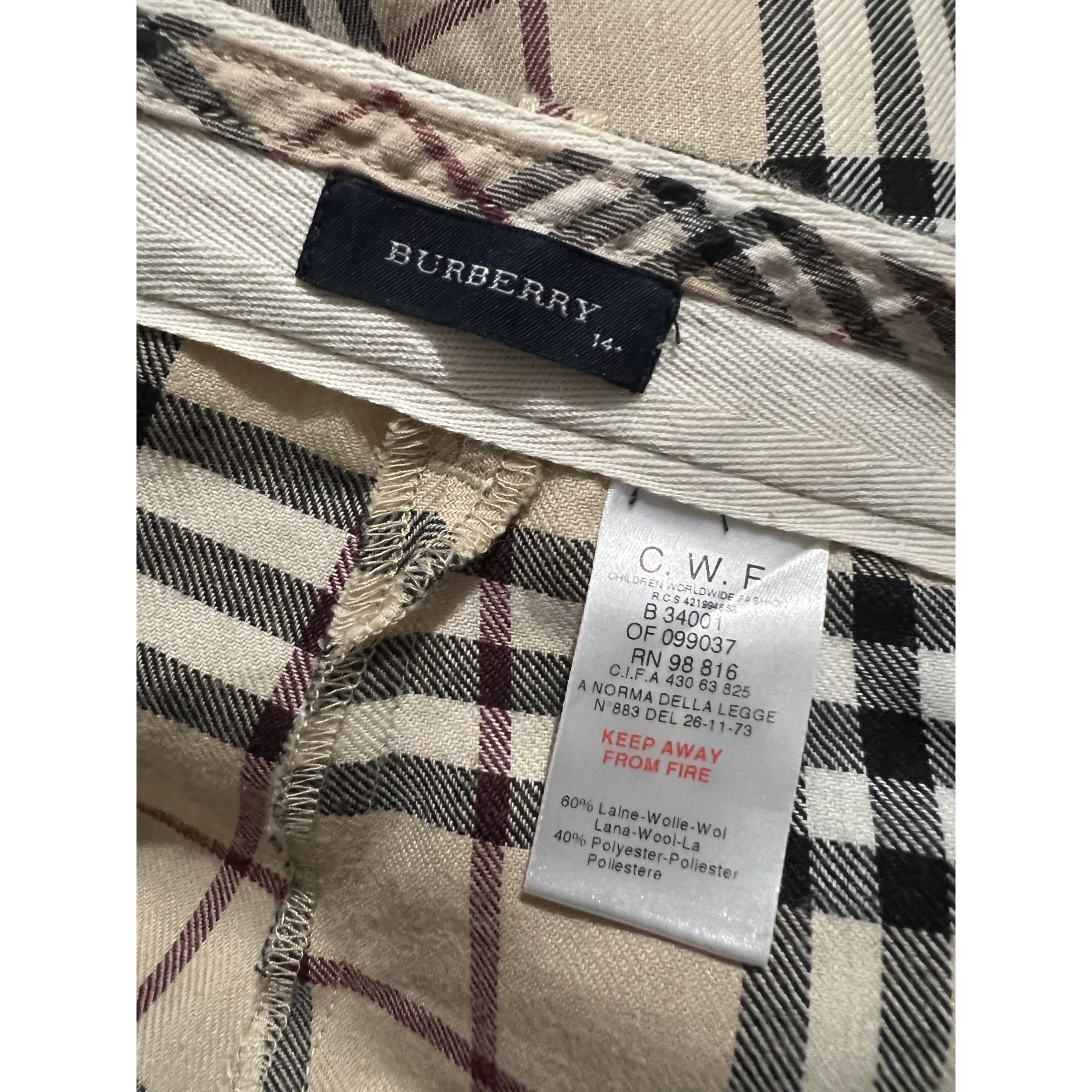 Spodnie w klasyczną kratę burberry o długości 3/4 wykonane z 60% wełny i 40% poliestru. Spodnie na 14 lat. Szerokość 33 cm, długość 74 cm.