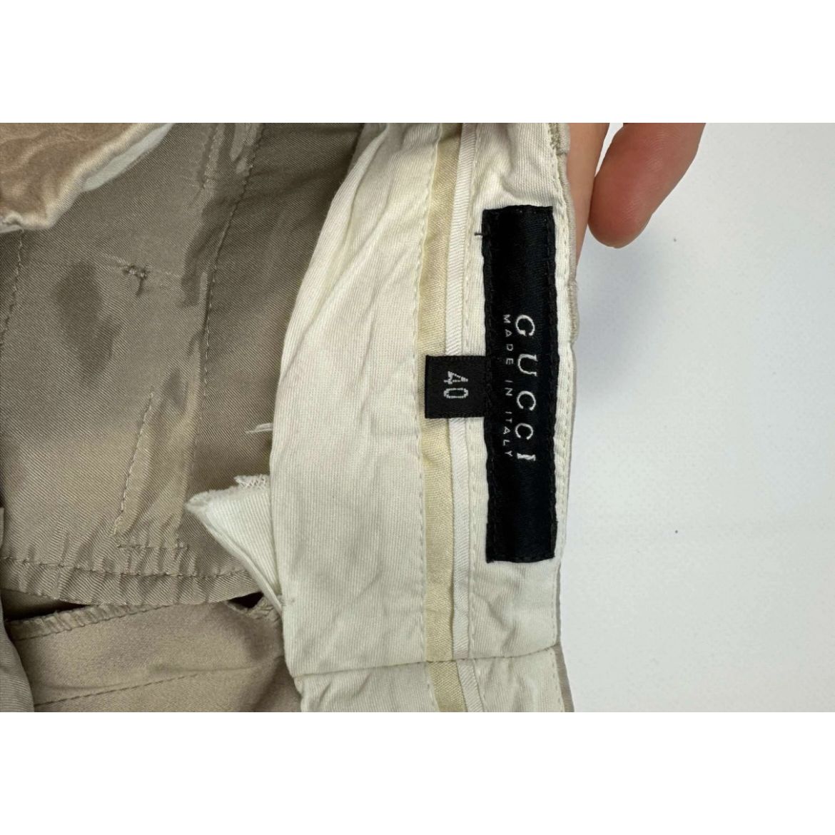 Spodnie damskie Gucci w kolorze beżowym. Przedmiot w bardzo dobrym stanie, posiada dwie malutkie plamki pokazane na zdjęciach. Materiał bardzo przyjemny w dotyku. Rozmiar 40 (włoski). Wymiar szerokości w biodrach jest wymiarem szerokości w pasie! Dodatkowo mogę wysłać w wiadomości prywatnej wymiar szerokości w biodrach. Proszę o przemyślane zakupy, ponieważ nie przyjmuję zwrotów.