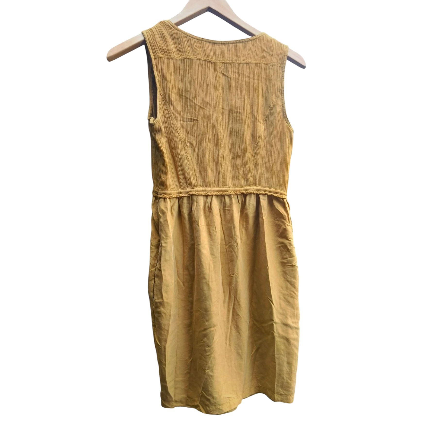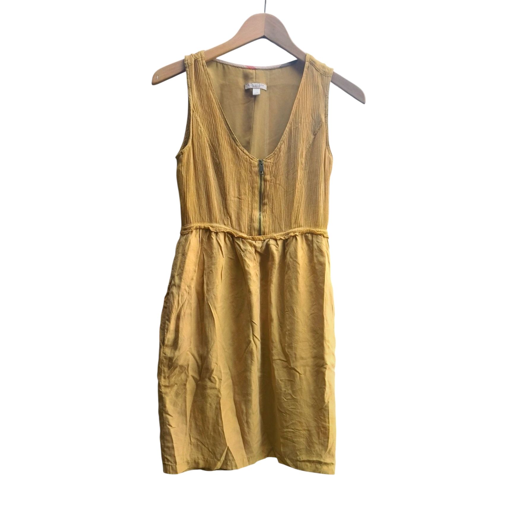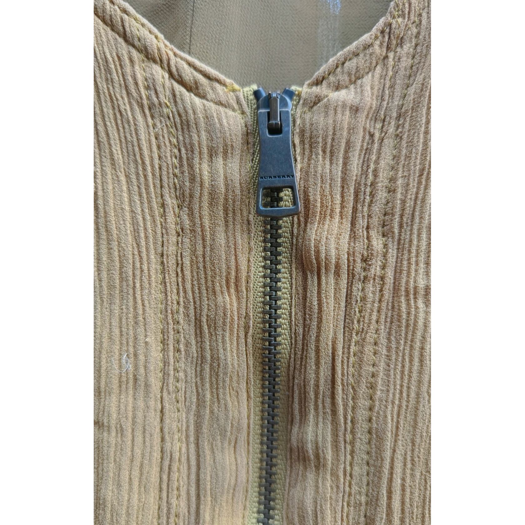 Burberry Brit piekna letnia sukienka w musztardowym odcieniu. Idealna na cieplejsze dni, gdyż wykonana jest w 100% z jedwabiu. Logowane końcówka zamka. Zameczek na froncie