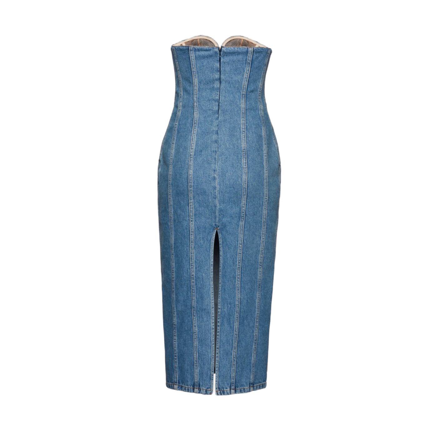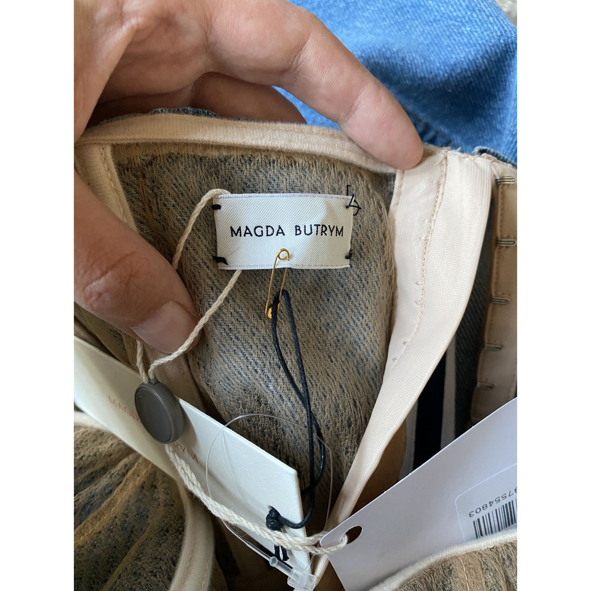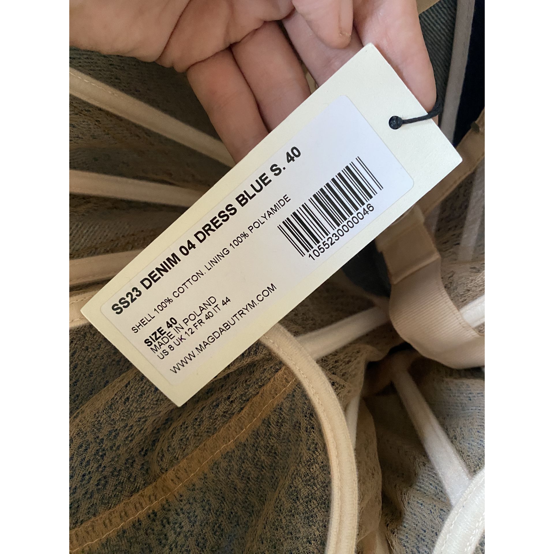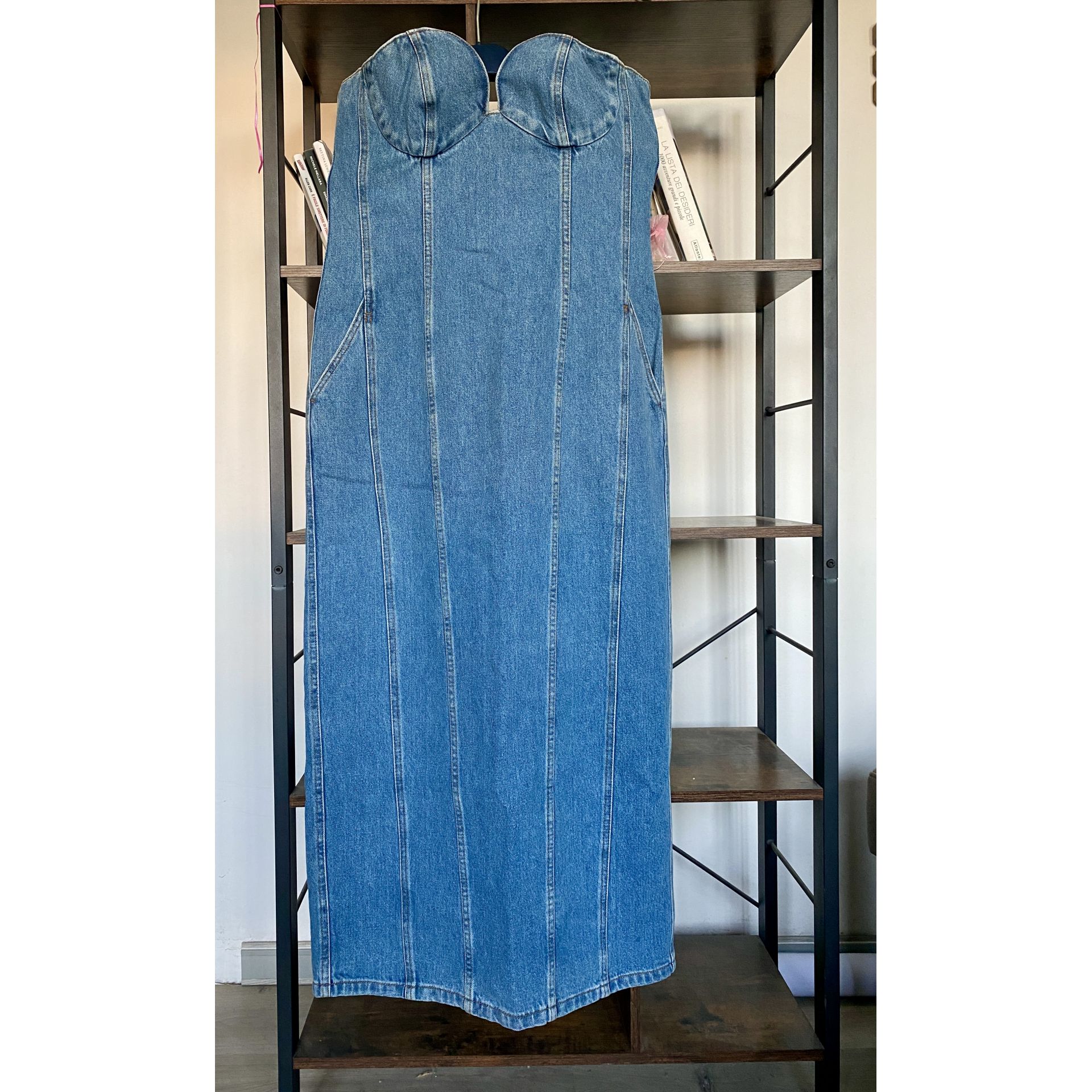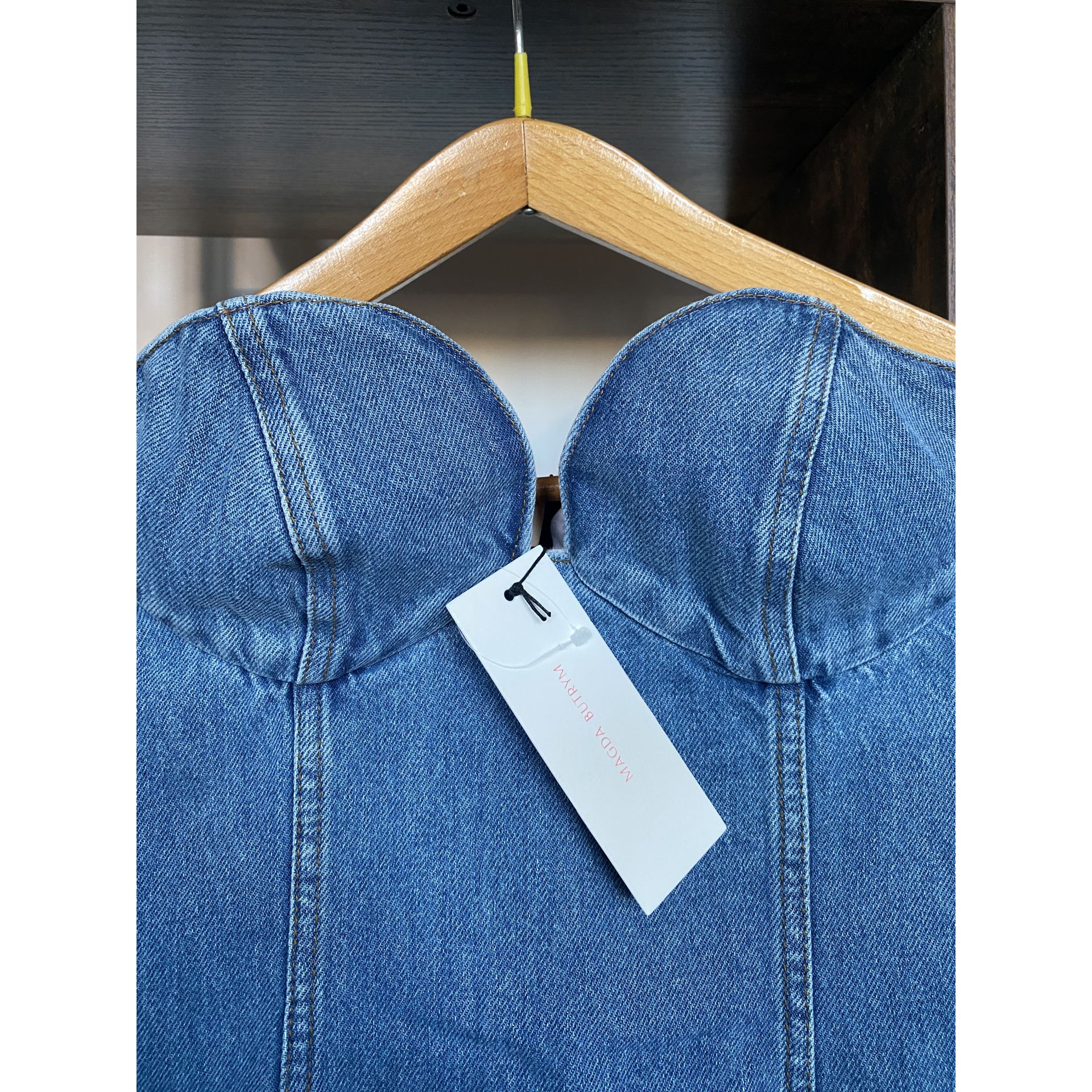 Jeansowa sukienka midi Magdy Butrym. Regularna kolekcja, NIE dla H&M. Bardzo uniwersalna, świetna do szpilek, jeansów, kowbojek, pod sweter czy marynarkę. Piękny wbudowany zapinany na haftki gorset dobrze trzyma biust. Z tyłu suwak. Sukienka jest nowa z metką, nigdy nie założona. Rozmiar S/M. Wymiary na płasko: Biust (mierzony pośrodku miseczek): 41 cm Biodra: 52 cm Długość: 107 cm.