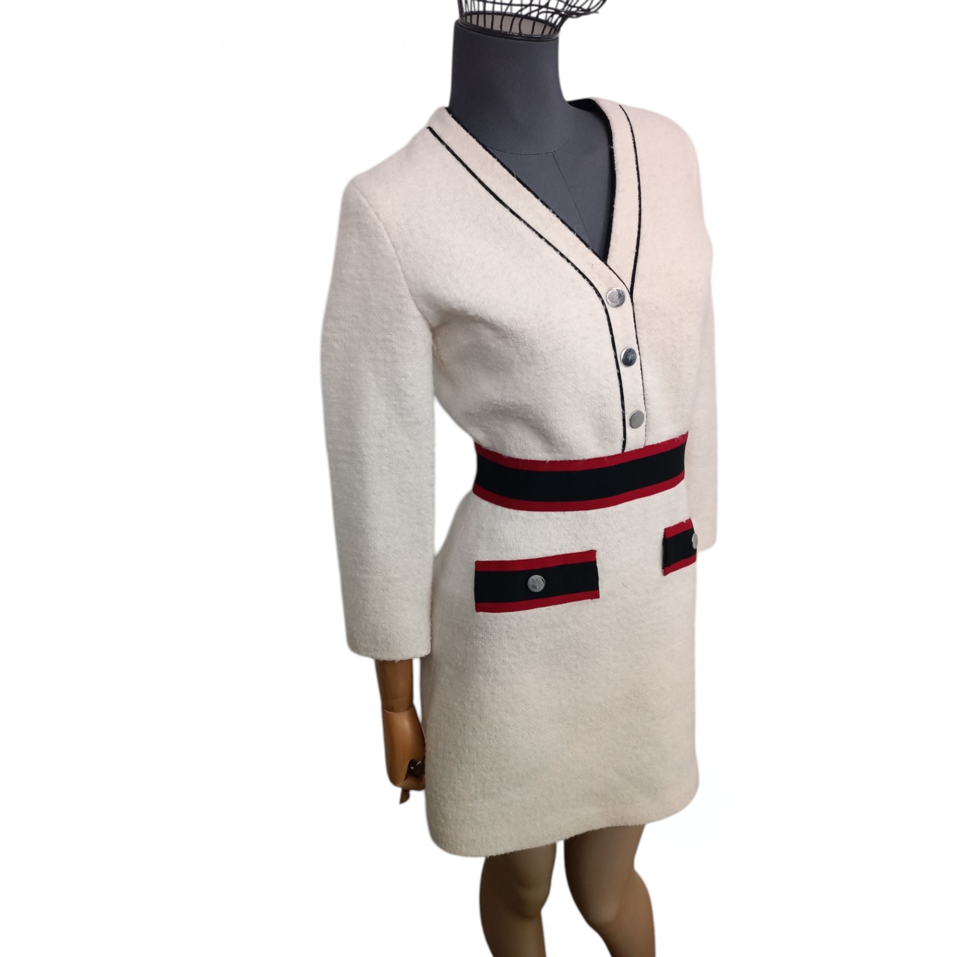 Sukienka ucieleśnia szykowny styl lat 60. XX wieku. Wykonana jest z mieszanki akrylu i wełny. Posiada dekolt w kształcie litery V, zapięcie na guziki, pasek w paski w talii i sztuczne kieszenie z przodu. Skład 44% Akryl , 32% Wełna dziewicza, 19% Poliester, 5% Wełna.