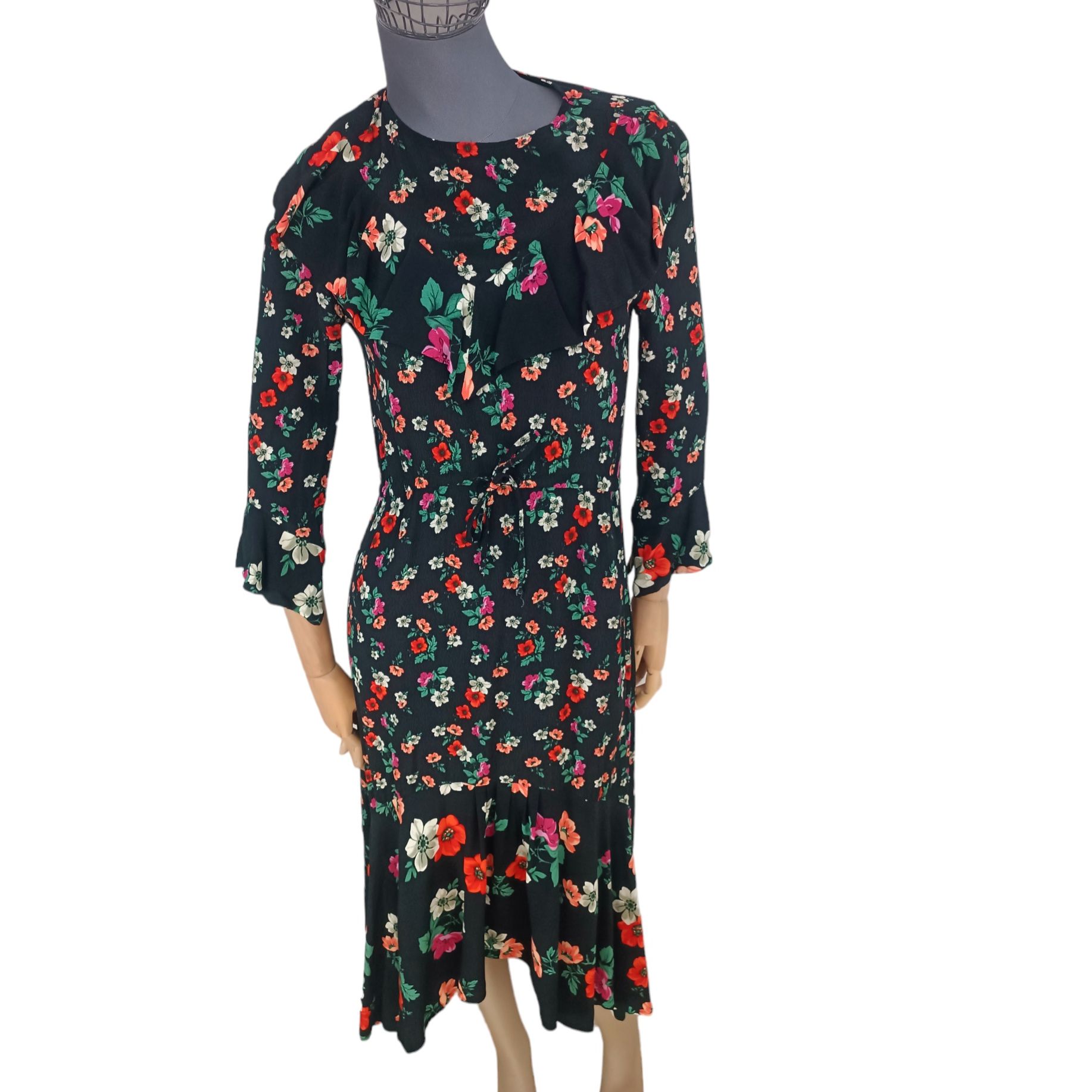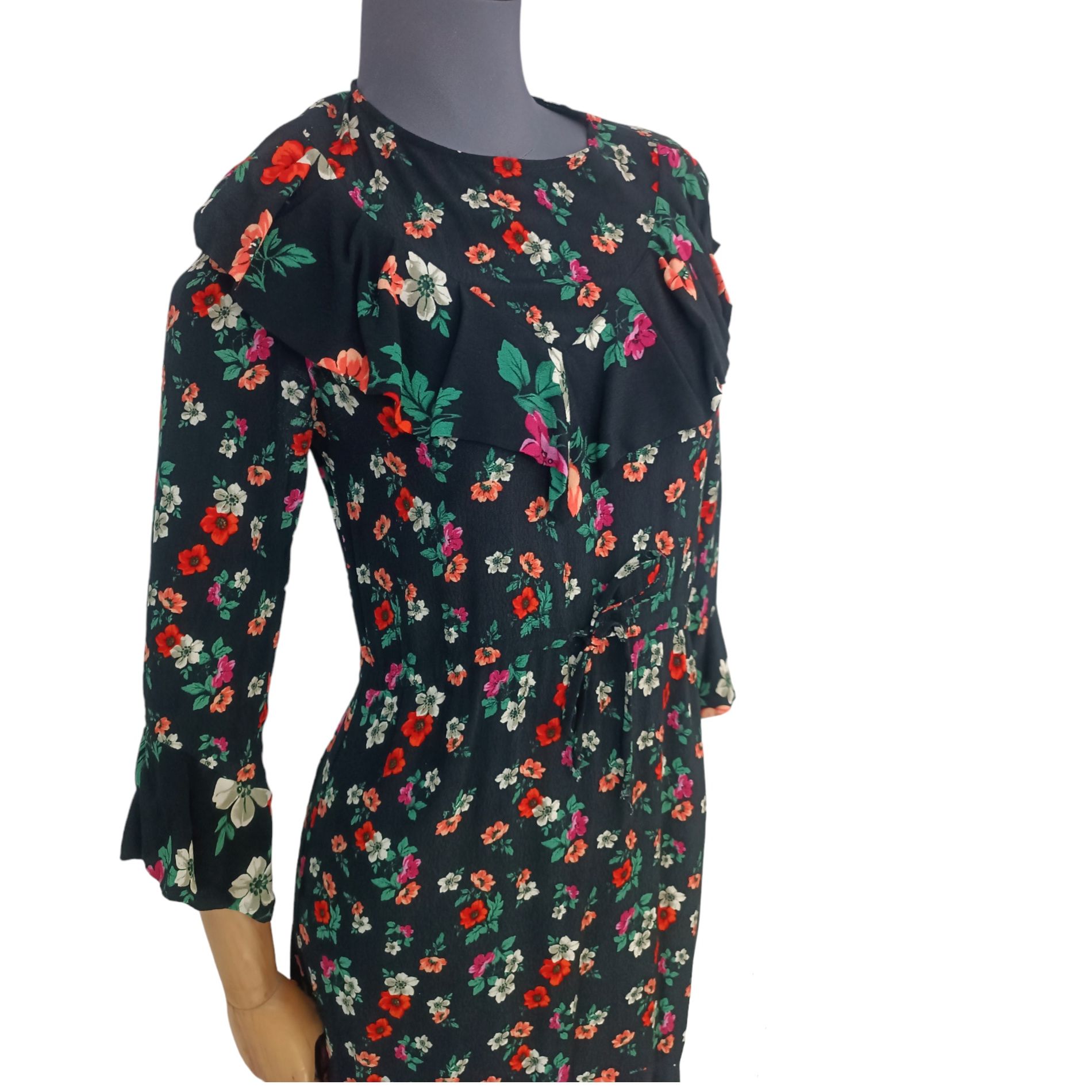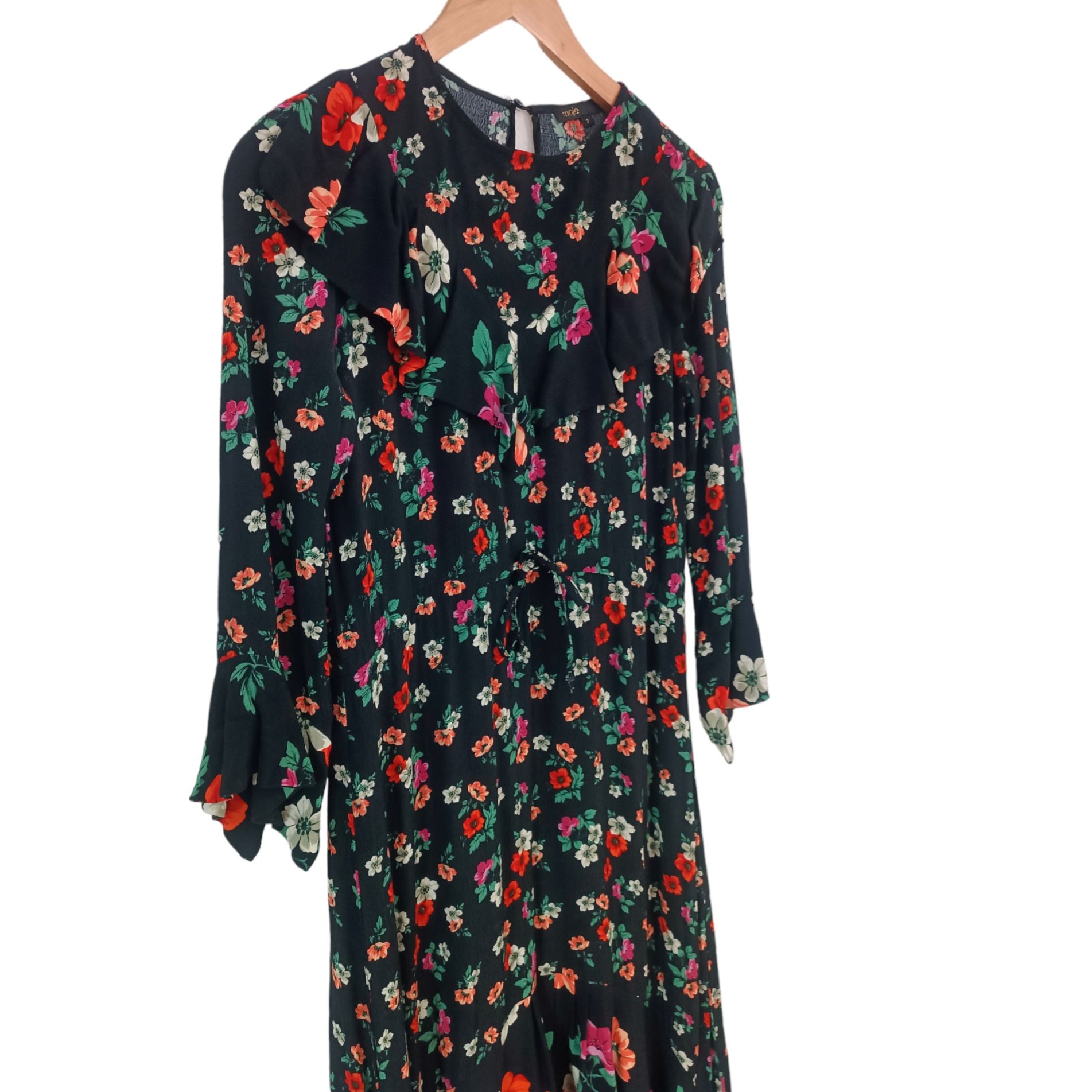 Sukienka francuskiej marki premium MAJE, model Ruffle Imprime. W całości stworzona z wiskozy, kolor czarny z kwiatowym motywem.
