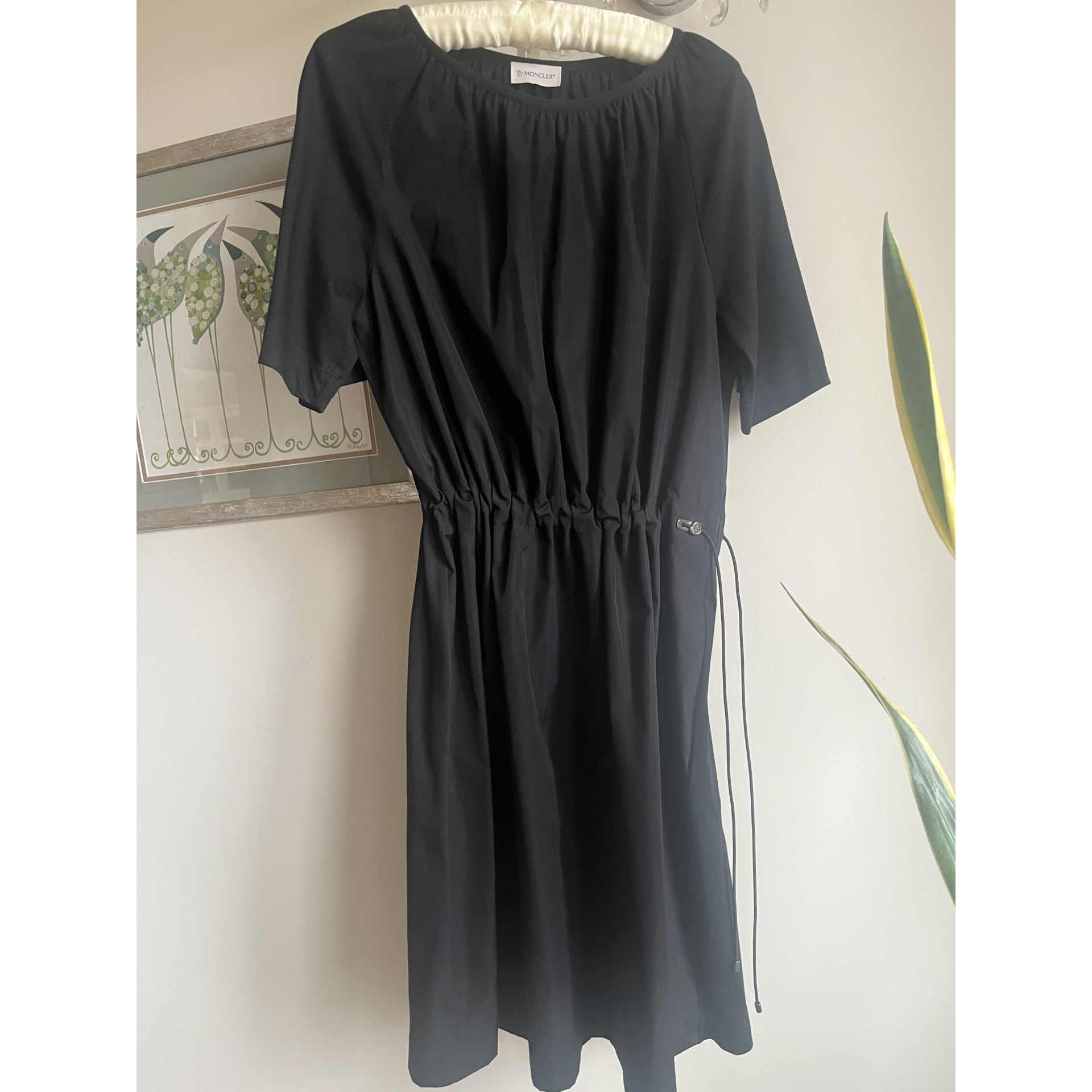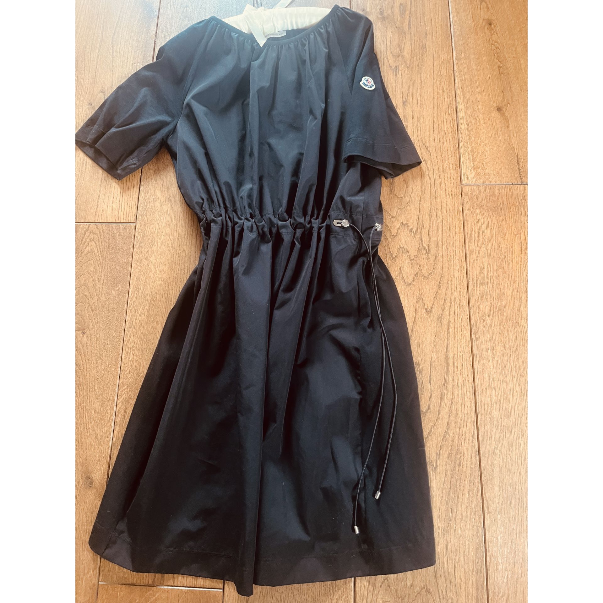 Sukienka Moncler z wyraźnie zaznaczoną talią poprzez tunel z troczkiem. Przód z kontrastowego materiału (mieszanka bawełny i poliestru), tył i rękawy z bawełny.