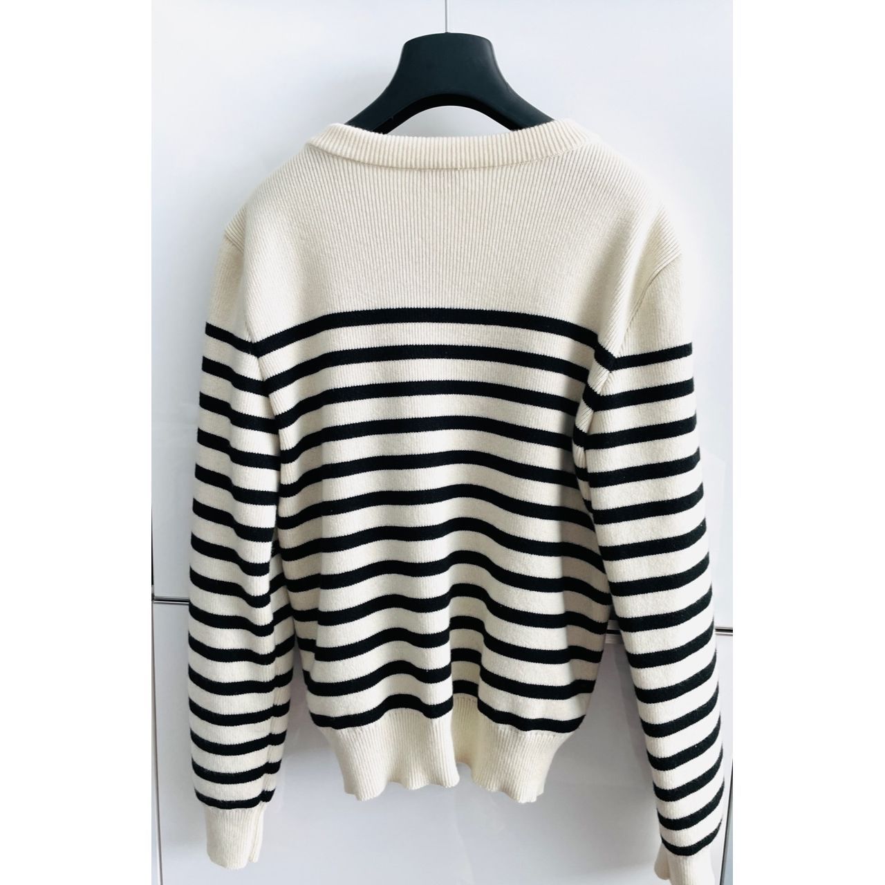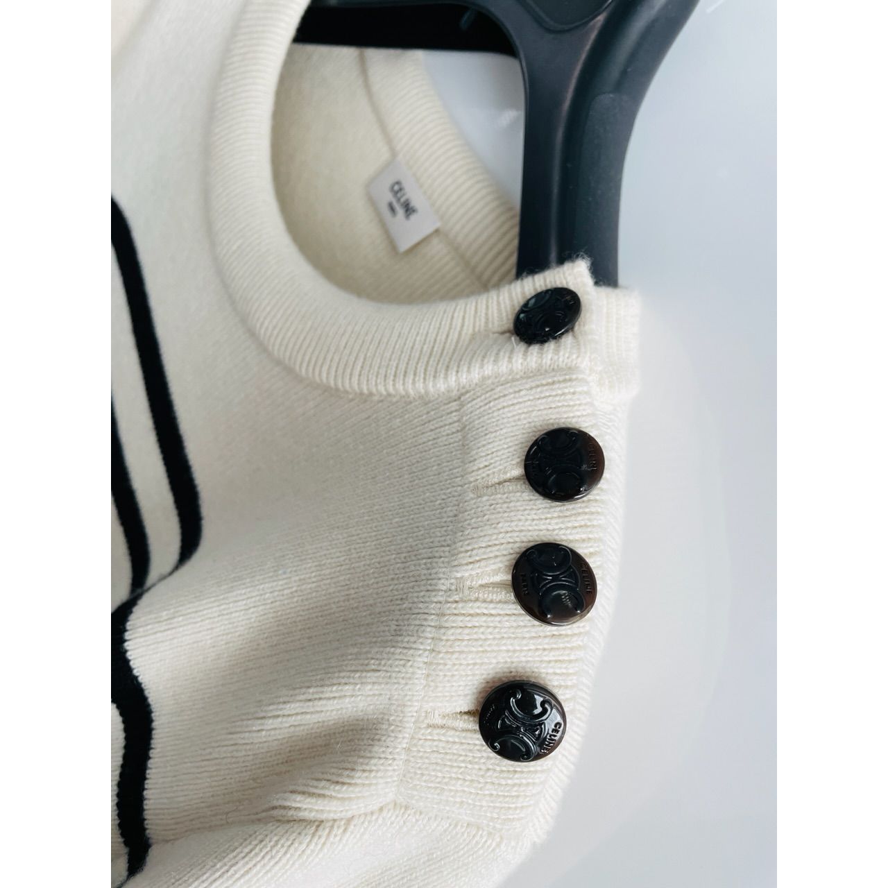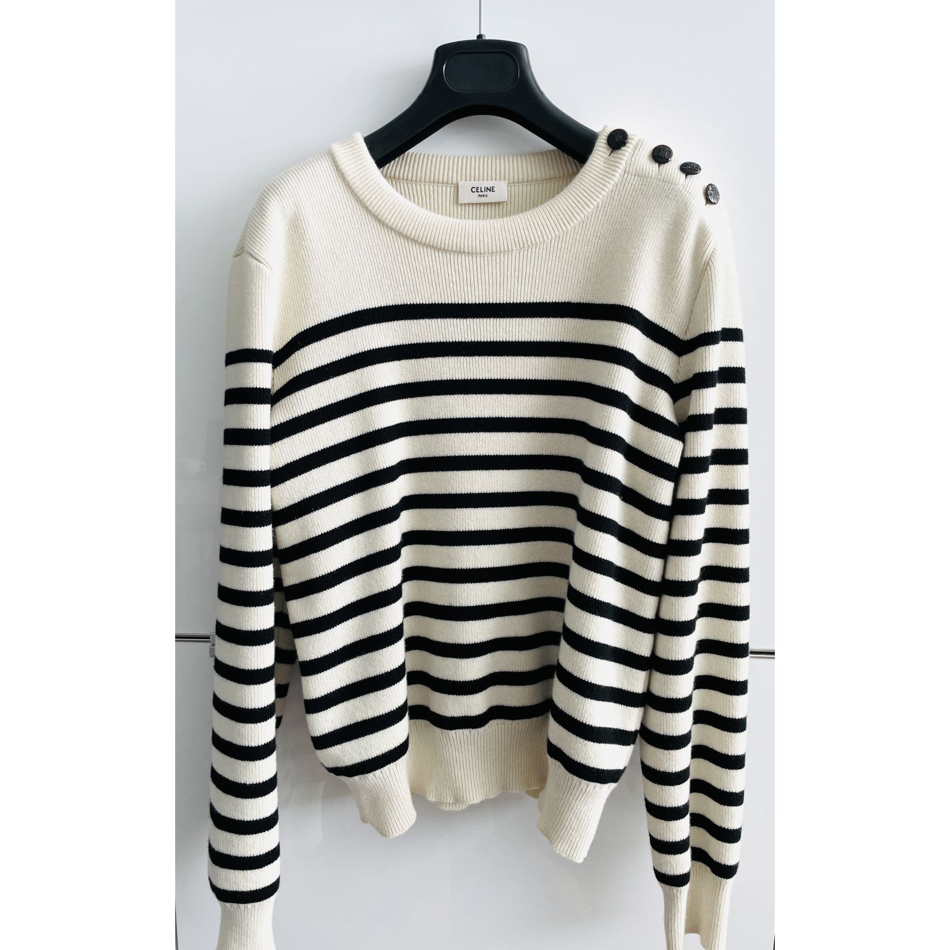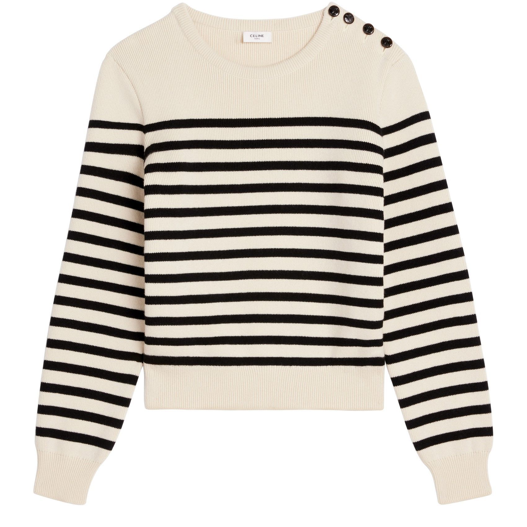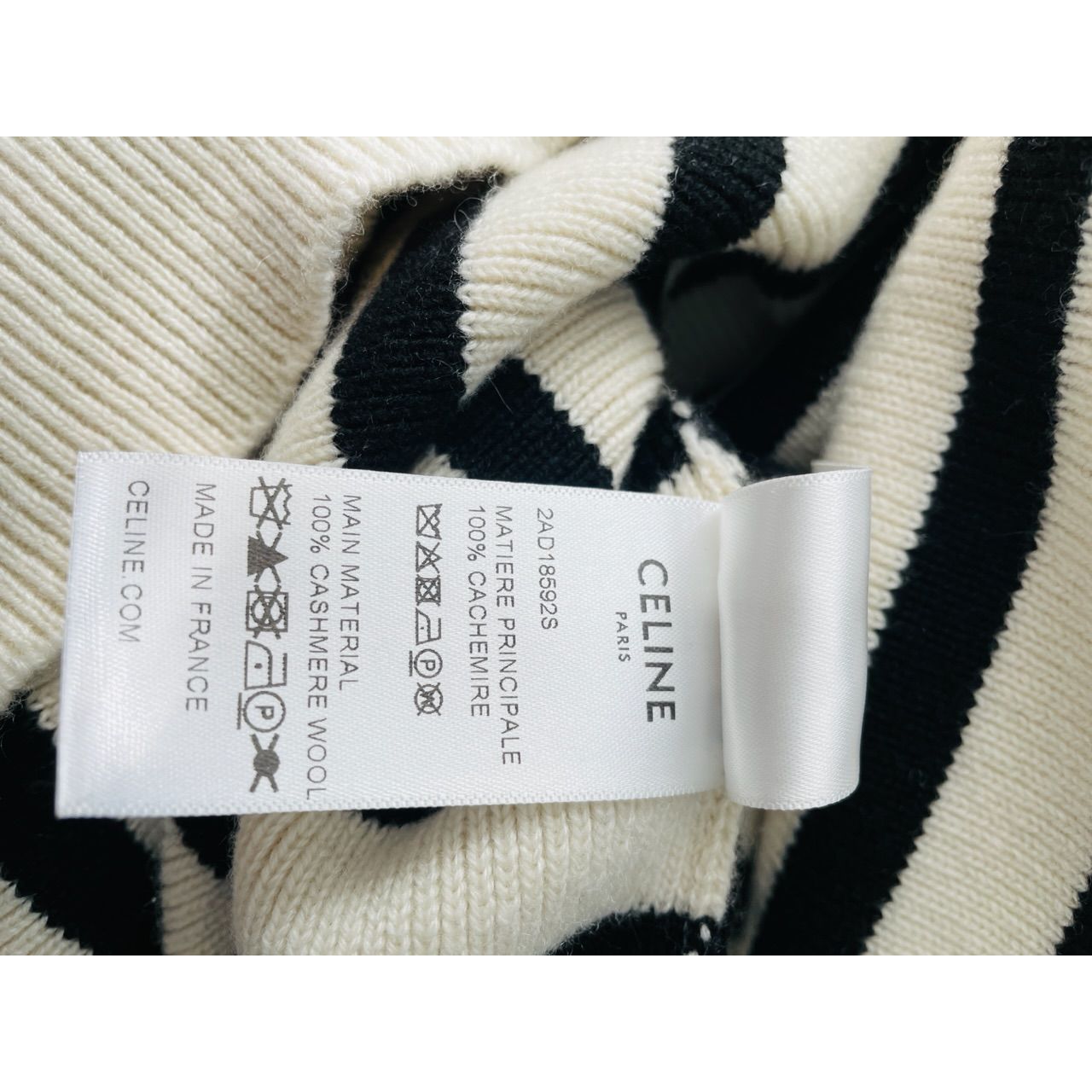 PIĘKNY SWETERK FRANCUSKIEJ MARKI CELINE W STYLU MARYNARSKIM, ZAPINANY NA CZARNE LOGOWANE GUZICZKI NA RAMIENIU, KOLOR ECRU W CZARNE PASECZKI. MATERIAŁ GRUBY MIĘSISTY KASZMIR. KLASYKA I SPORTOWA ELEGANCJA W JEDNYM. STAN BARDZO DOBRY. ROZMIAR S, PASUJE TEŻ NA M.