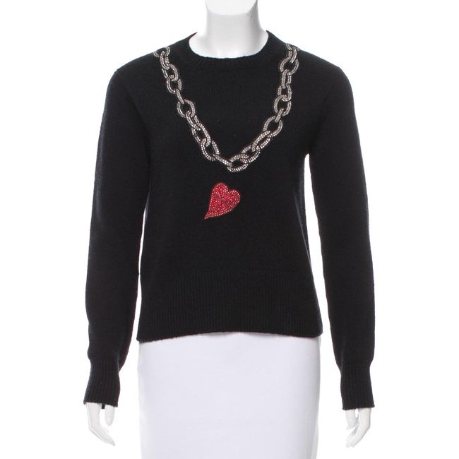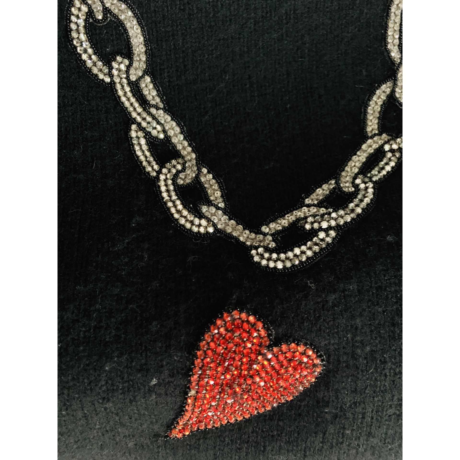 Sweter jest zdobiony łańcuszkiem i sercem na których są przyszyte mieniące się kryształy.