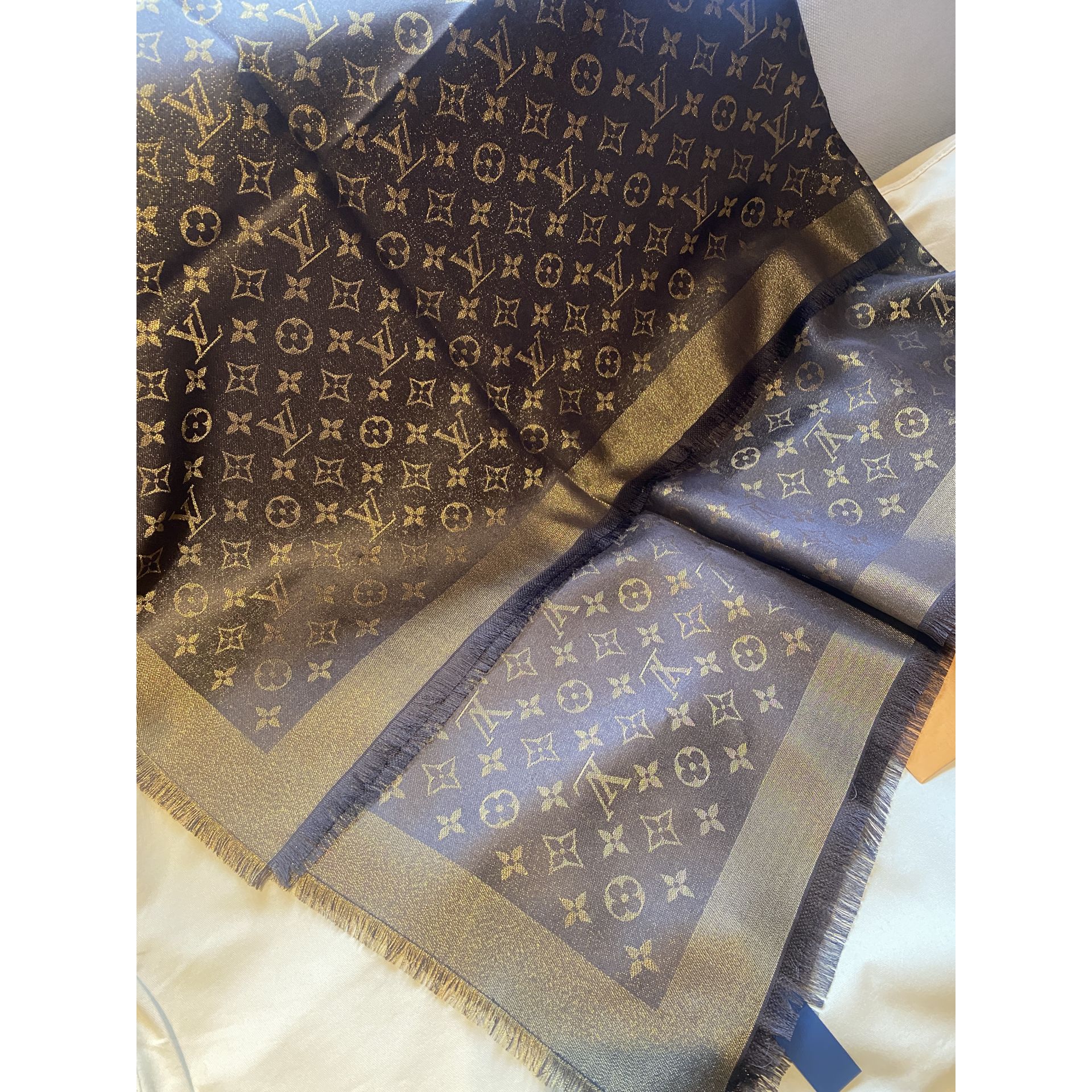 Nieużywany, połyskujący szal, jeszcze z fabrycznymi złożeniami, nieprasowany, dołączam torebkę prezentową z butiku. Wymiary 142 cm x 142 cm. Monogram shine M75122.