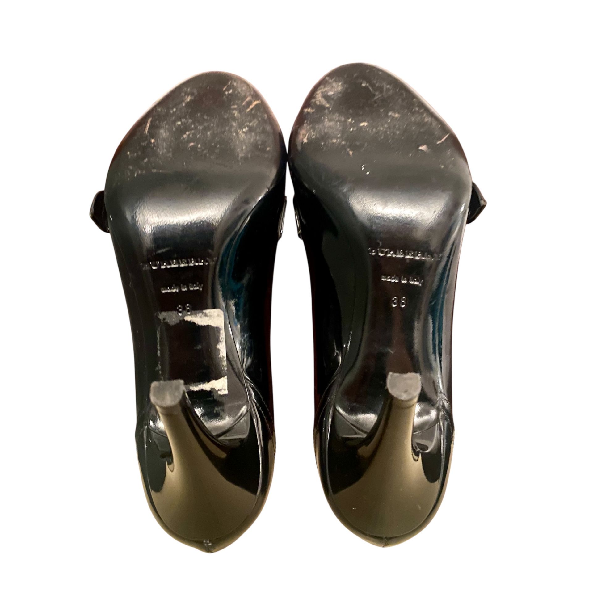 Skóra lakierowana, czarne szpilki Burberry w bardzo dobrym stanie. Bardzo wygodne, napis Burberry na pasku na podbiciu, dzięki niemu but dobrze trzyma się na stopie. Rozmiar 38. Proszę o przemyślane zakupy, ponieważ nie przyjmuję zwrotów.