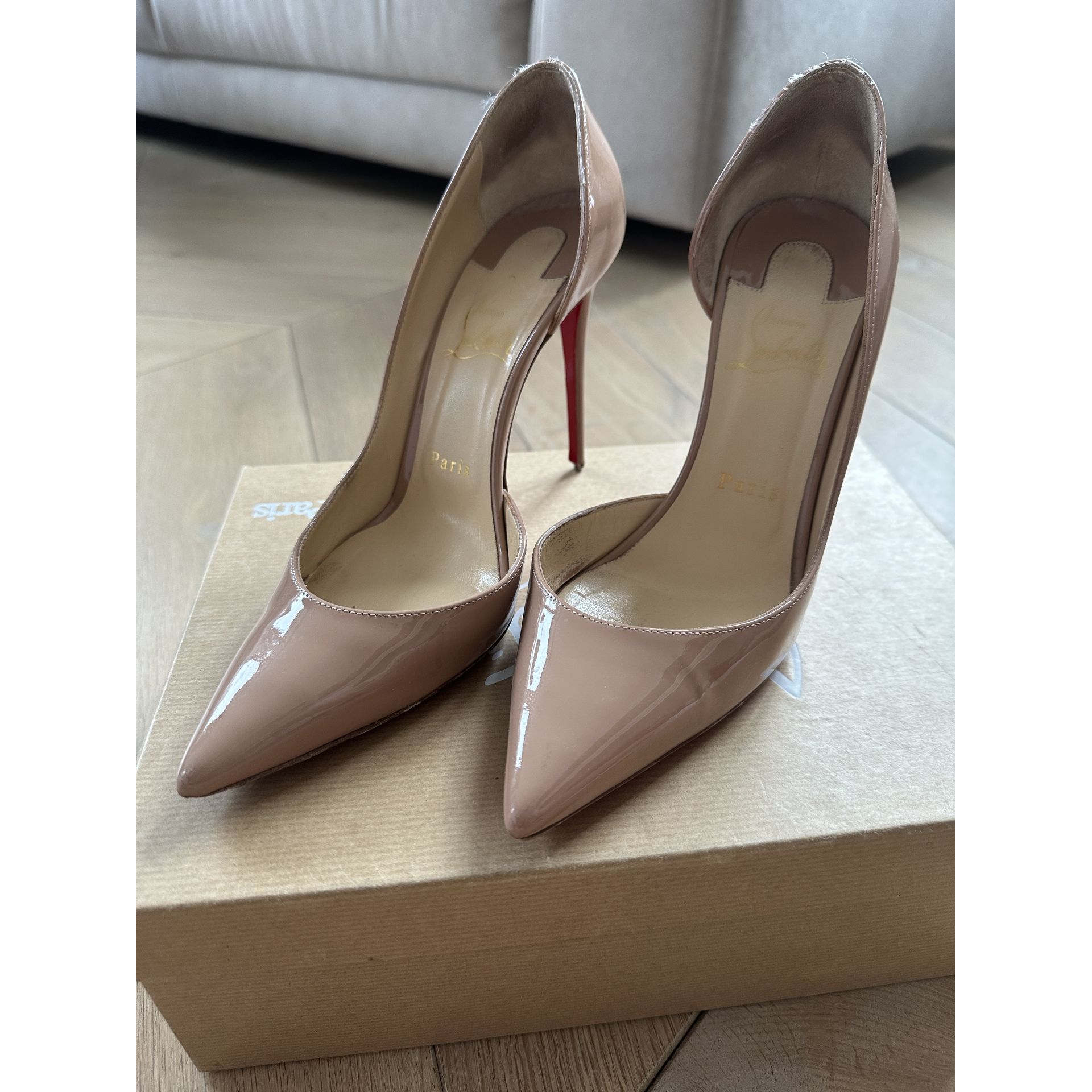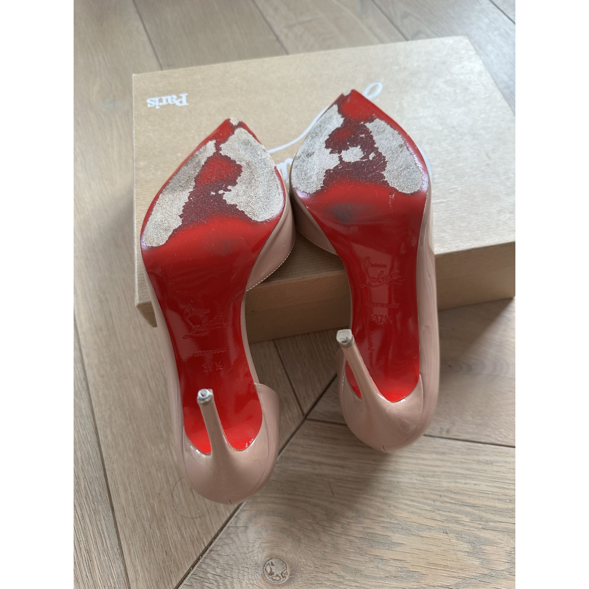 szpilki Iriza 100 w kolorze nude. Widoczne ślady użytkowania, na obcasie jedna końcówka wymaga wymiany (dołączam jedną zapasową).Proszę o przemyślane zakupy, ponieważ nie przyjmuję zwrotów.