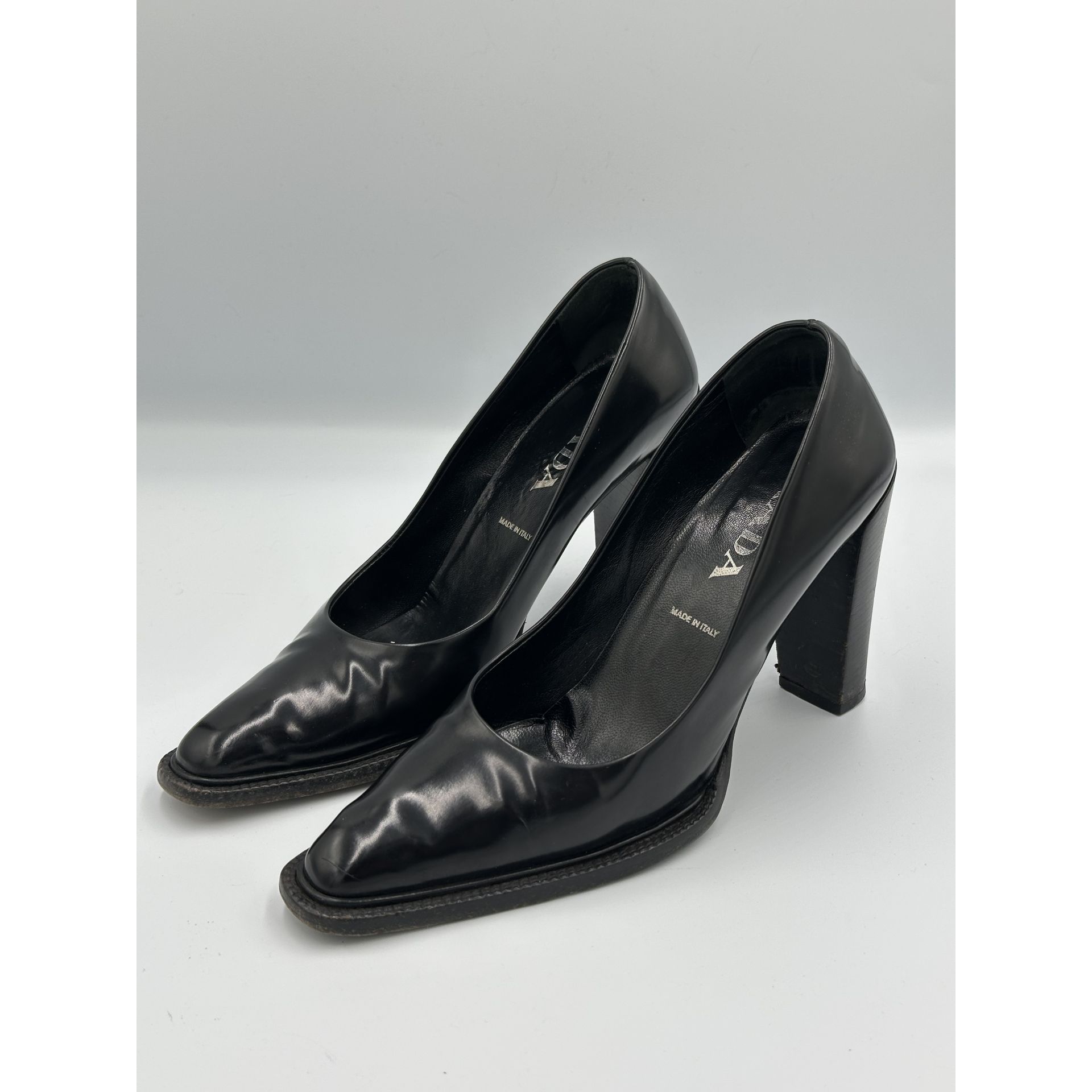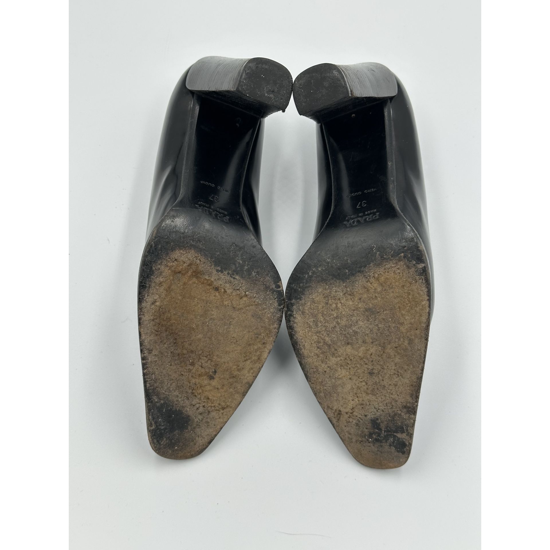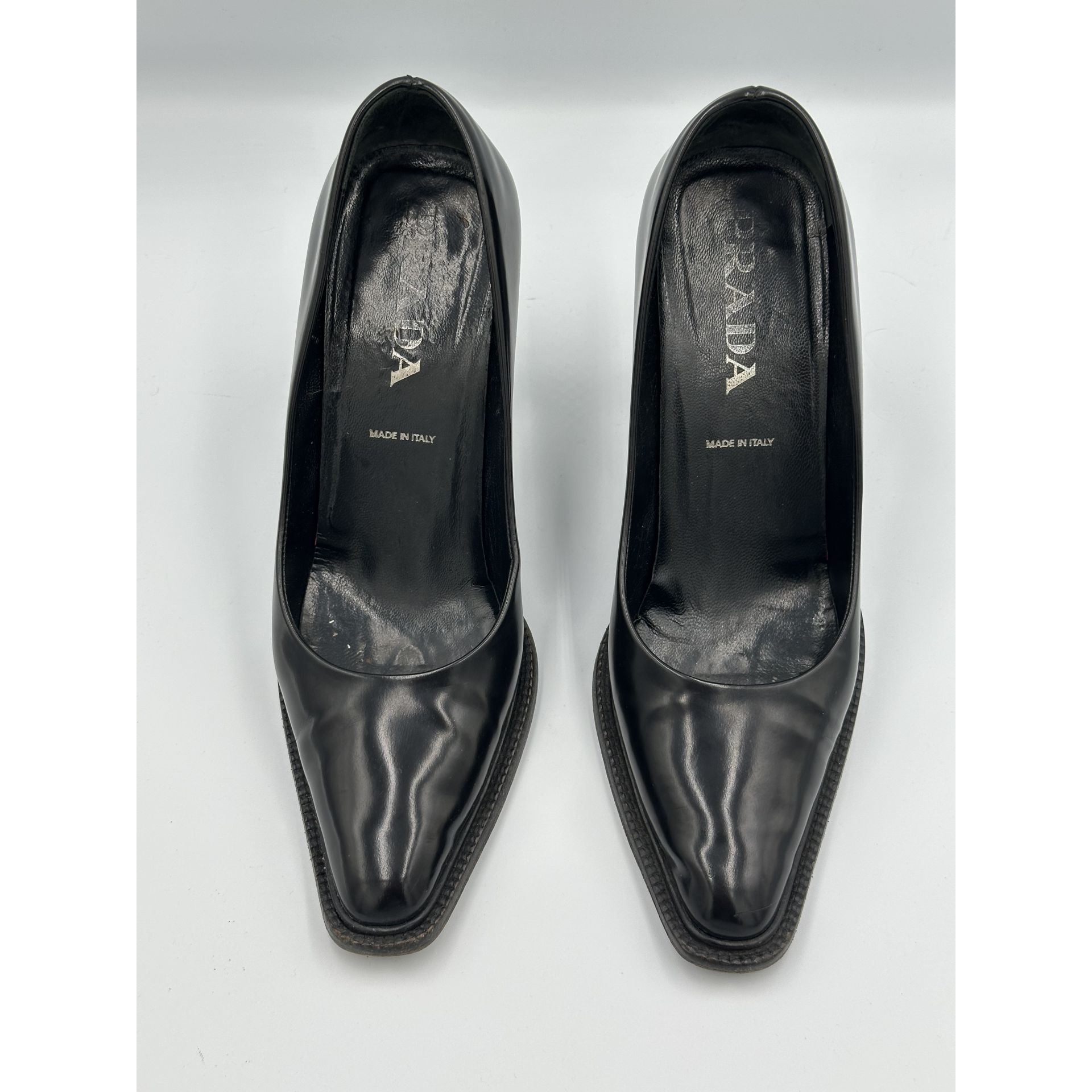 Klasyczne czółenka Prada z czarnej skóry, z wyraźnie zarysowanym kwadratowym noskiem, solidnym słupkowym obcasem oraz minimalistycznym włoskim designem, który tworzy ponadczasowy i elegancki wygląd.
