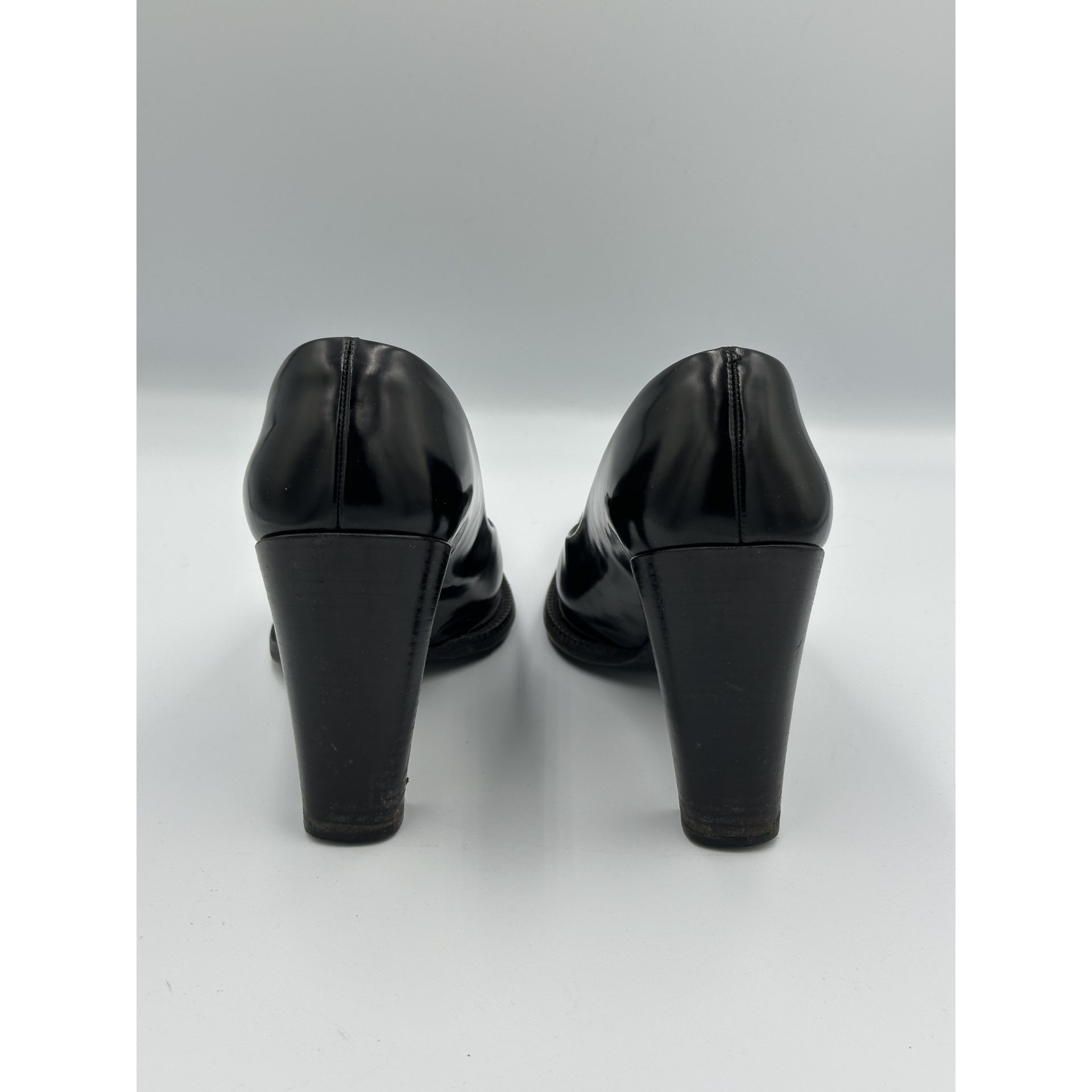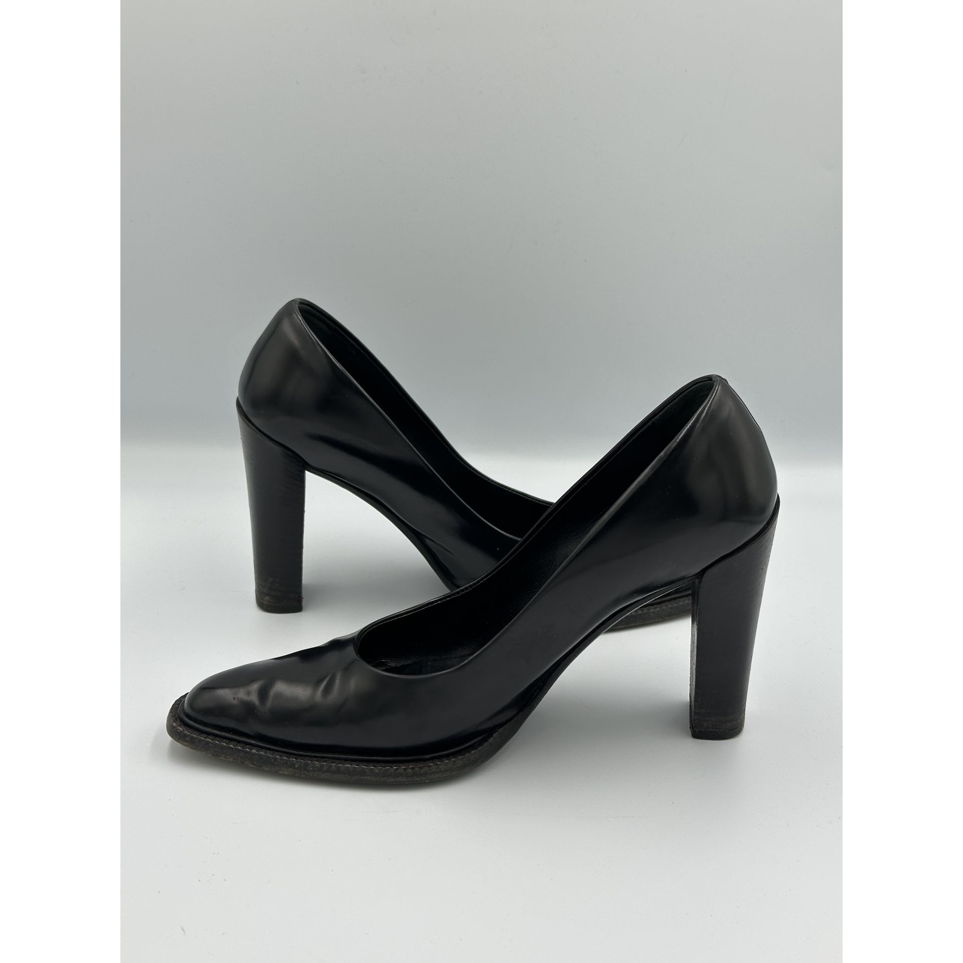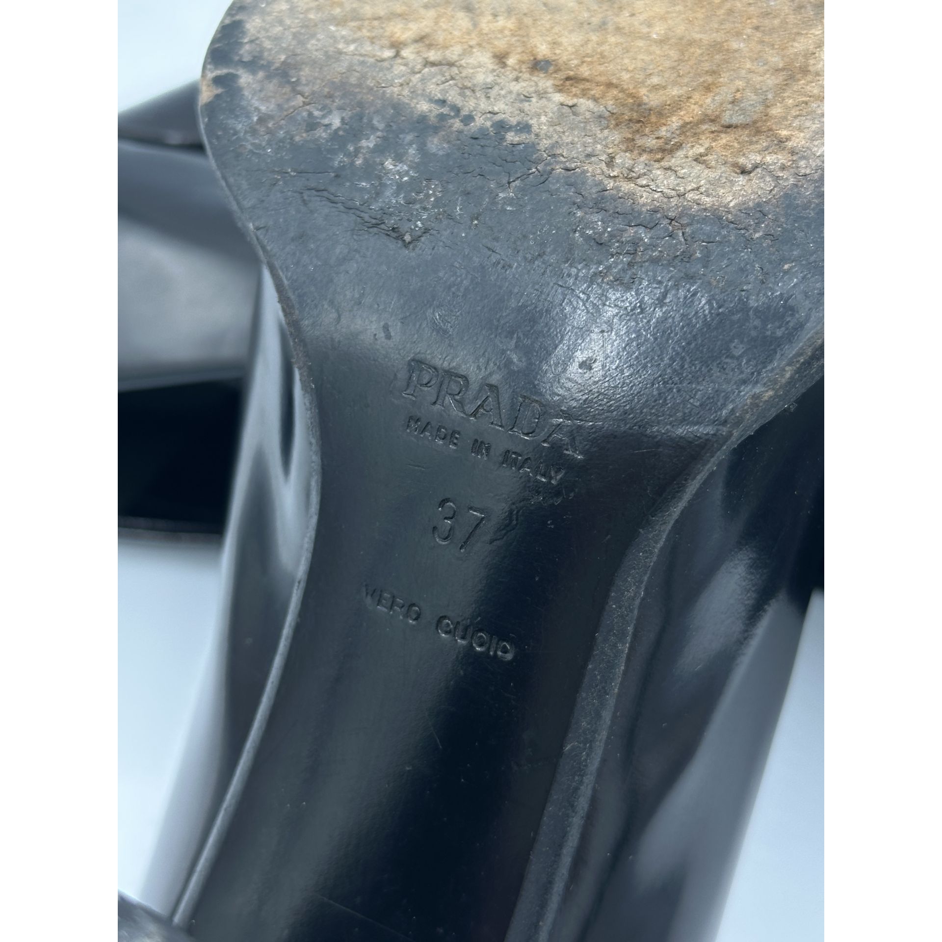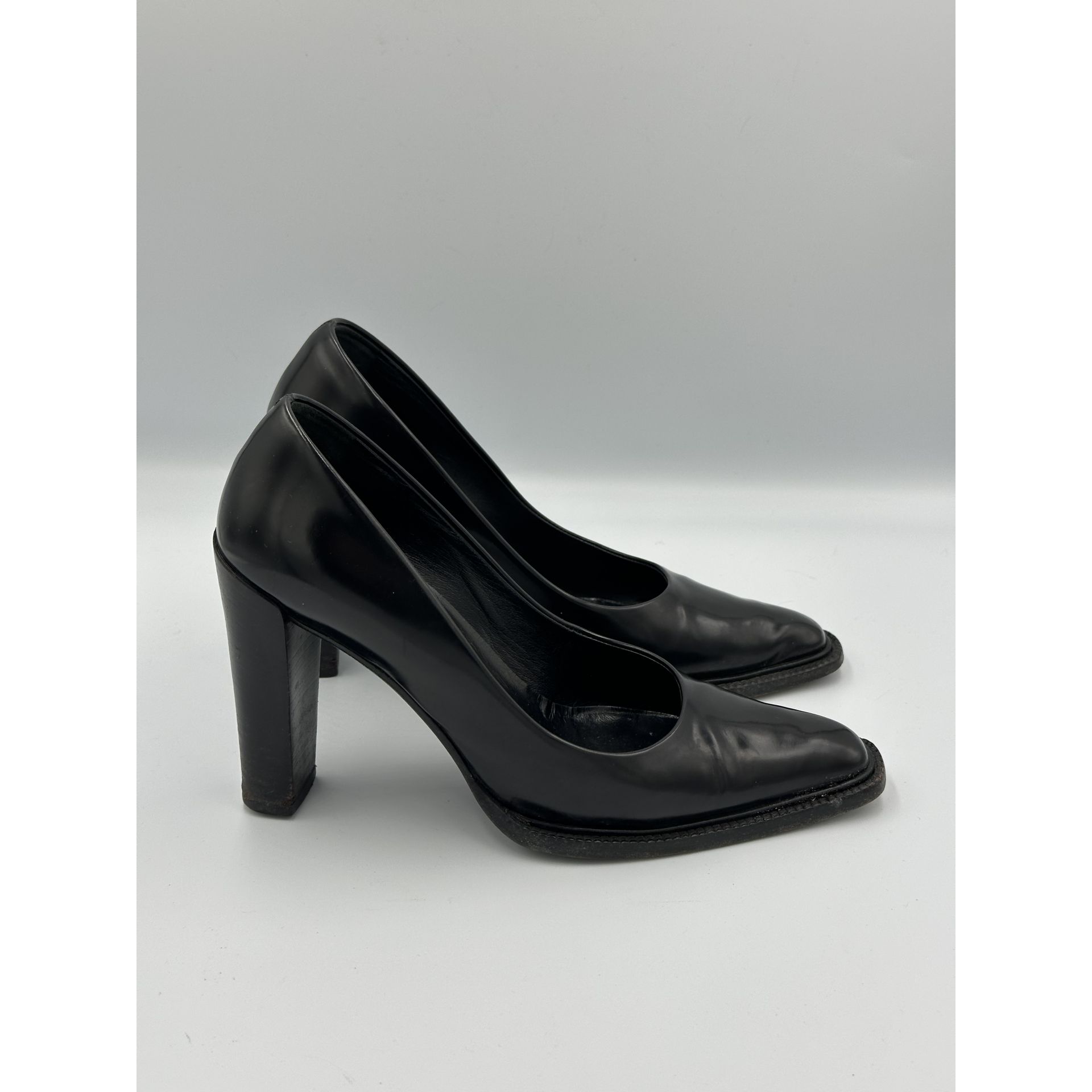 Klasyczne czółenka Prada z czarnej skóry, z wyraźnie zarysowanym kwadratowym noskiem, solidnym słupkowym obcasem oraz minimalistycznym włoskim designem, który tworzy ponadczasowy i elegancki wygląd.