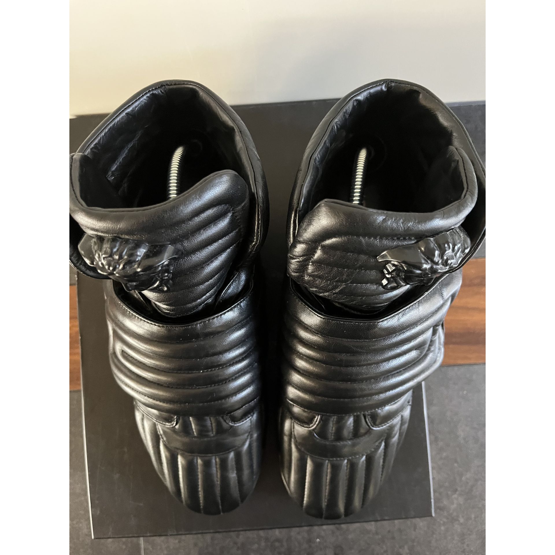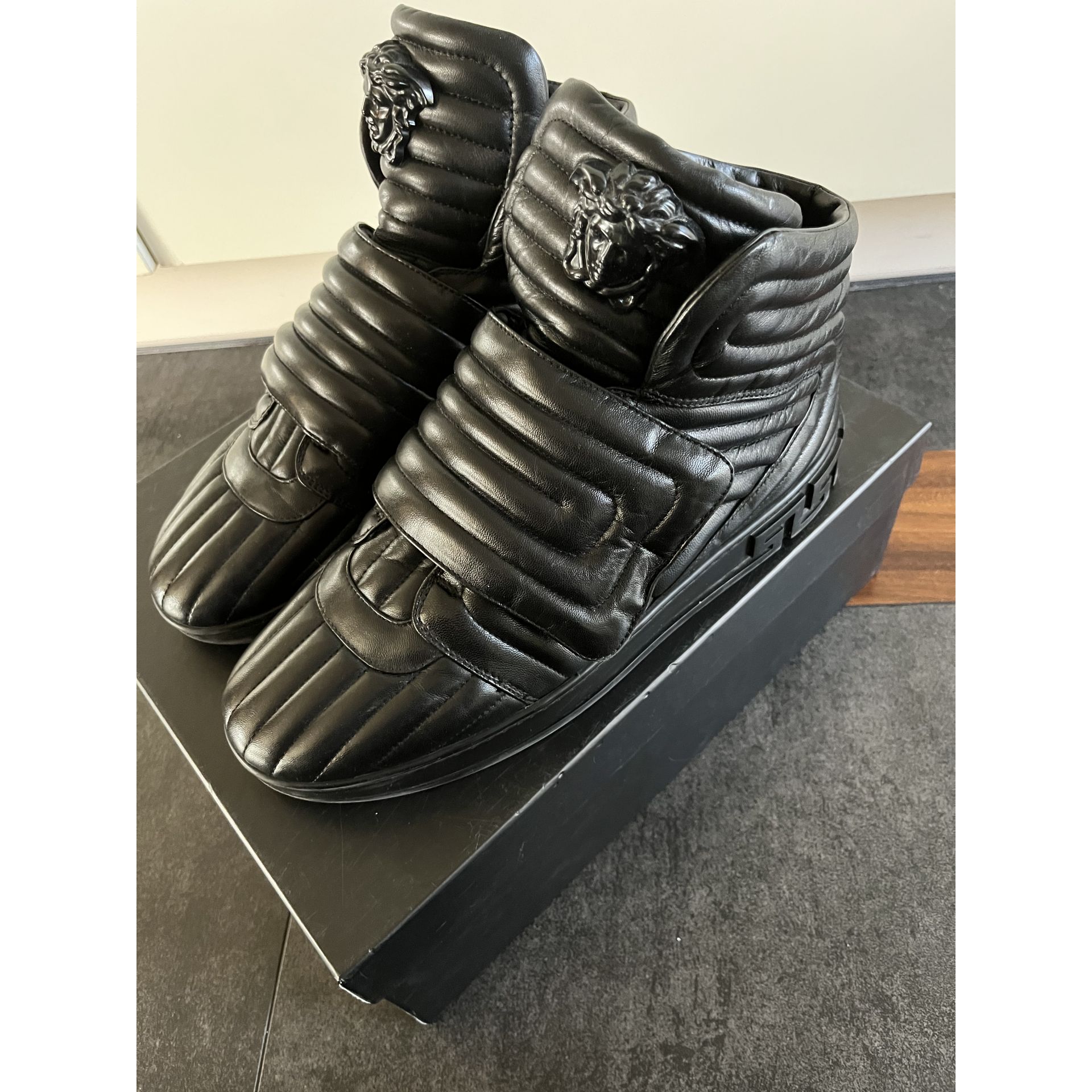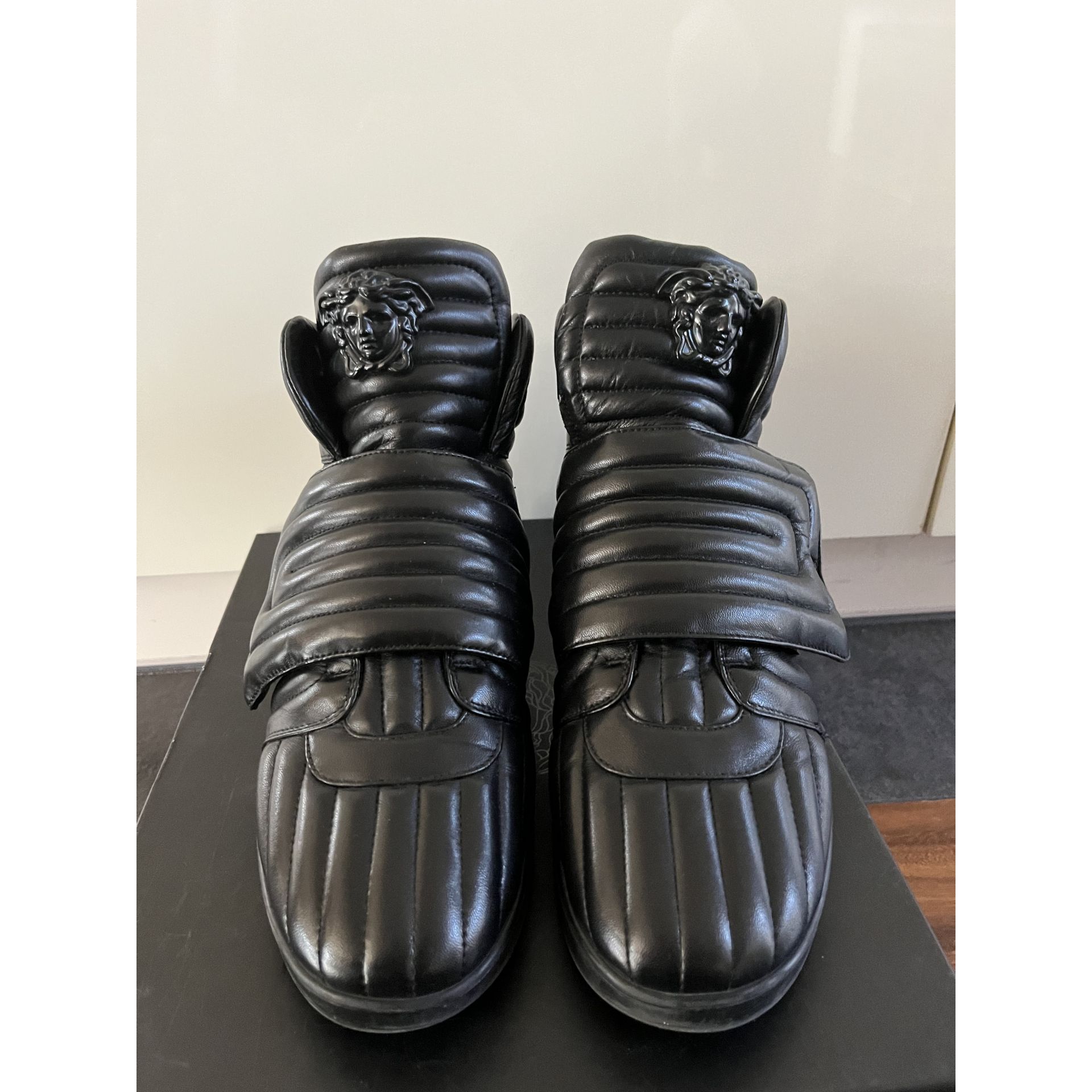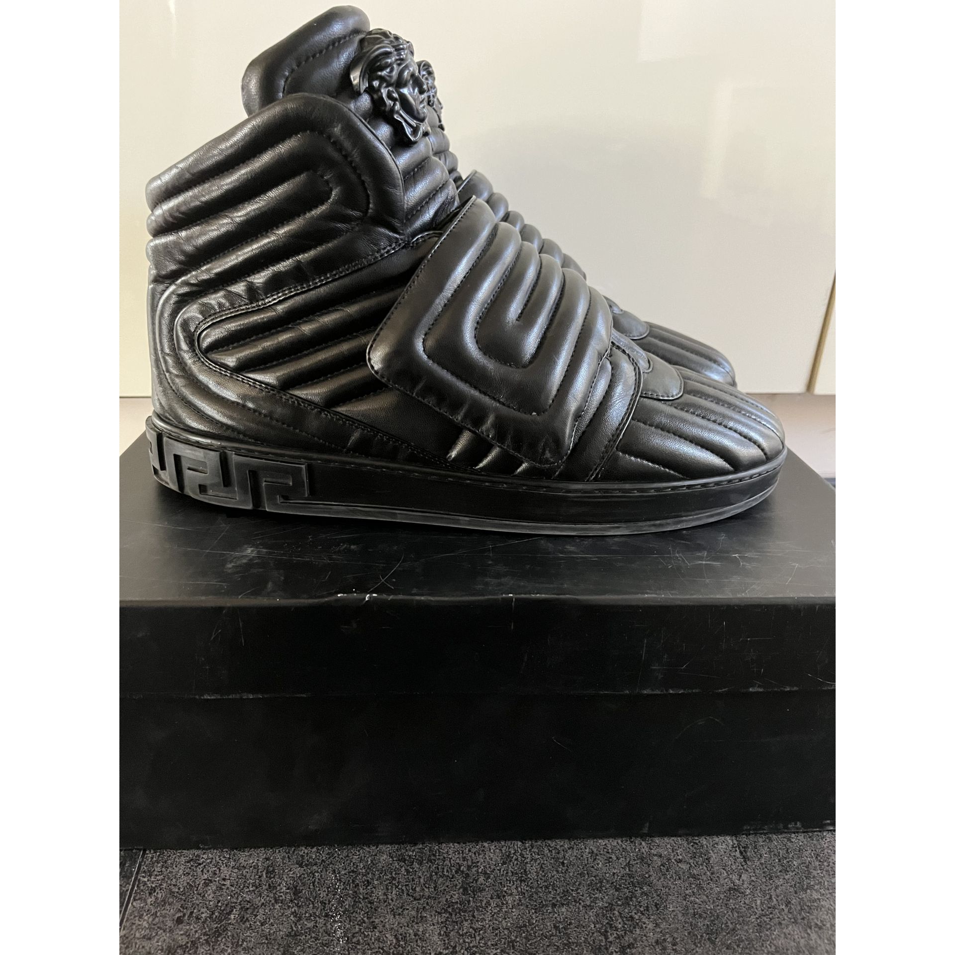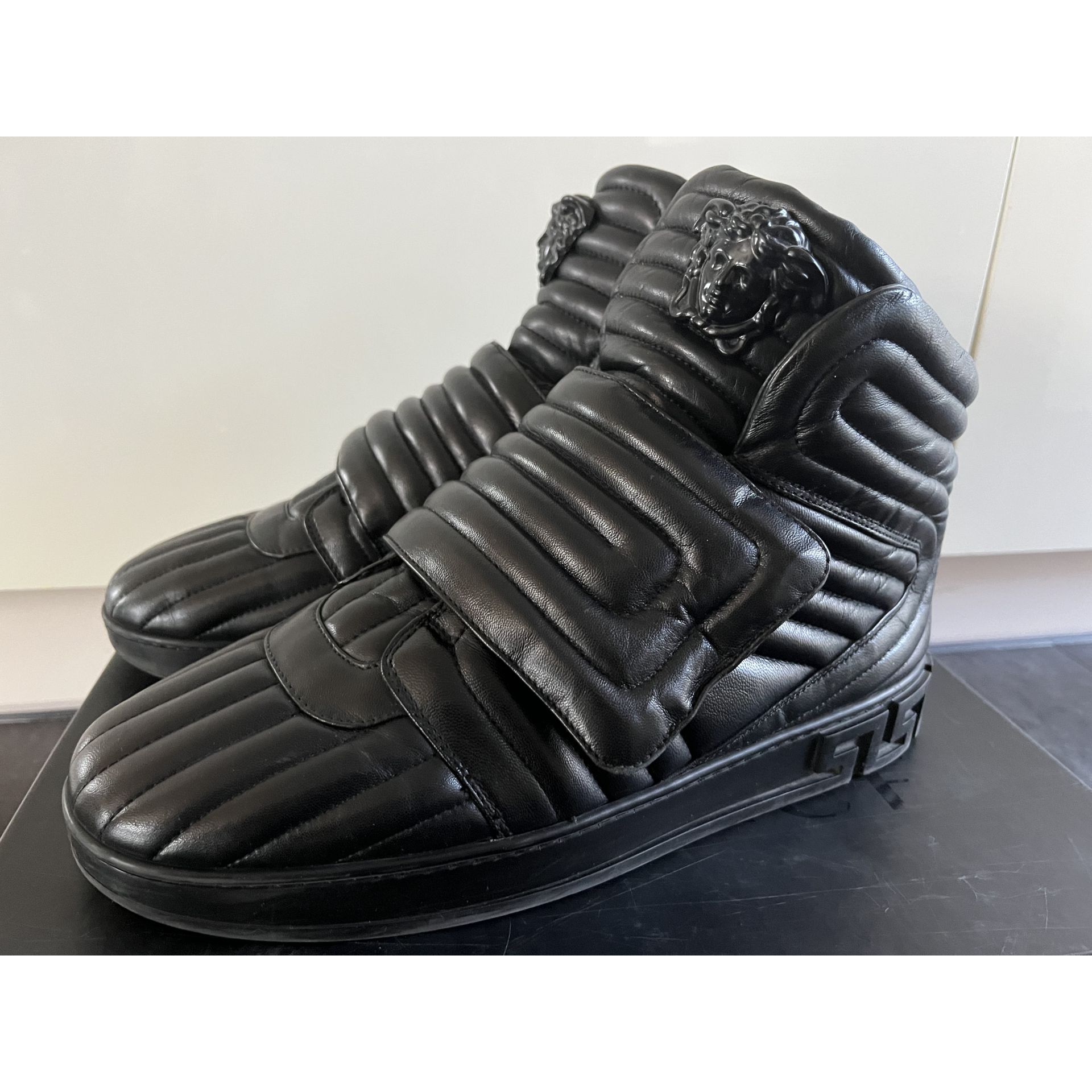 Czarne, pikowane buty sportowe za kostkę Versace. Wykonane ze skóry. Zapinane na rzep. Na języku metalowa, charakterystyczna dla marki głowa Meduzy w kolorze czarnym. Czarna, gumowa podeszwa z wytłoczonym greckim wzorem.