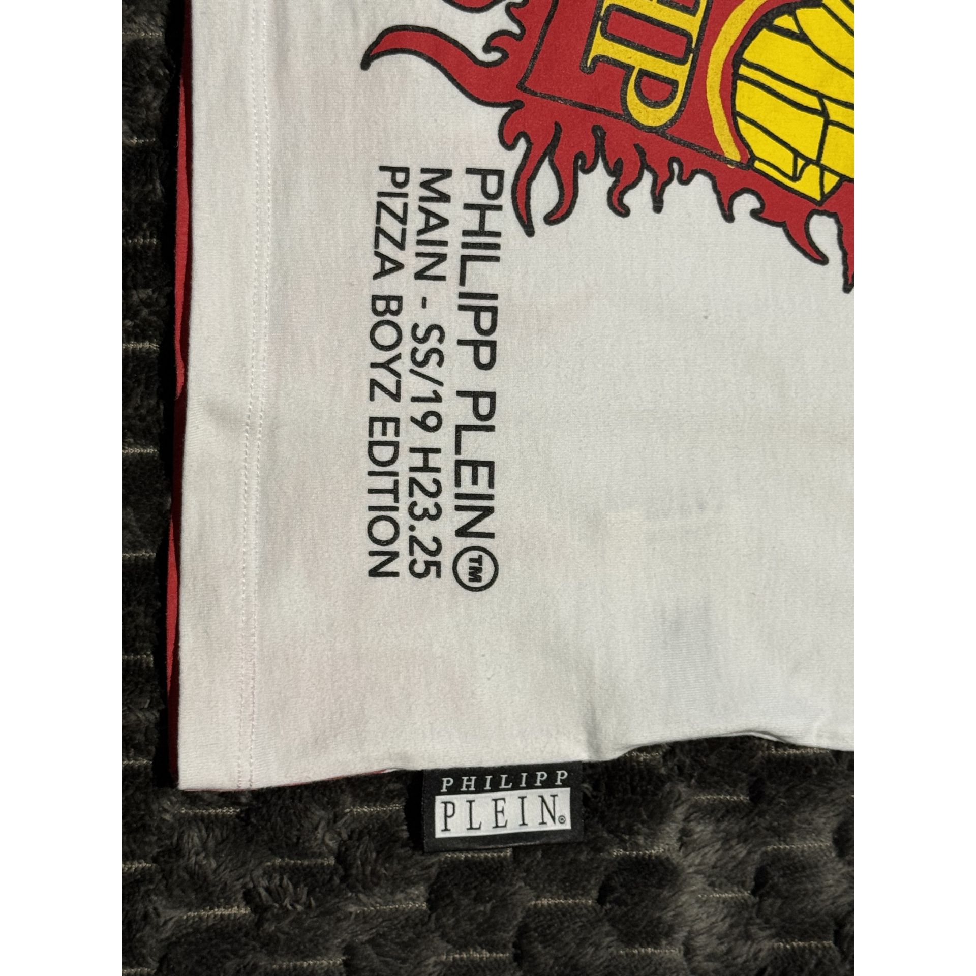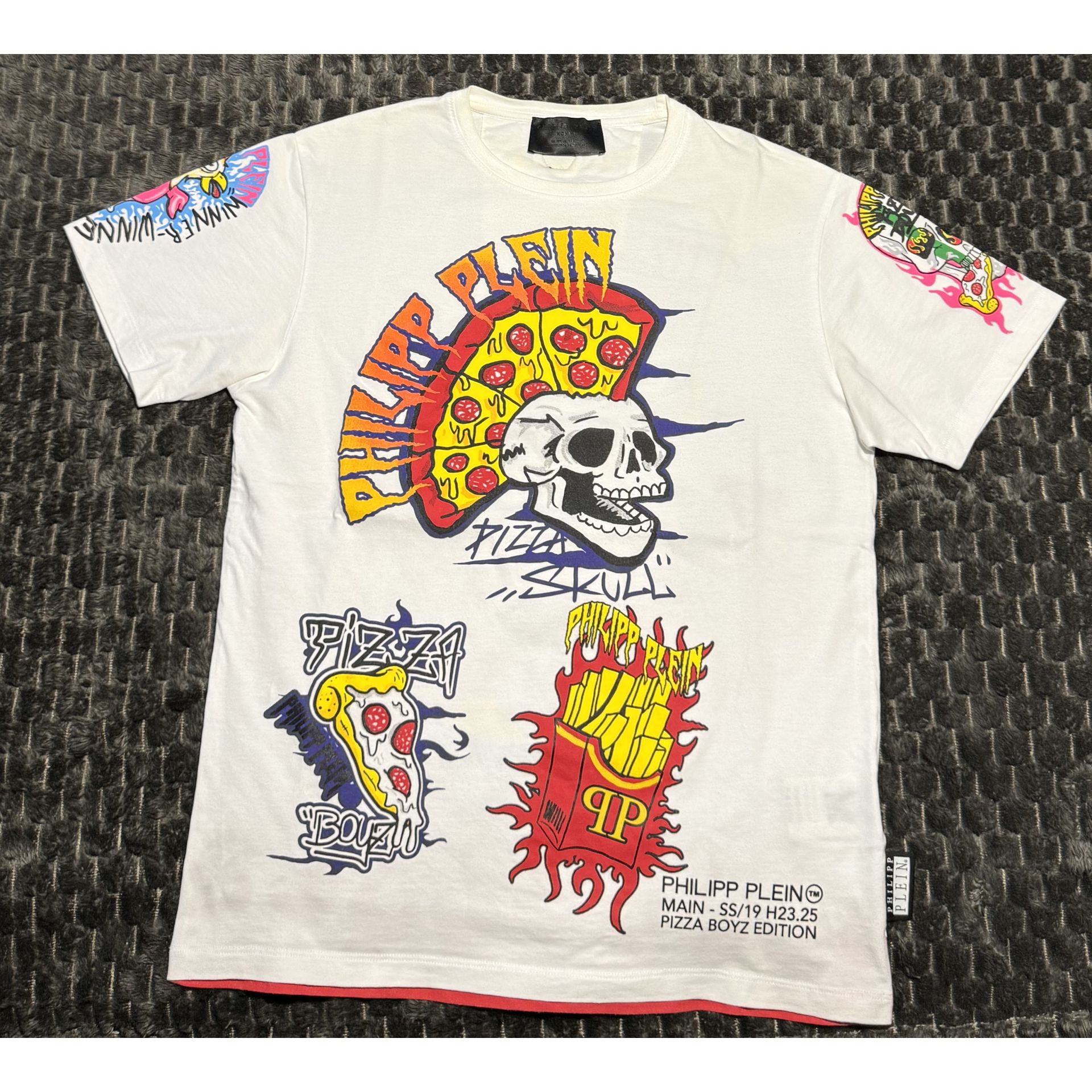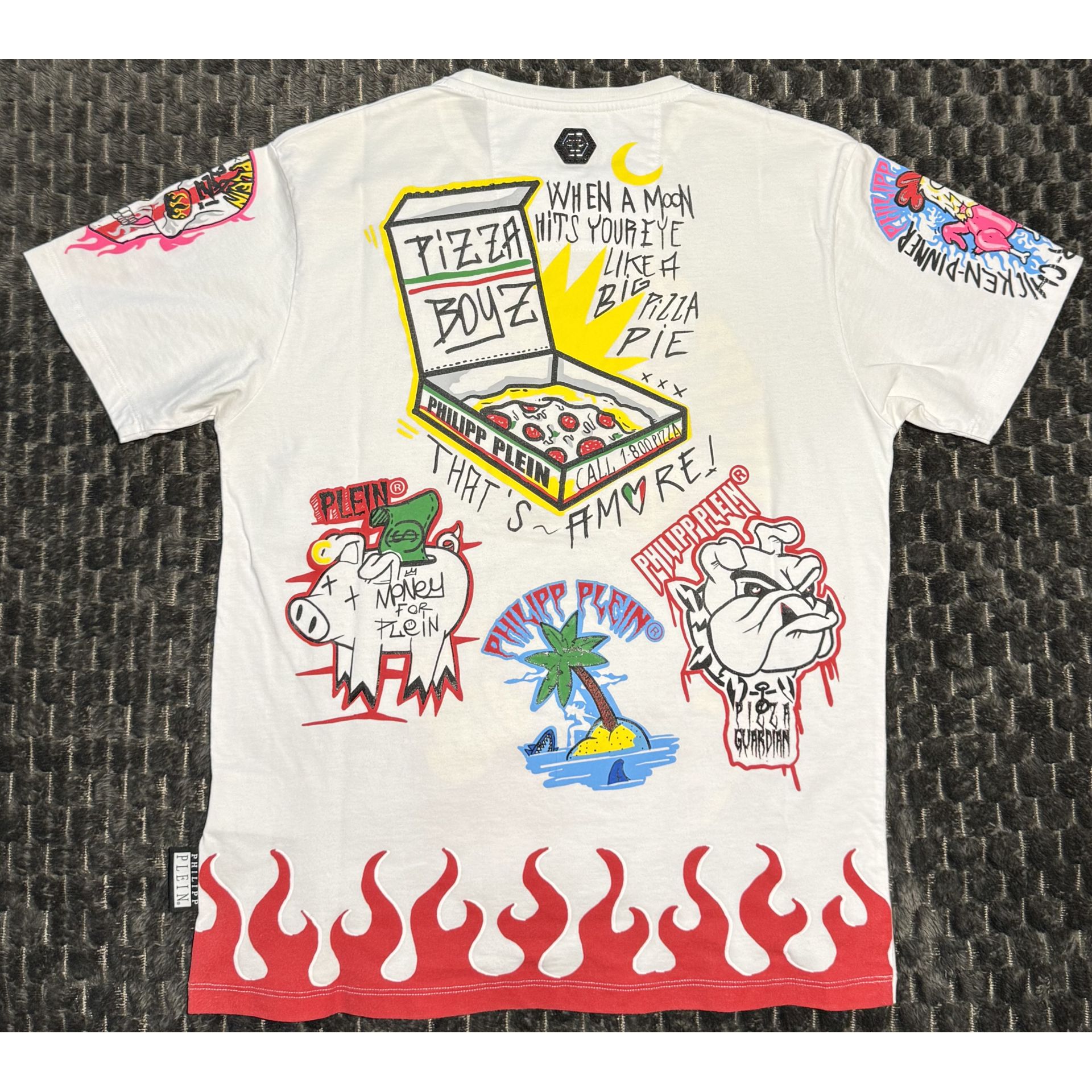 Phillip Plein Biały t-shirt z limitowanej kolekcji Pizza Boyz. Delikatne żółte ślady na kołnierzyku.