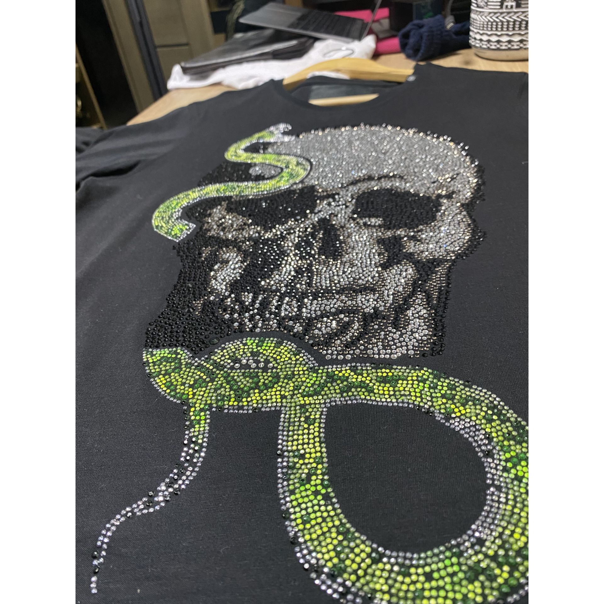 Sprzedam : T-shirt marki Philip Plein z motywem czaszki oraz węża z jetów oraz z logotypem marki na dole koszulki.