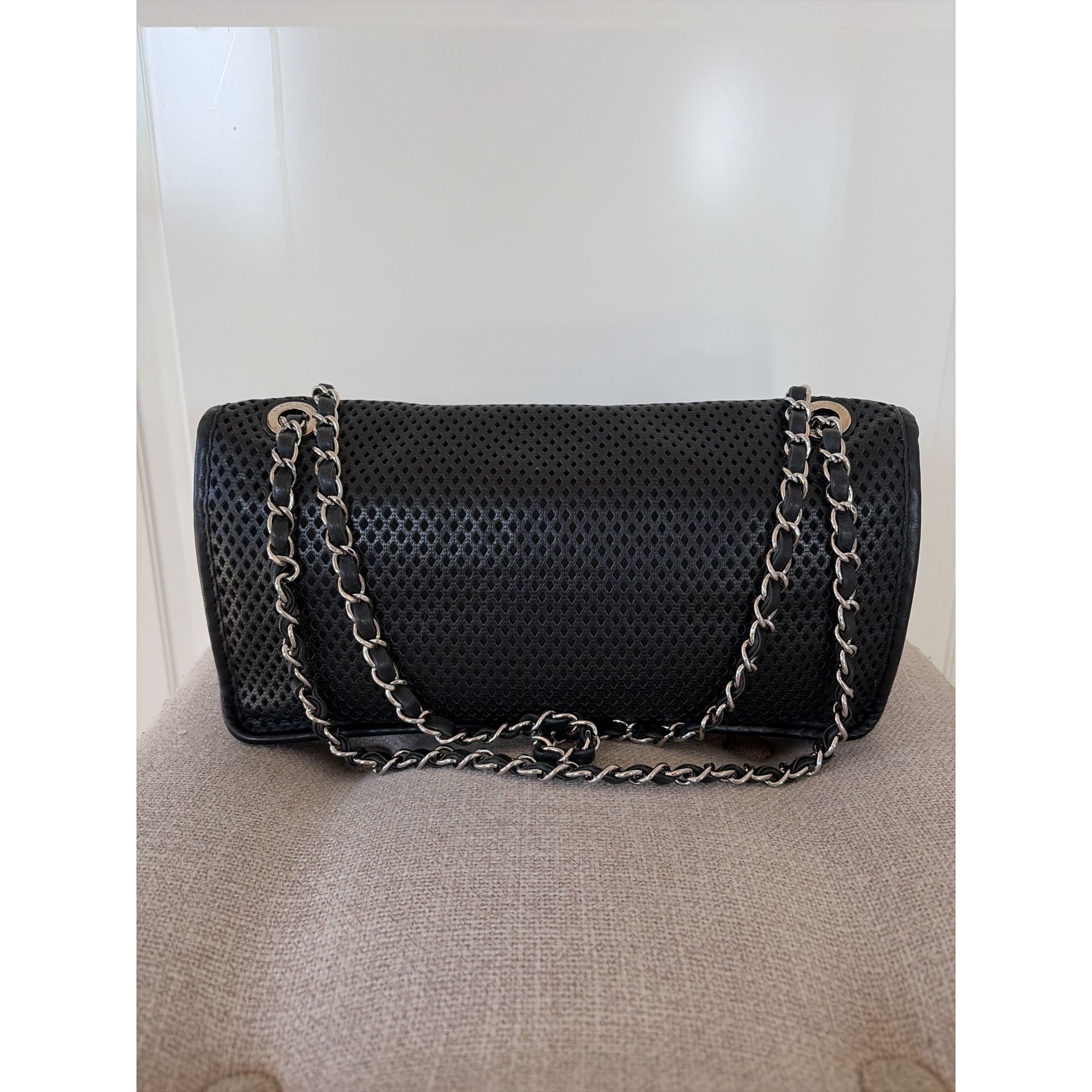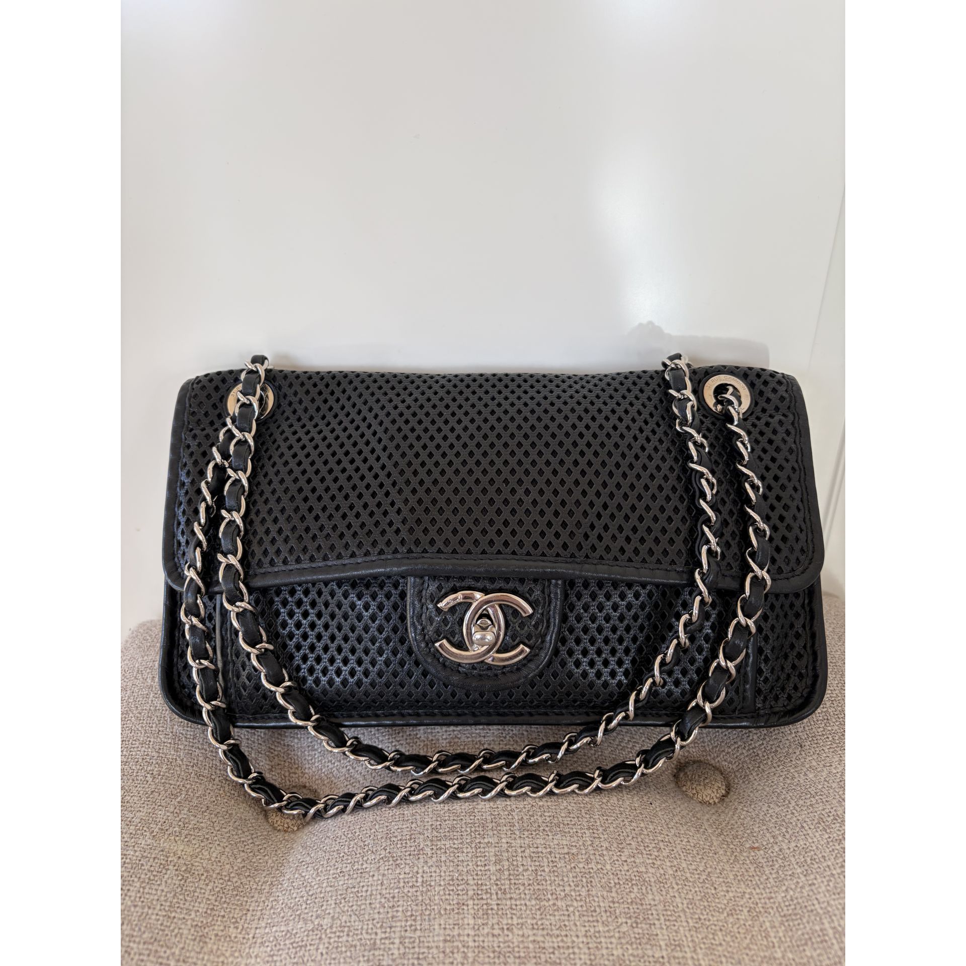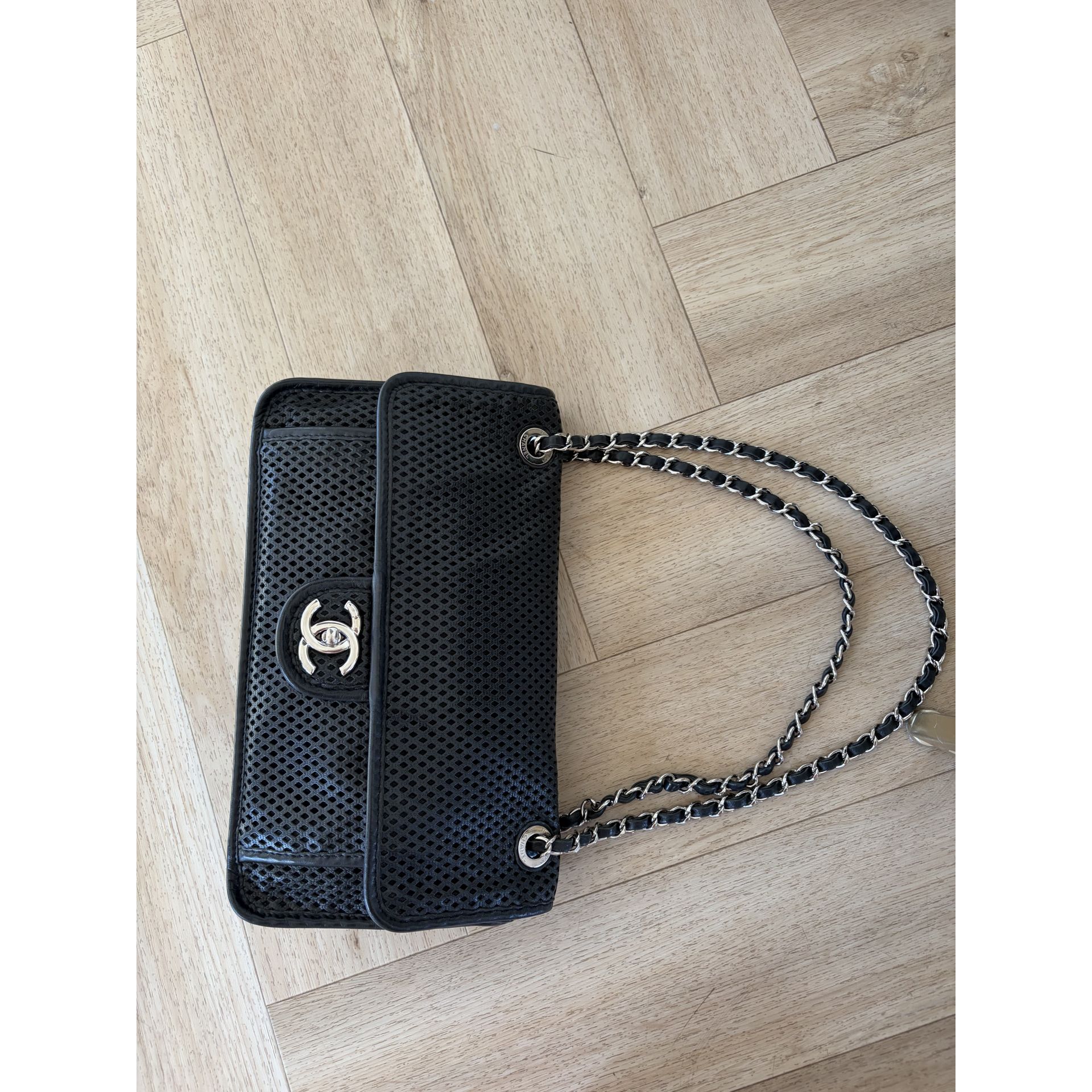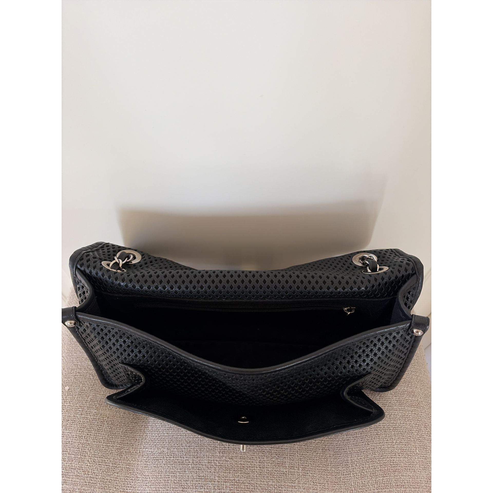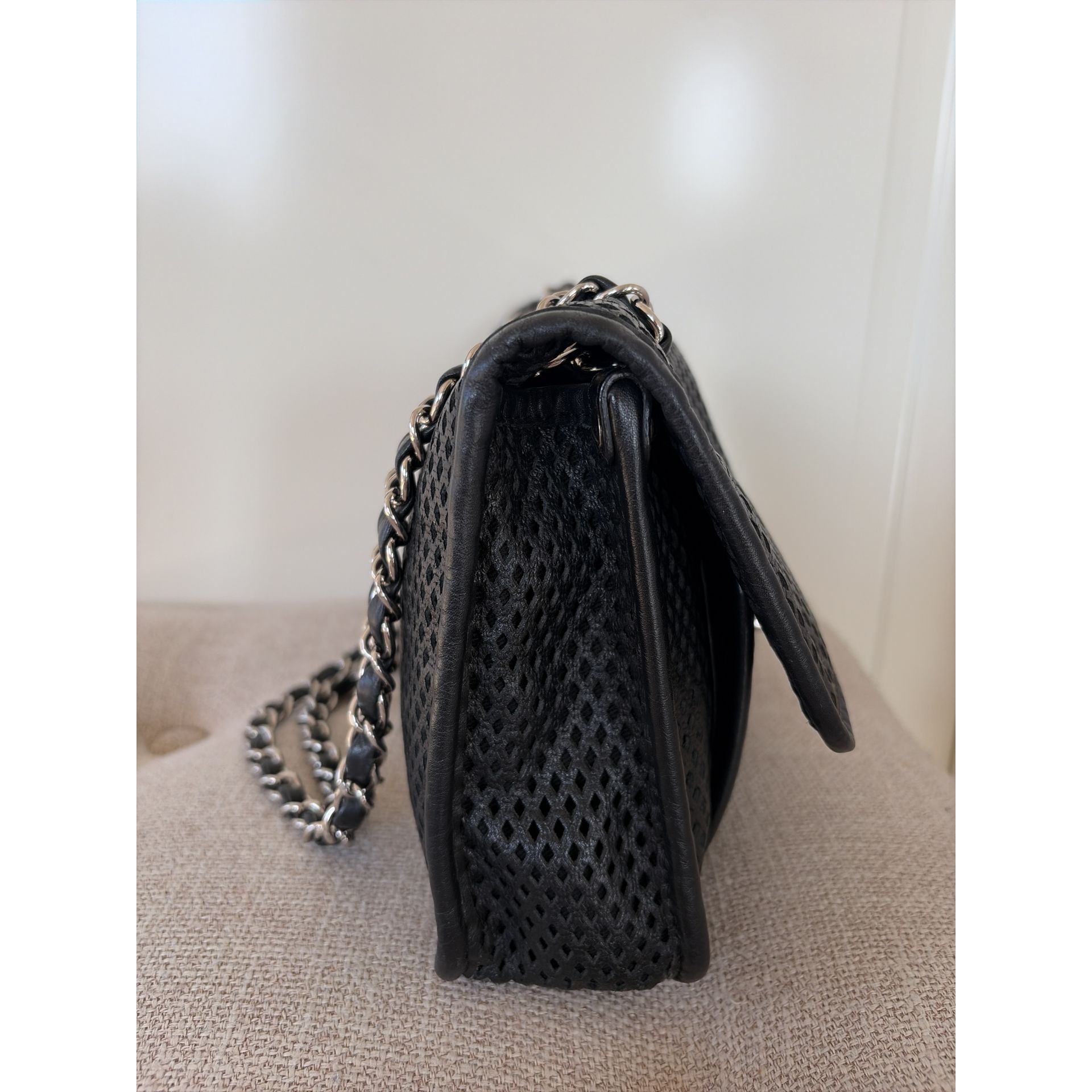 CHANEL Classic Flap – skóra perforowana, czarna, srebrne okucia