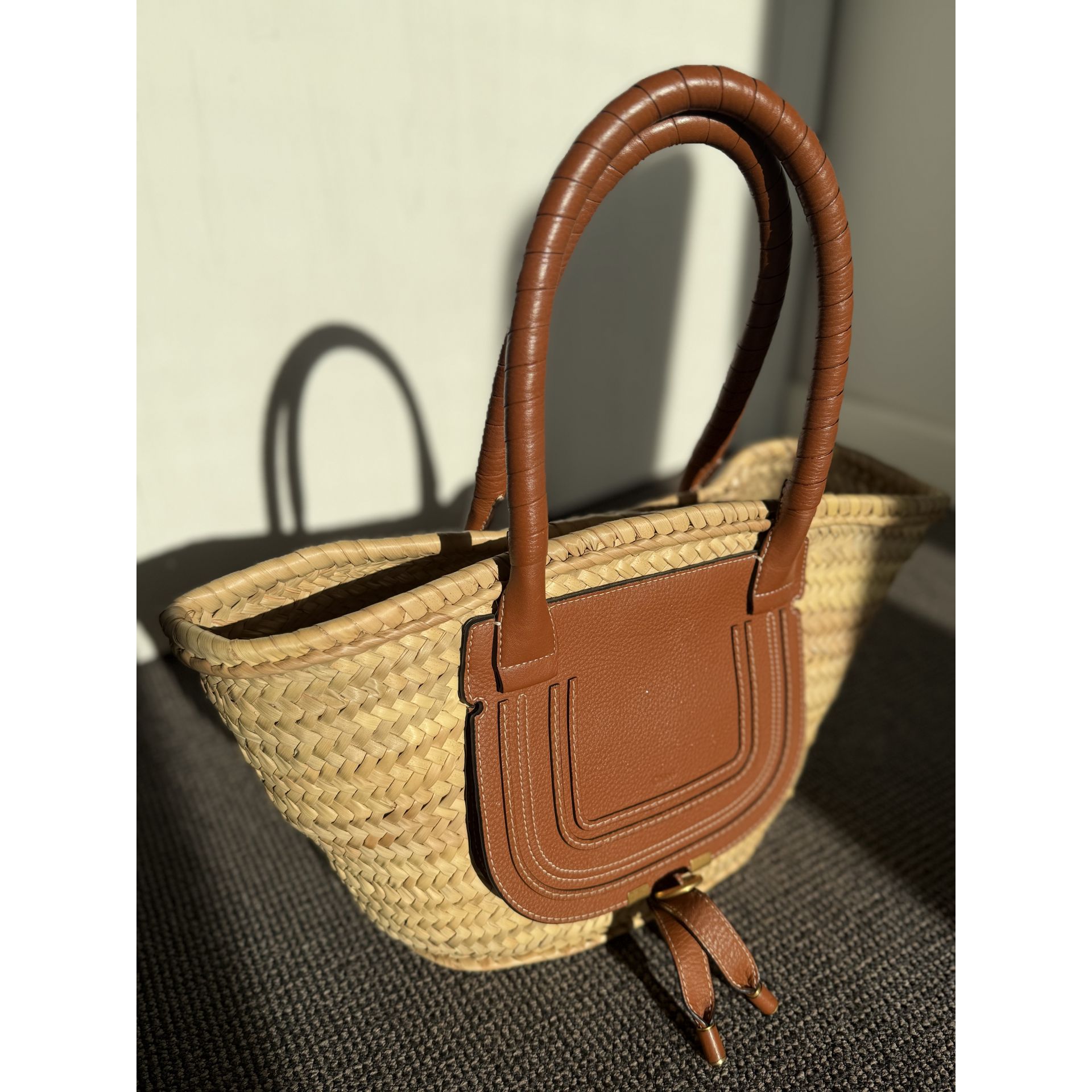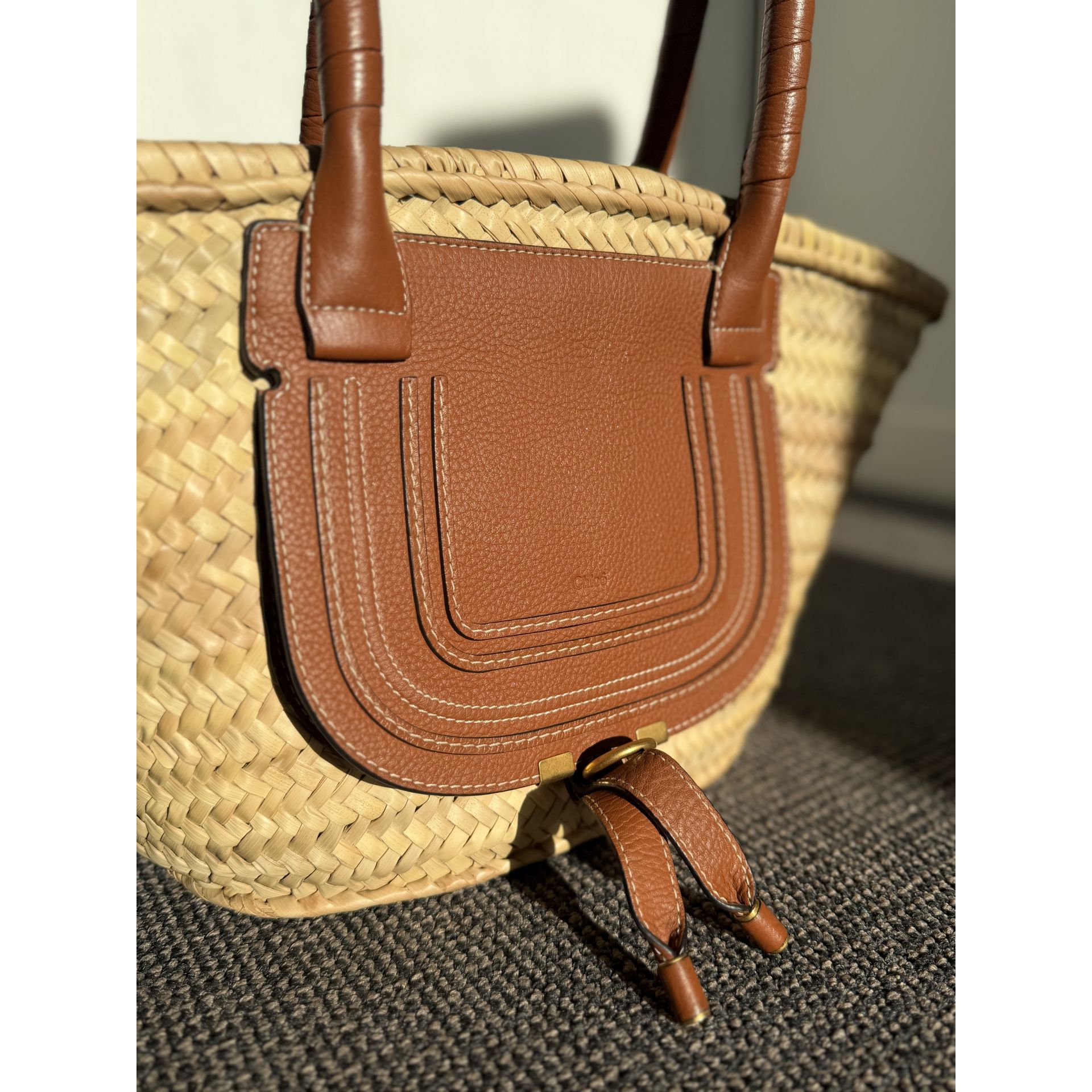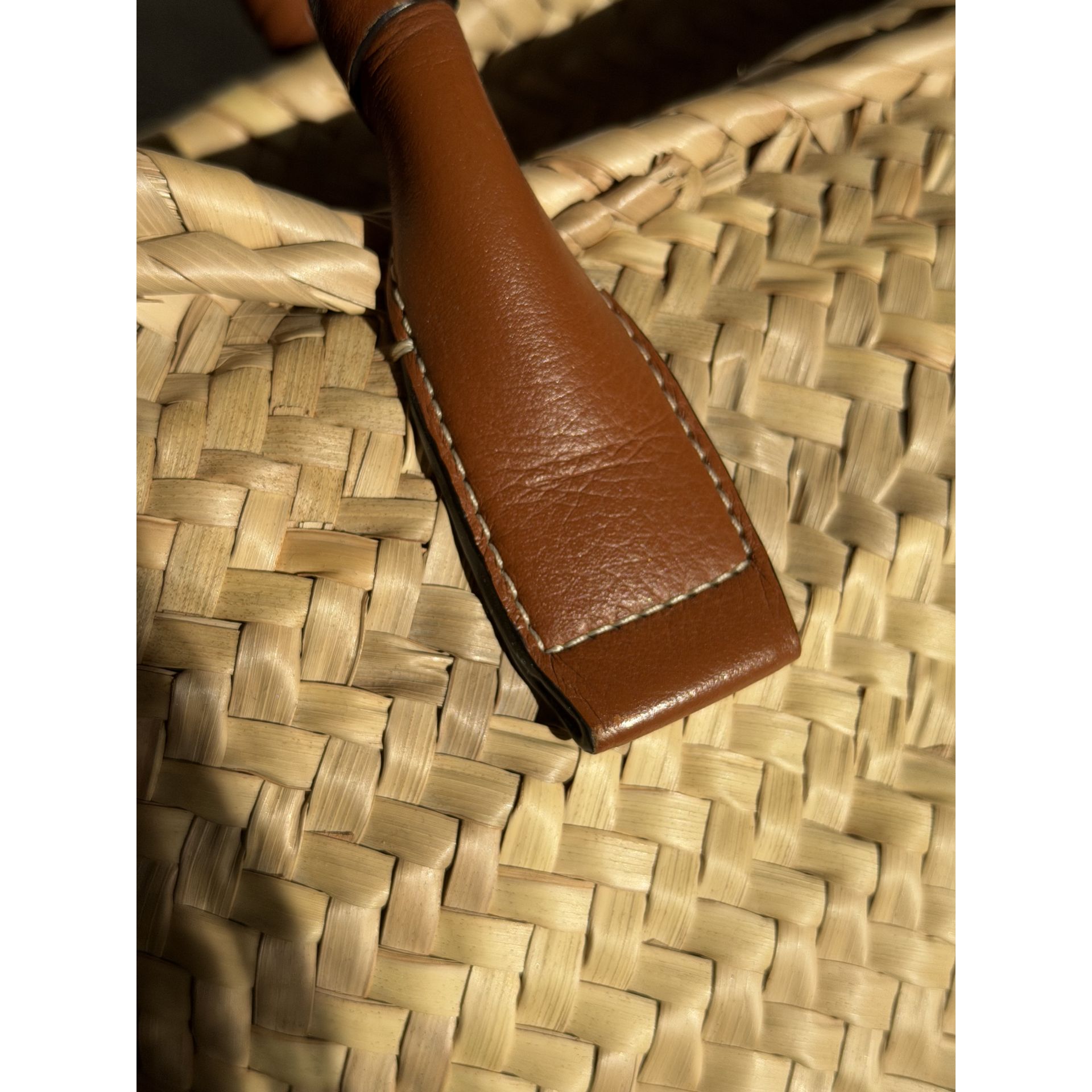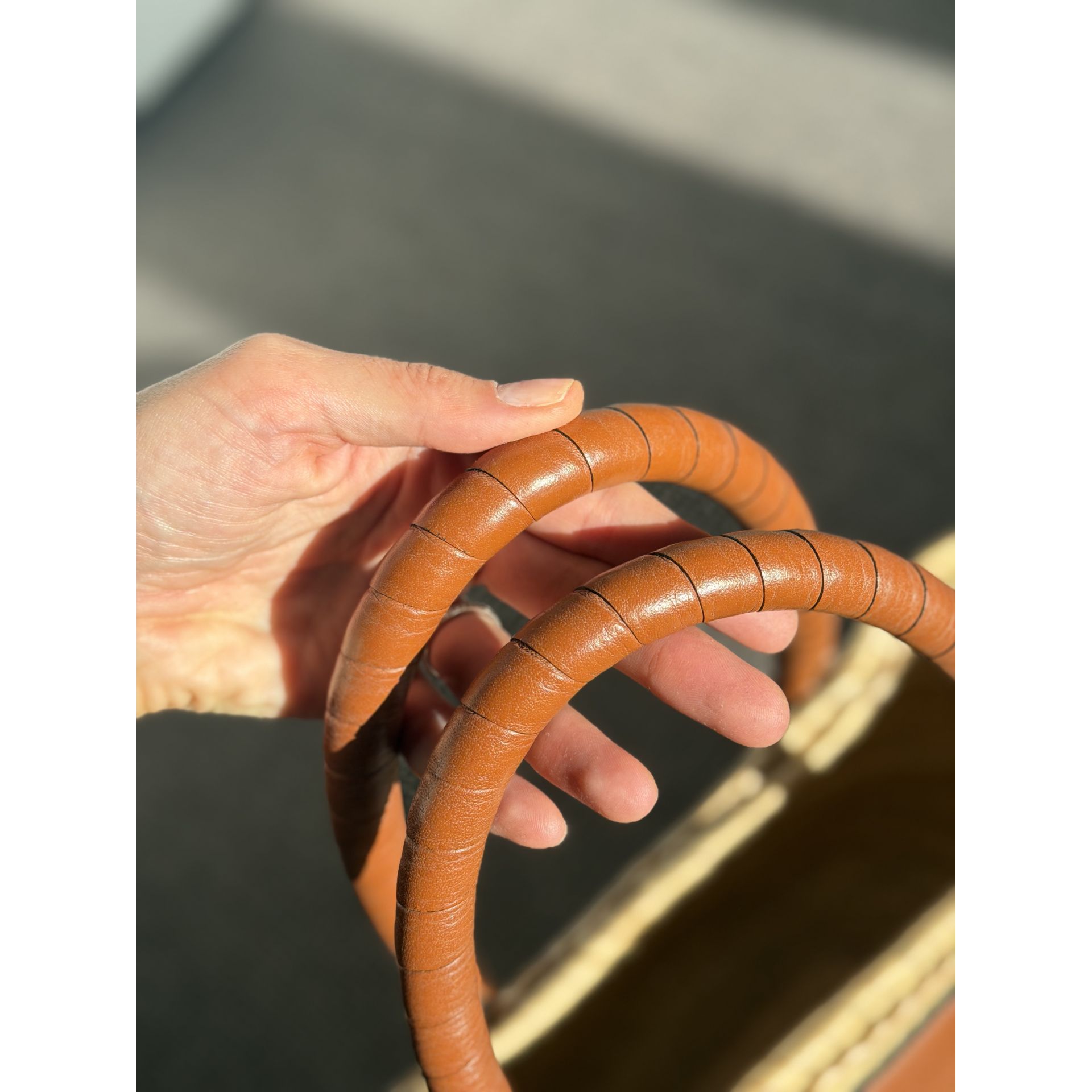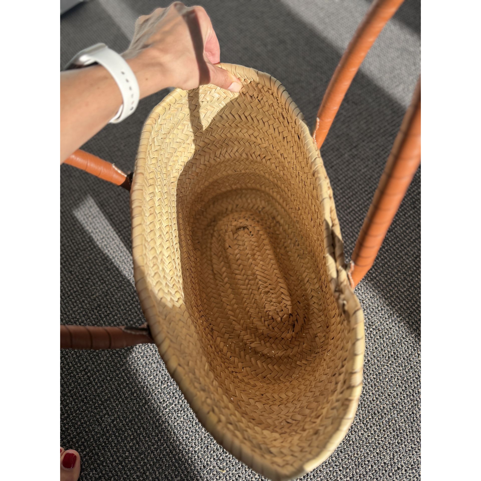 Koszyk wykonany z trawy - Chloe Marcie, brązowa skóra, rozmiar L (mieści A4). Ma jedno niewielkie przetarcie przy jednej rączce. Cały stan dokładnie widoczny jest na zdjęciu. Wewnątrz w kieszonce znajduje się kod QR oraz numer seryjny.